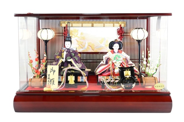 やわらかな灯りに包まれたガラスケースの中で、優美な姿をたたえる親王飾りです。 金襴を用いた気品ある衣装には繊細な文様が浮かび上がり、上品な輝きを添えています。お殿様は深みのある紫の房飾りが凛とした印象を、 お姫様はやわらかなゴールドと淡い色合いの重ねが、可憐さと華やかさを同時に演出します。 背景には上質感のあるタイル調の屏風を配し、中央には淡い色合いの桜がそっと咲き誇ります。柔らかな光を受けて桜がほんのりと照らされ、ひな人形の美しさをより際立たせてくれる飾りです。 コンパクトながら落ち着いた気品が漂い、リビングにも和室にも自然と馴染む一品。初節句のお祝いはもちろん、ご家族の節目をやさしく彩るお飾りとしておすすめです。 ※ケースに内蔵されたライトは電源プラグをコンセントに挿すと点灯します。 <サイズ> 間口47cm × 奥行29cm × 高さ30㎝ <オンラインショップ限定ご購入特典> 御被布・お手入れセット(毛ばたき・白手袋・クロス)・オルゴール付写真立て 〈商品について〉 商品画像はなるべく忠実に撮影しておりますが、室内光源環境やお使いのモニター等によって色味が変わる場合がございます。(例:塗りの濃淡や生地の色合いなど) ご了承の程、お願い致します。 ※贈答品として贈られるお客様が多いため、弊社では金額などを明記した「納品書」を添付致しておりません。ご希望の方は備考欄に「納品書希望」と明記してください。 _____________________ 〈キーワード〉 お雛様 雛人形 収納飾り コンパクト モダン おしゃれ かわいい ナチュラル おひな様 丸顔 人気商品 造花 桃の節句 インテリア ひなまつり 木目台