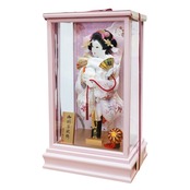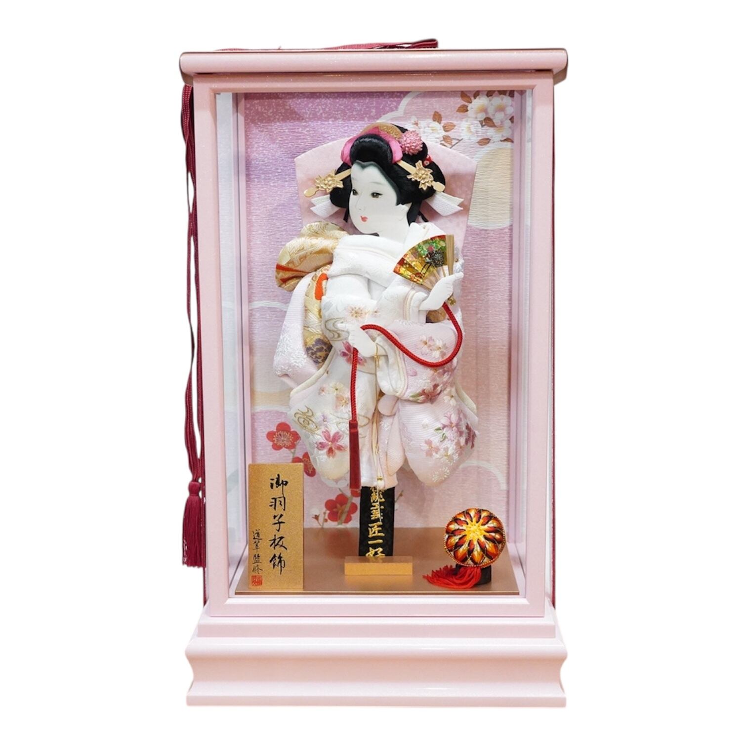 白とピンクを基調とした華やかな衣裳に、手にした扇が雅な美しさを際立たせます。