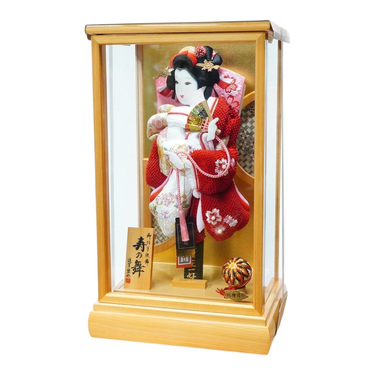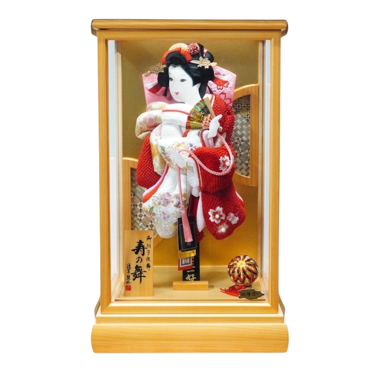 赤や白を基調とした華やかな衣裳には、吉祥文様が丁寧に施され、お顔立ちと相まって優美な姿が際立つ仕上がりです。