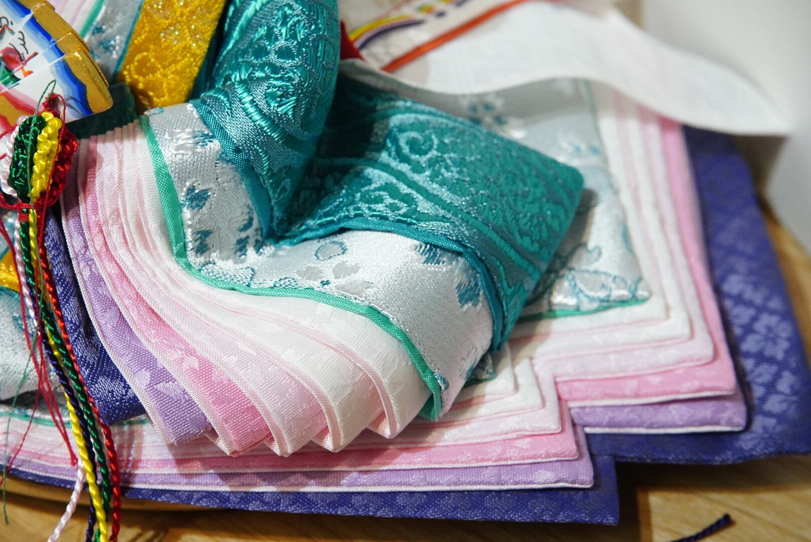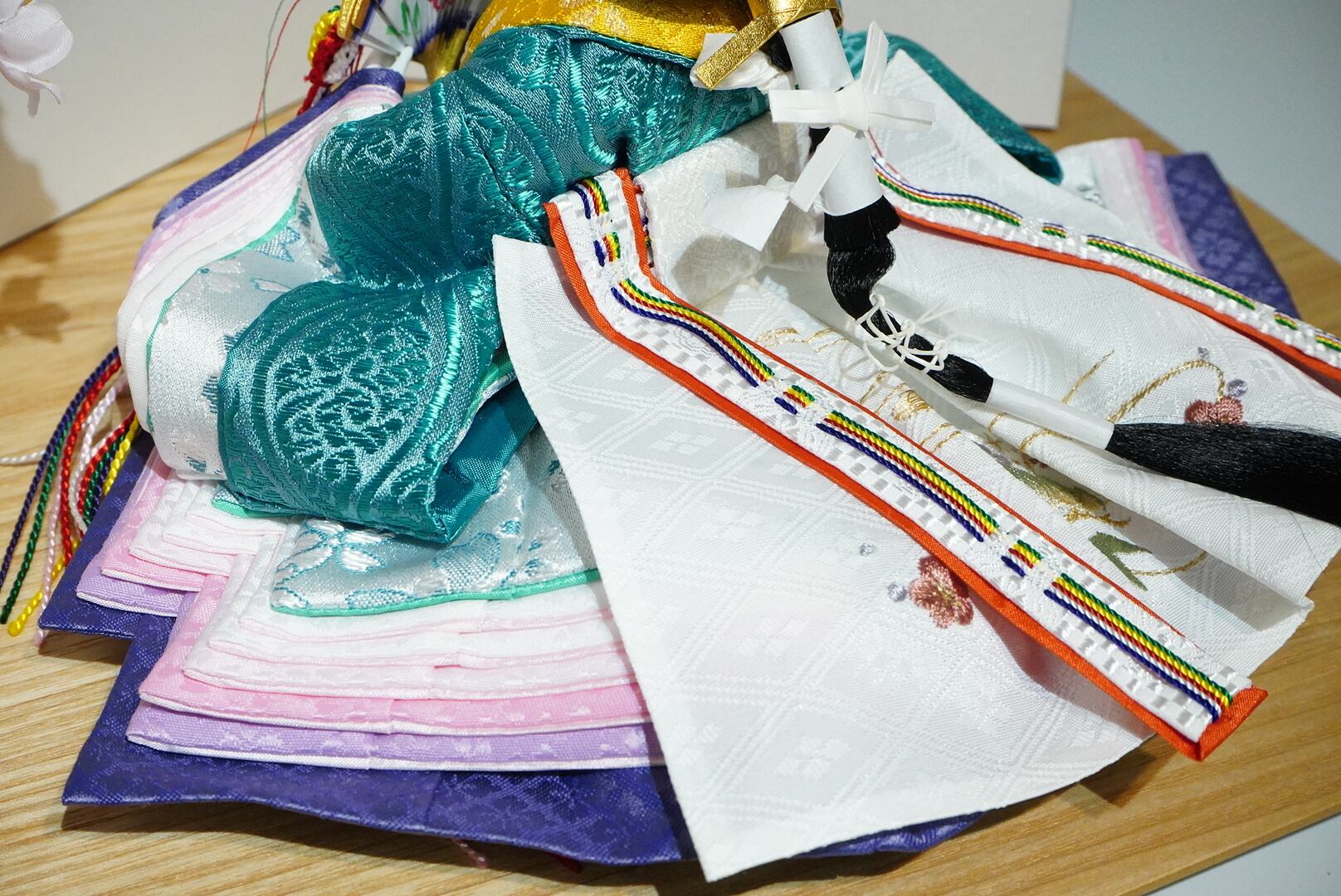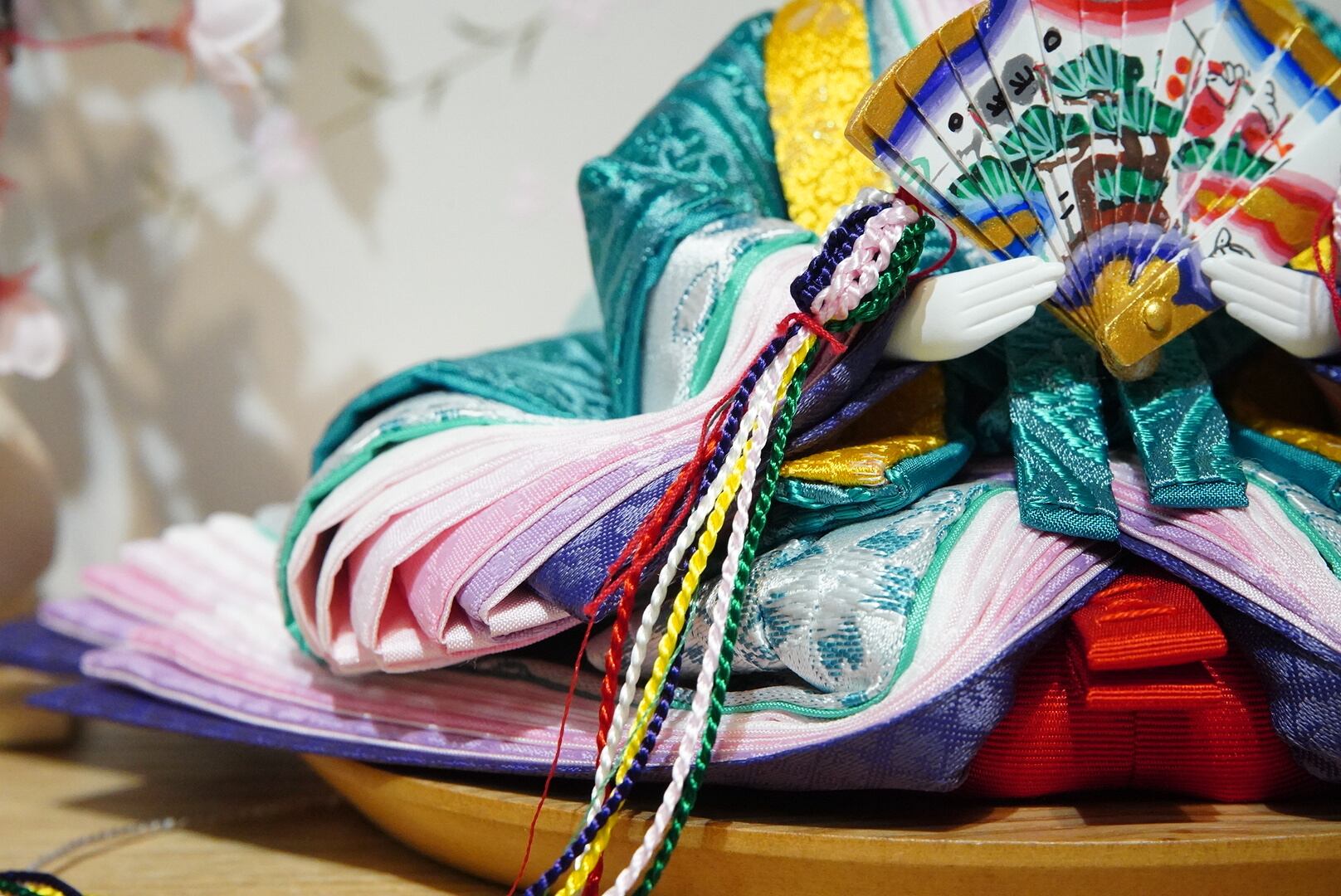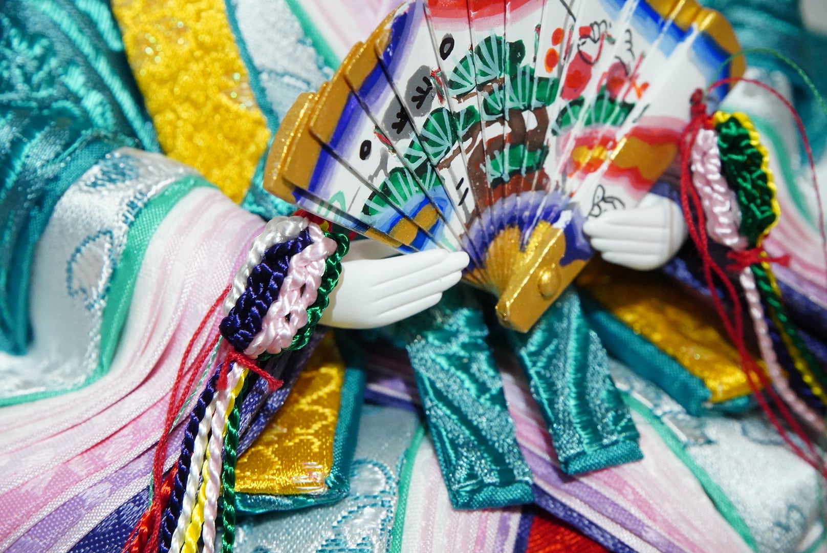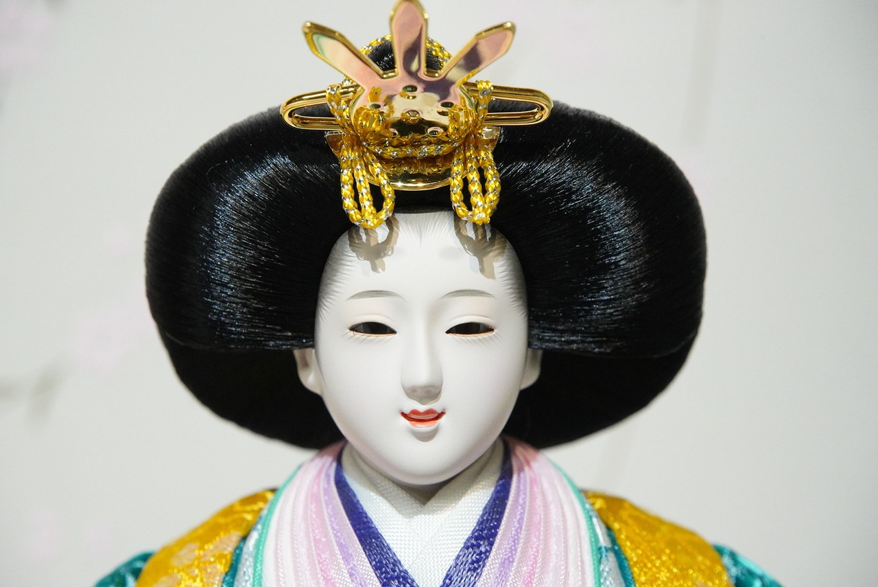 お雛様は翡翠を思わせる青緑の衣に、桜色と藤色を重ねた優美な配色。光の角度によって色彩が柔らかく移ろい、まるで宝石のような上品な艶めきを放ちます。