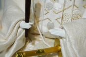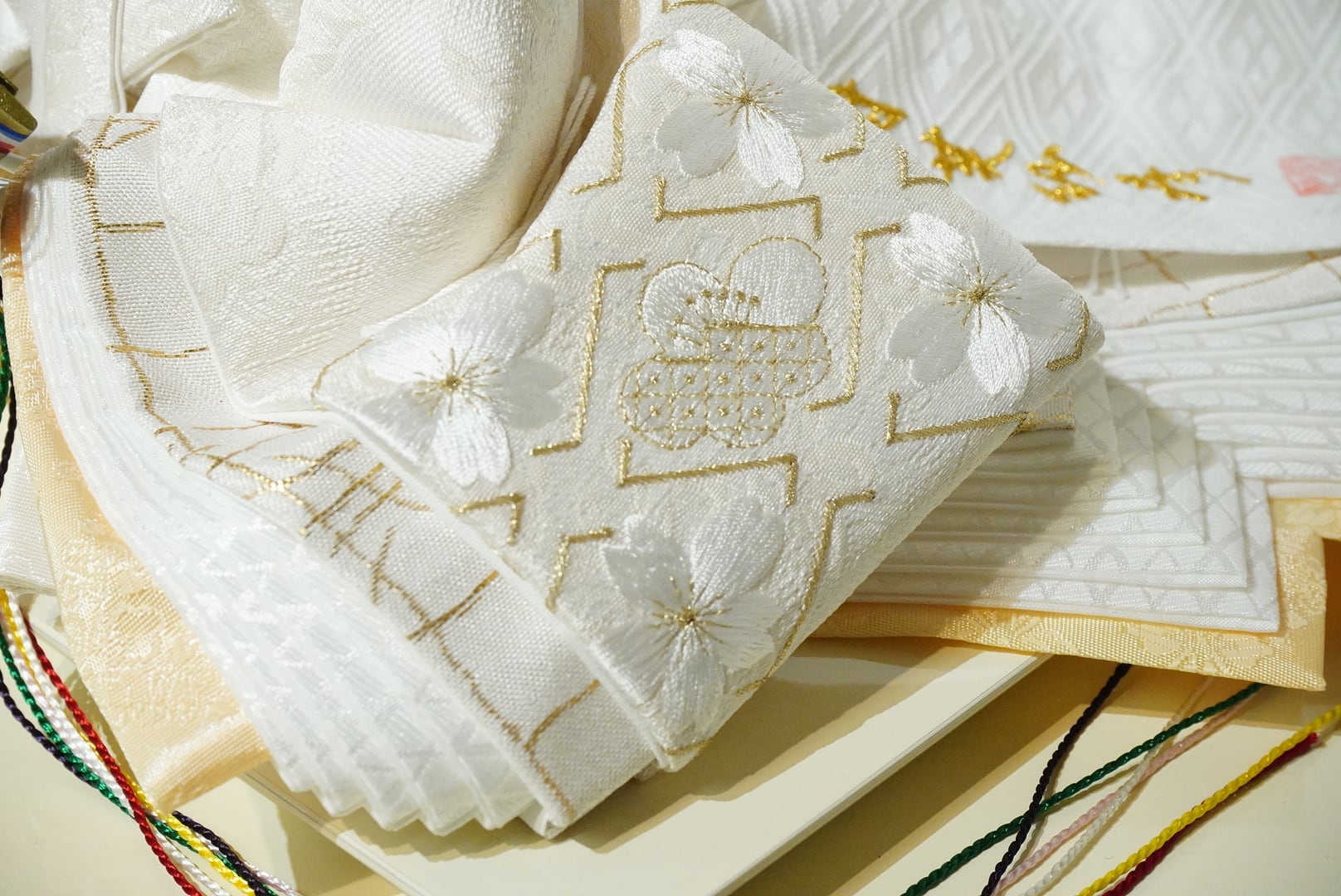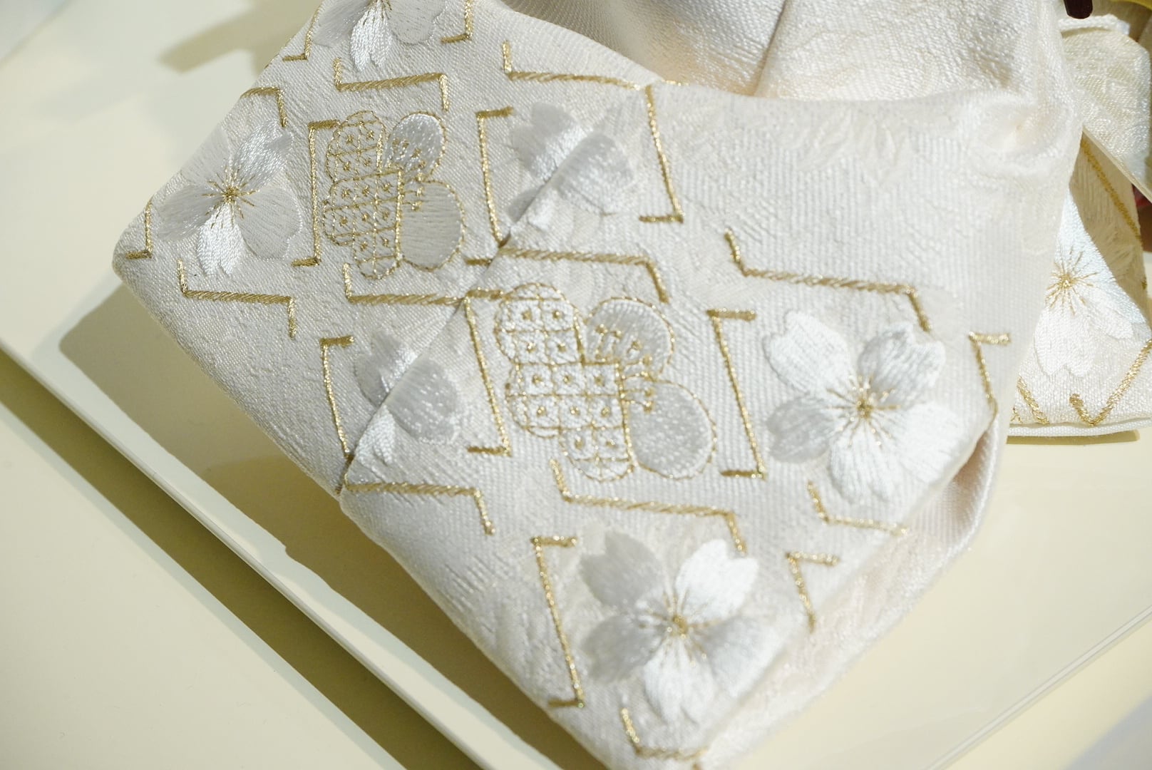 清らかで純粋な印象の中に、金糸の刺繍がさりげない華やかさを添えています。