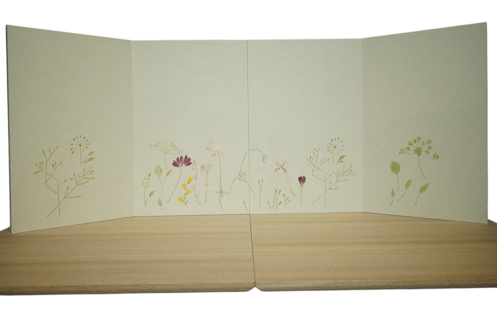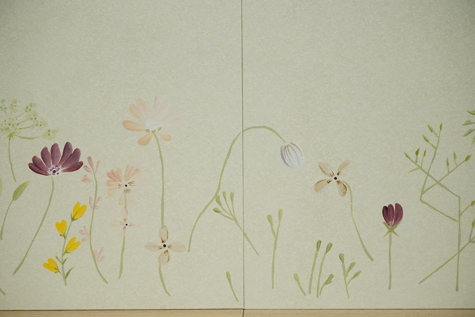 淡い生成りの屏風には草花がやさしく描かれ、春の息吹をそっと感じさせます。