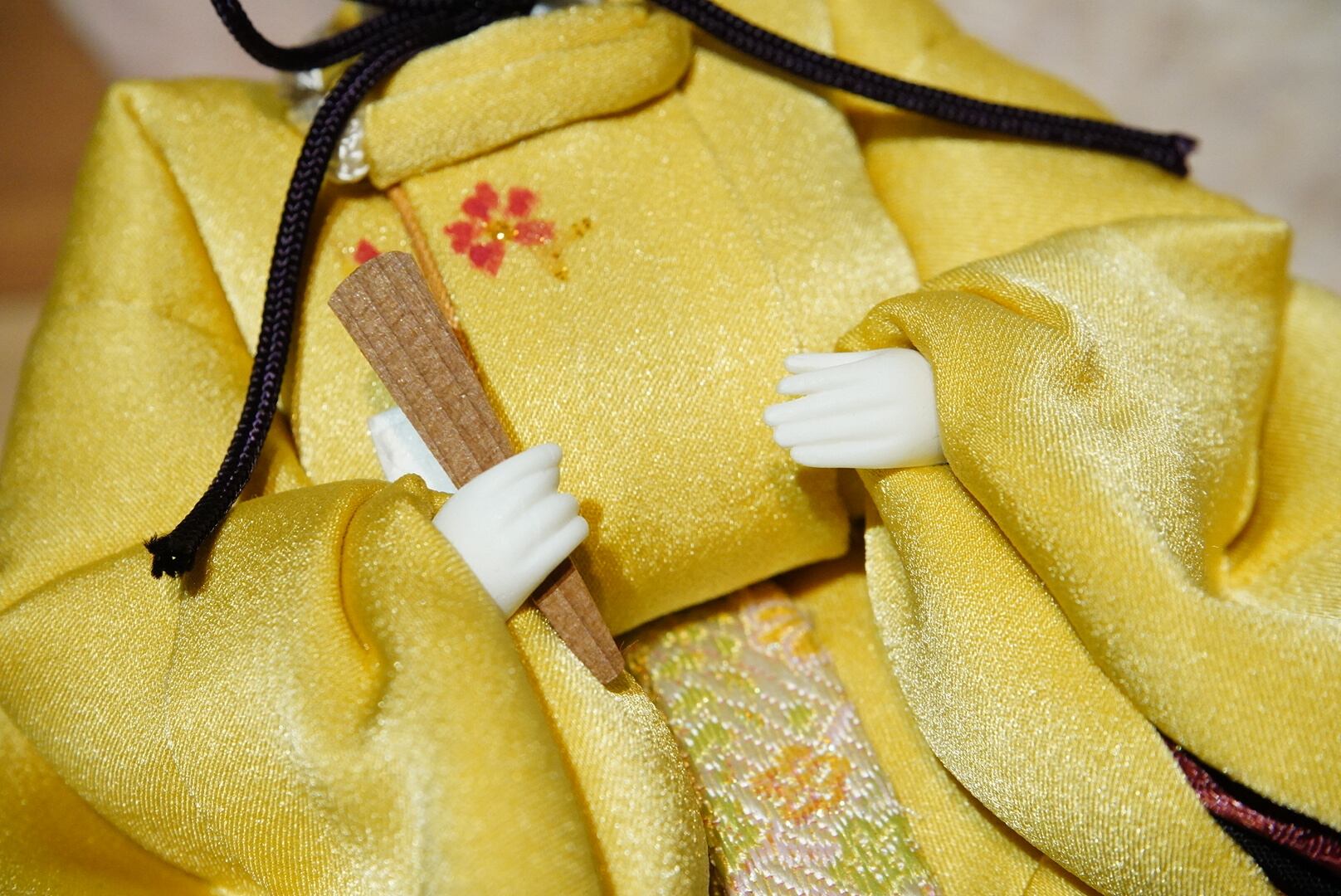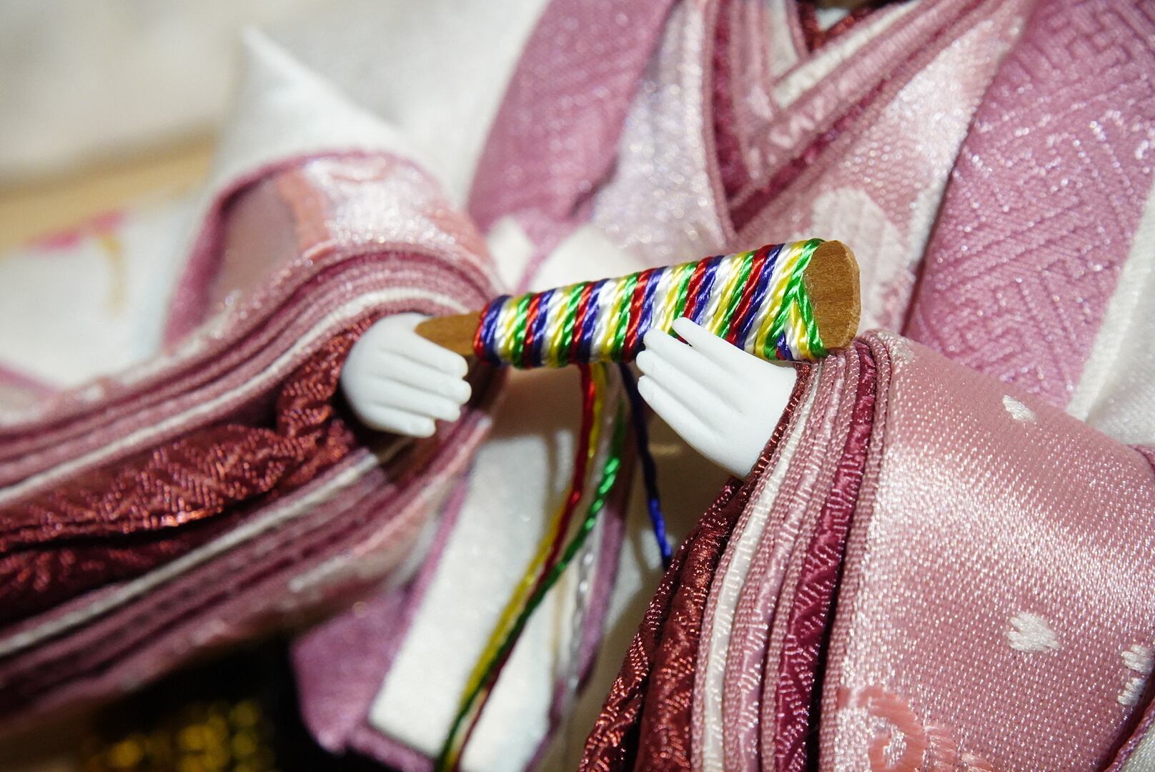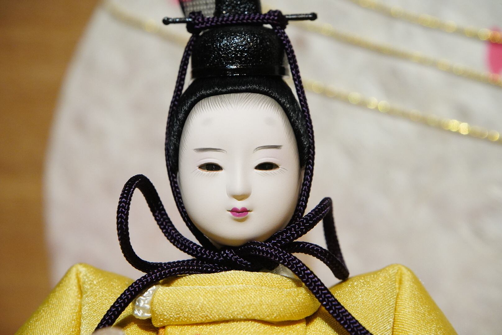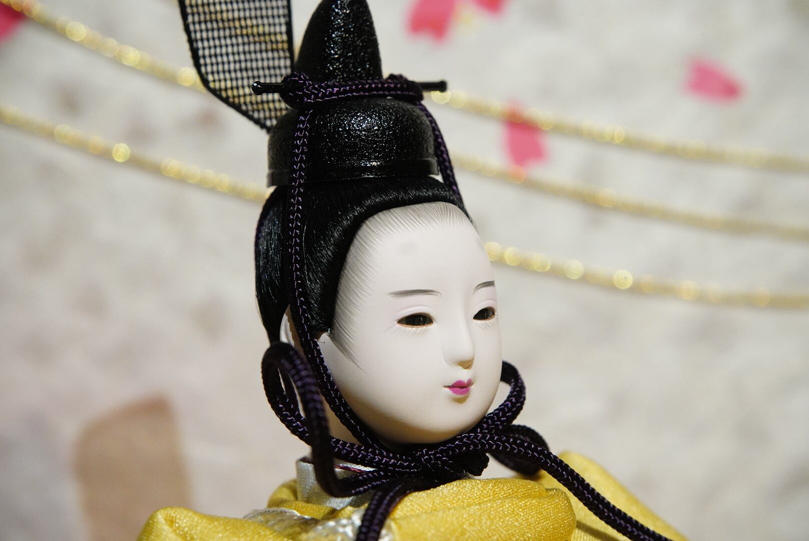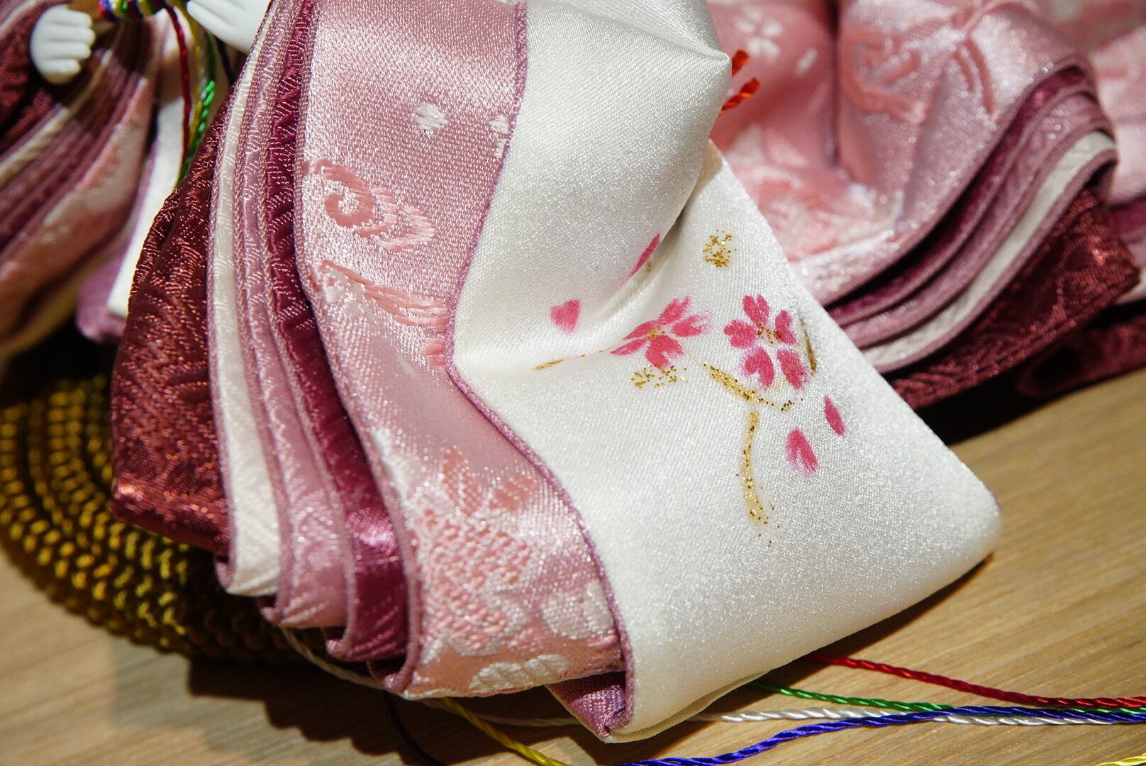 お内裏様には爽やかな若草色を帯びた黄金の衣、お雛様には淡い桃色を基調とした可憐な装いを。