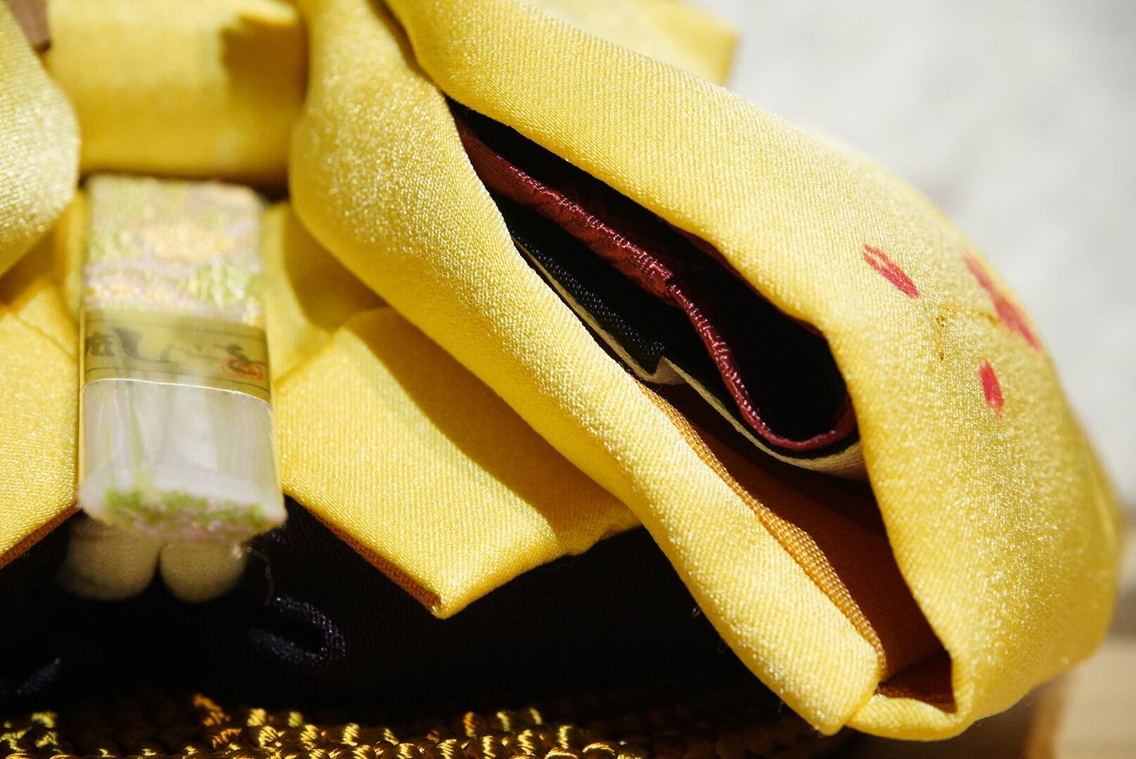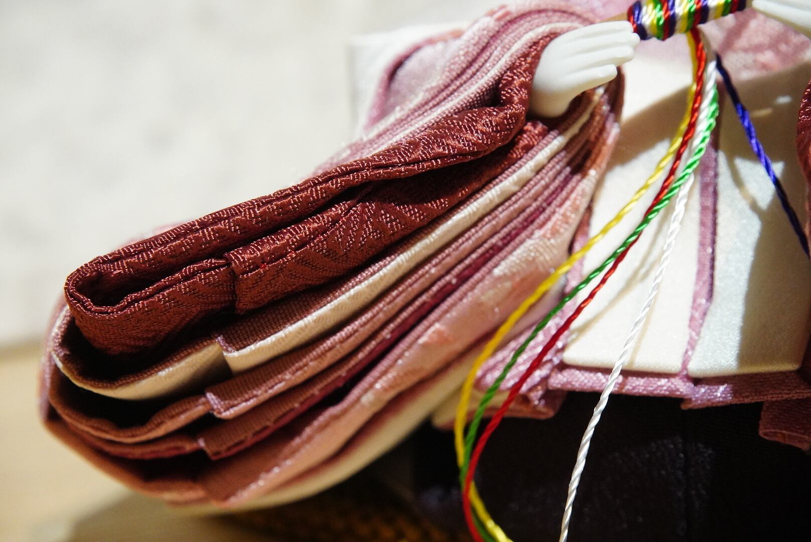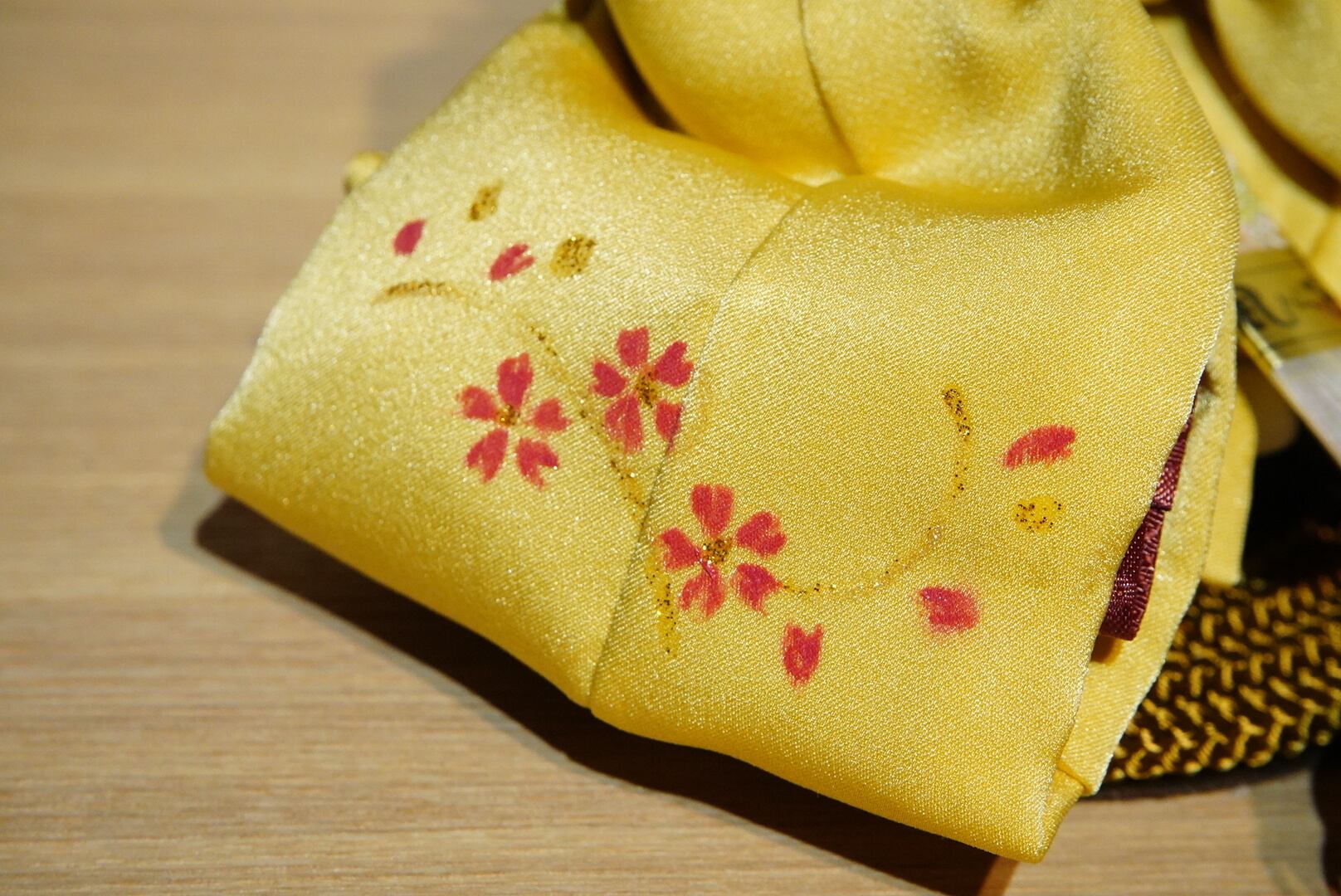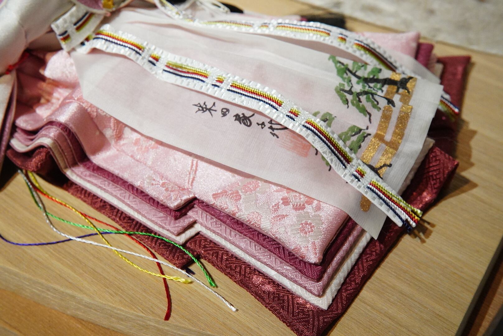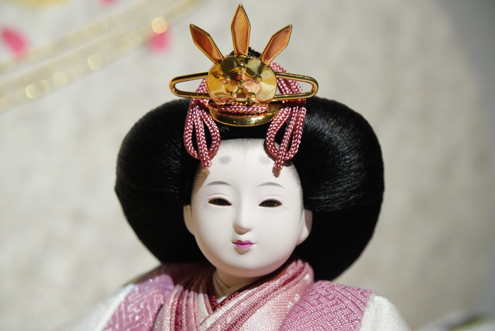 お内裏様には爽やかな若草色を帯びた黄金の衣、お雛様には淡い桃色を基調とした可憐な装いを。