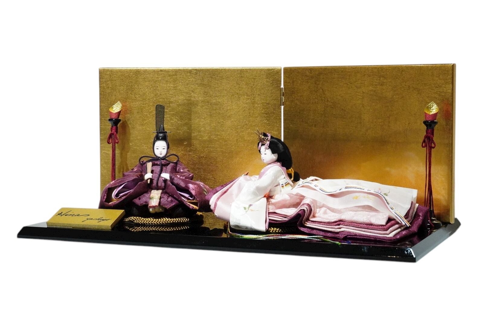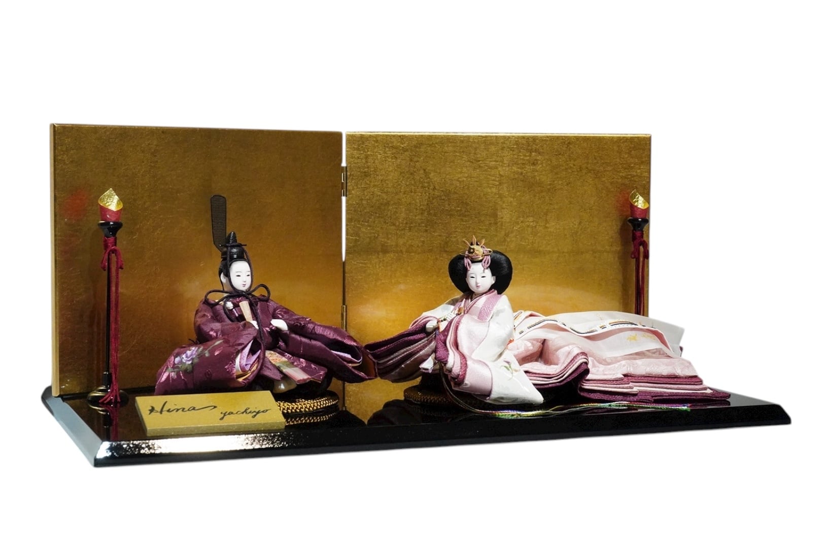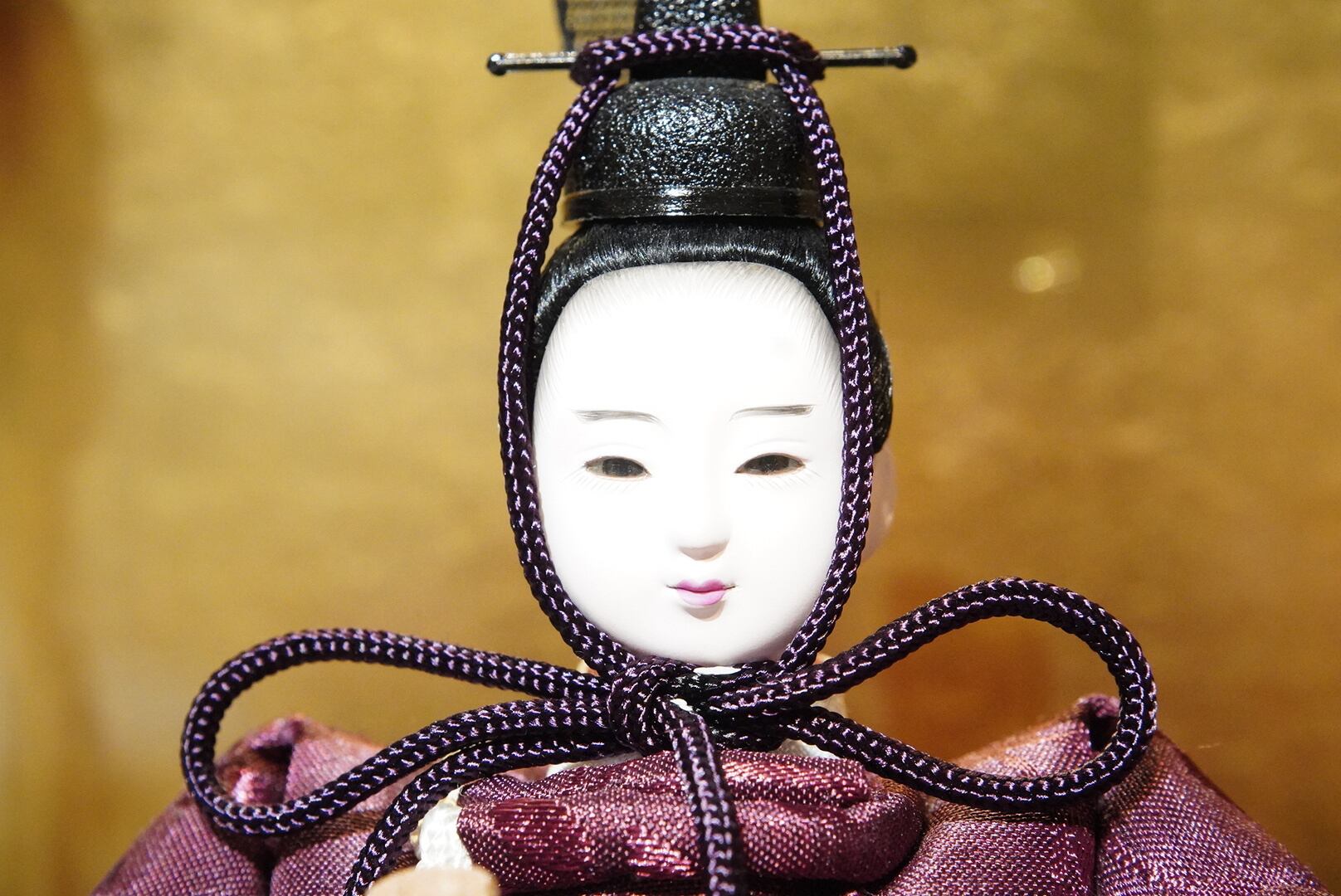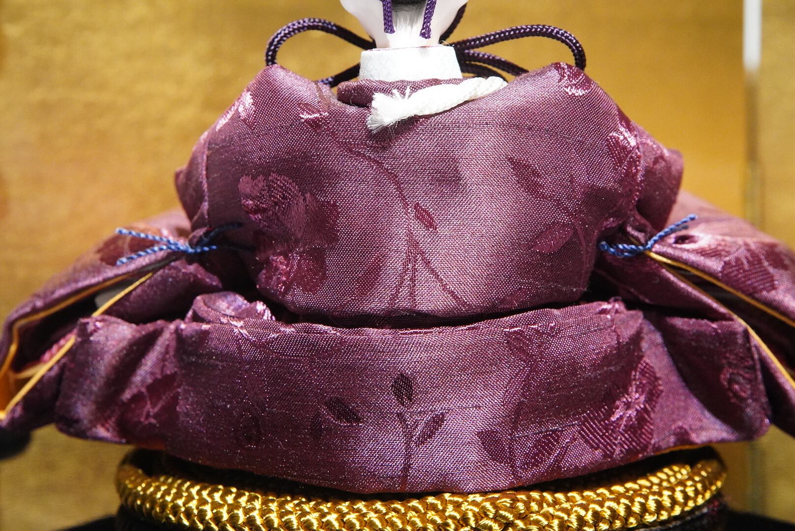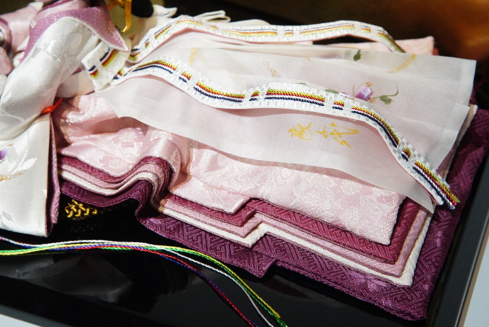お内裏様には深みのある紫、そしてお雛様には淡い桃色と白を重ねた優美な衣裳を。