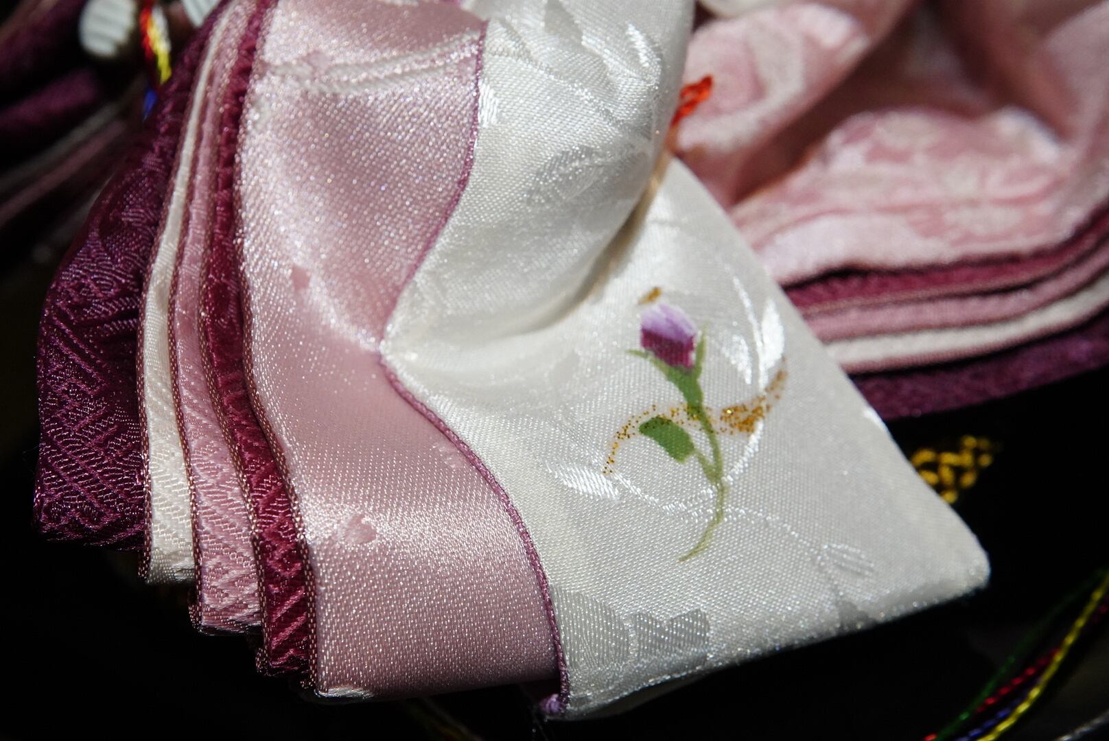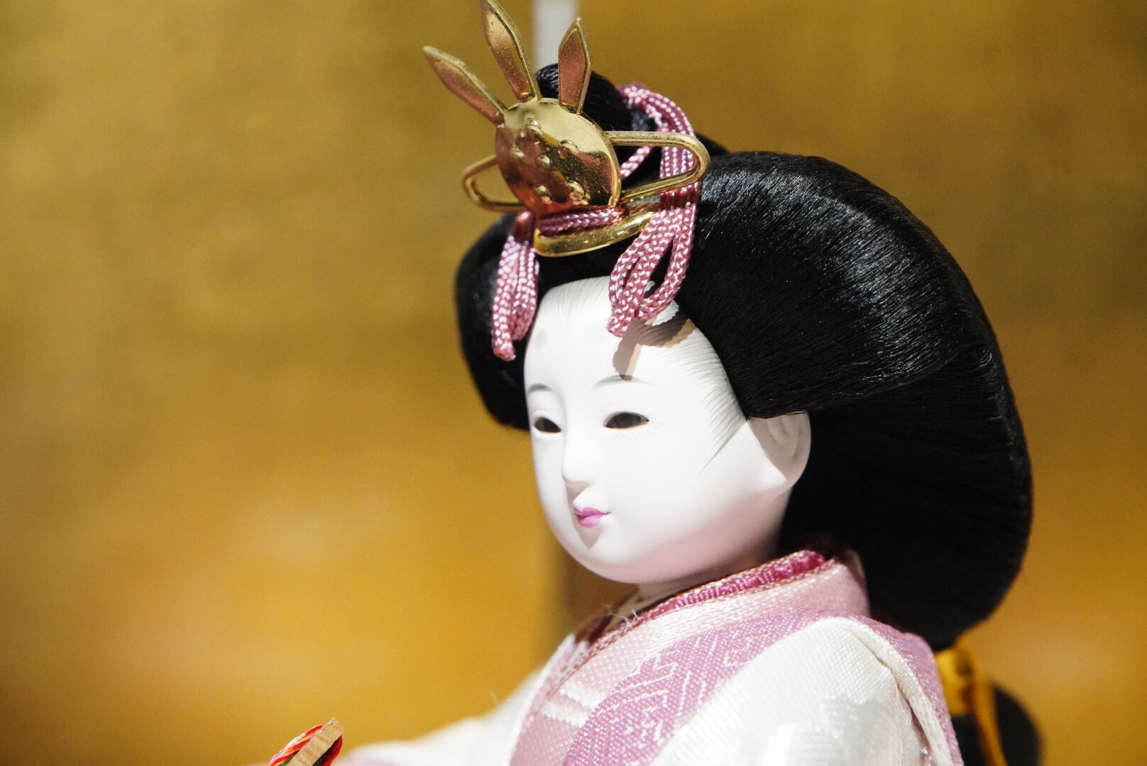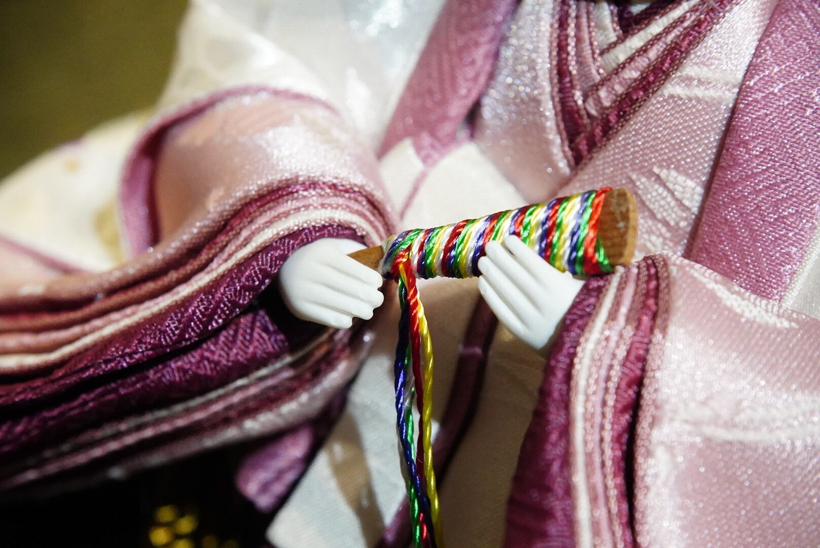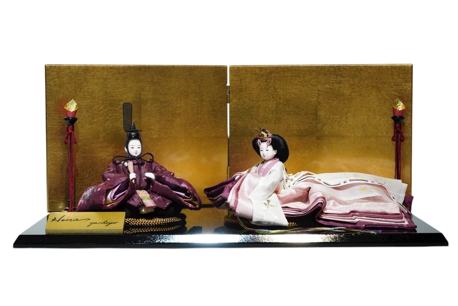 お内裏様には深みのある紫、そしてお雛様には淡い桃色と白を重ねた優美な衣裳を。
