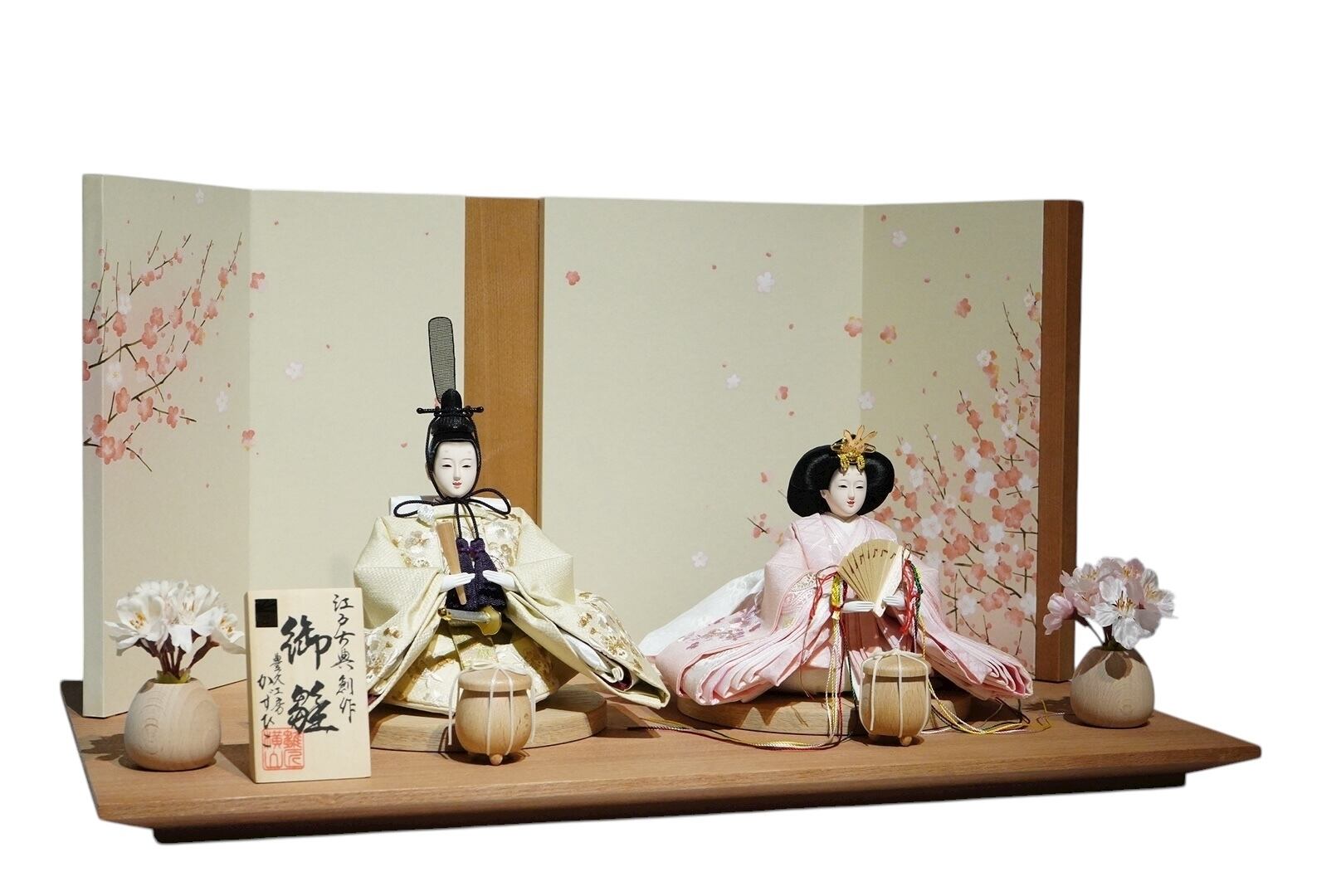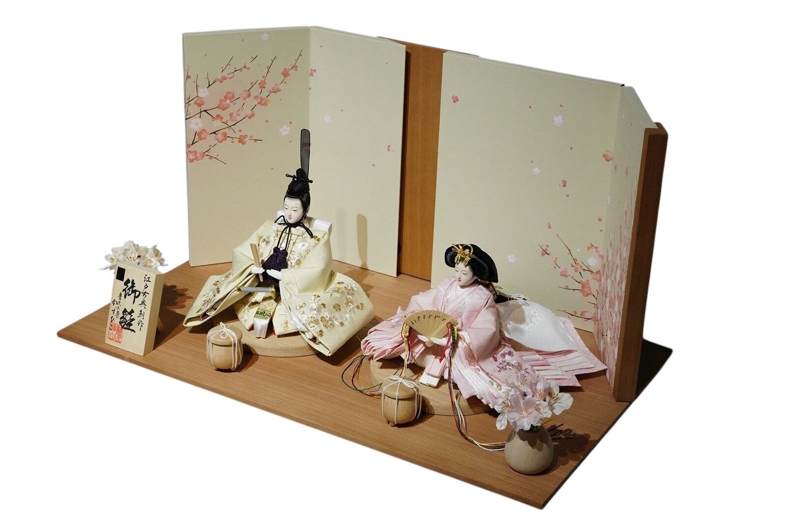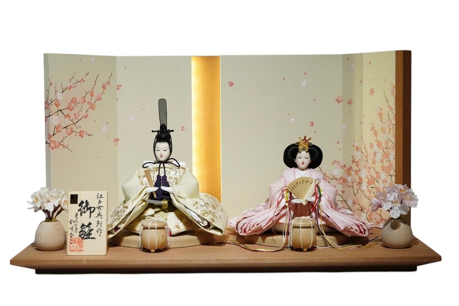 やさしい桜の絵柄が描かれた屏風にはLEDライトが内蔵されており、点灯すると穏やかな光が人形を包み込み、上質な空間を演出します。