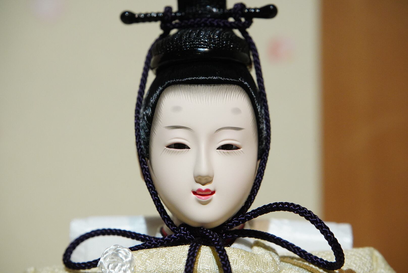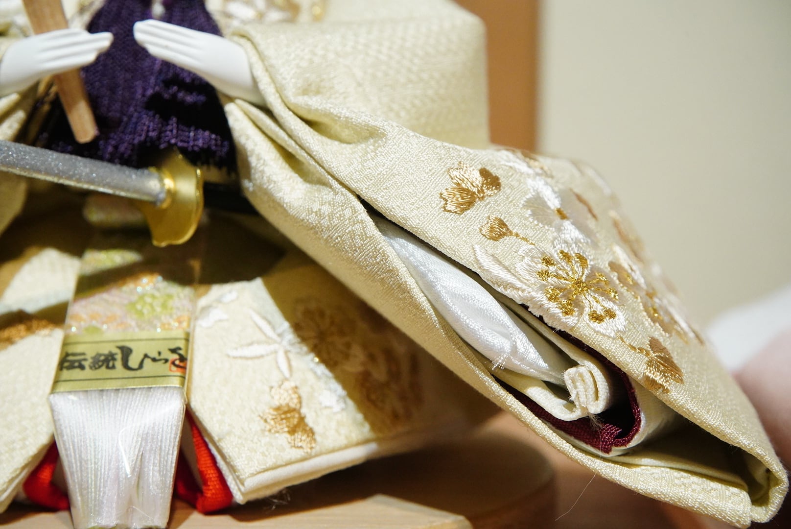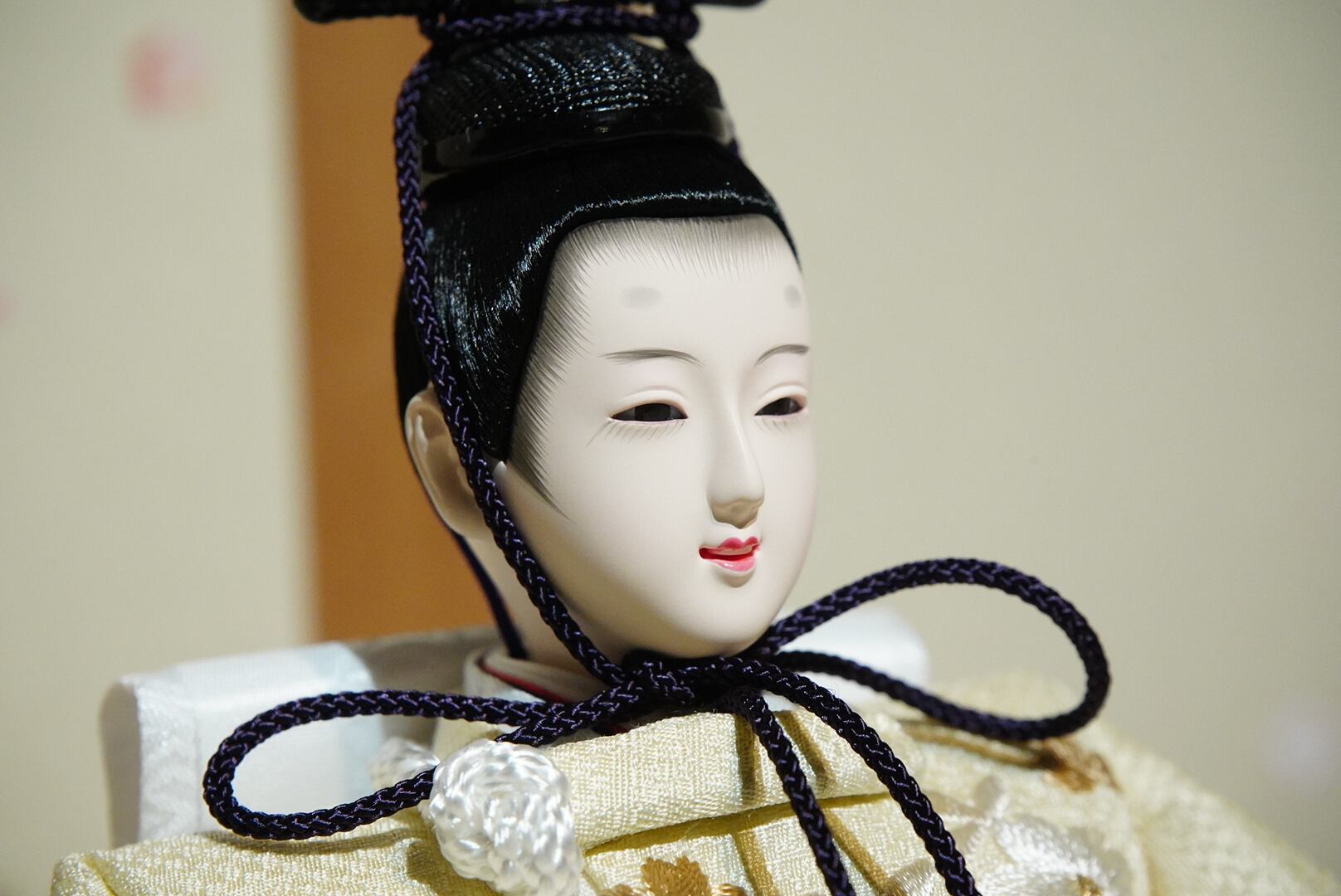 お内裏様は淡い生成り色の衣裳に金糸を織り込み、凛とした佇まいに気品が漂います。