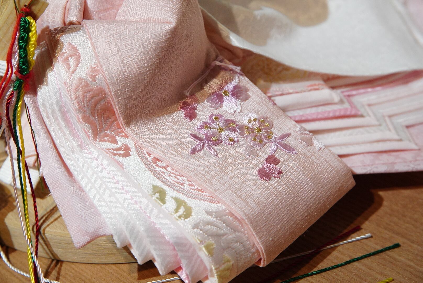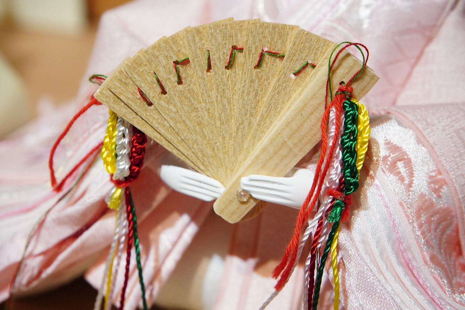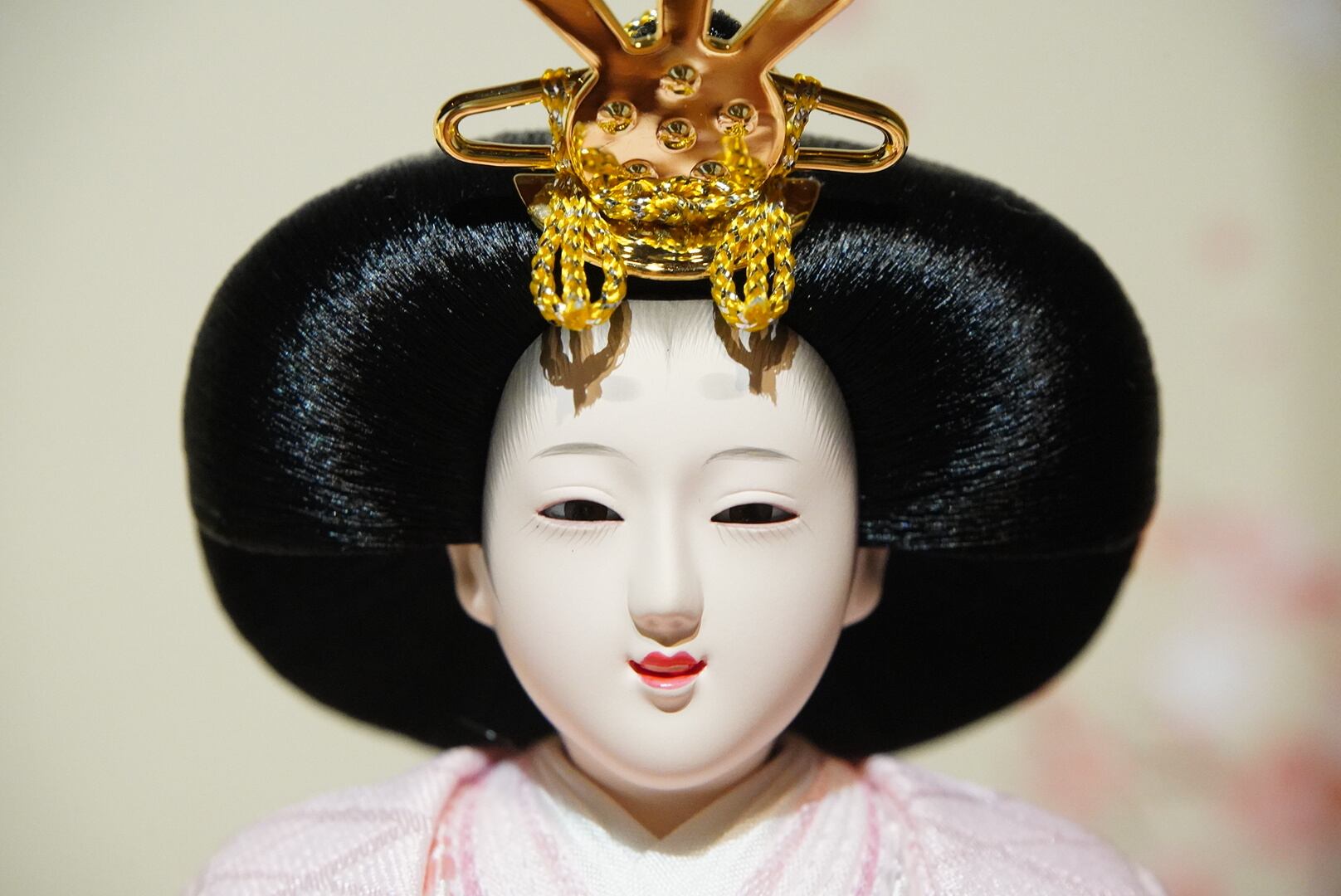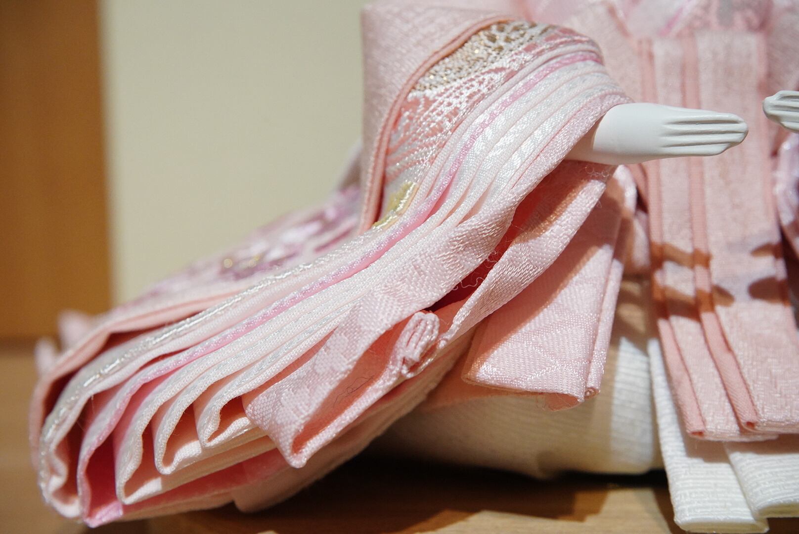 お雛様は春らしい優しいピンクの衣裳を重ね、華やかさの中にも落ち着いた美しさを感じさせます。