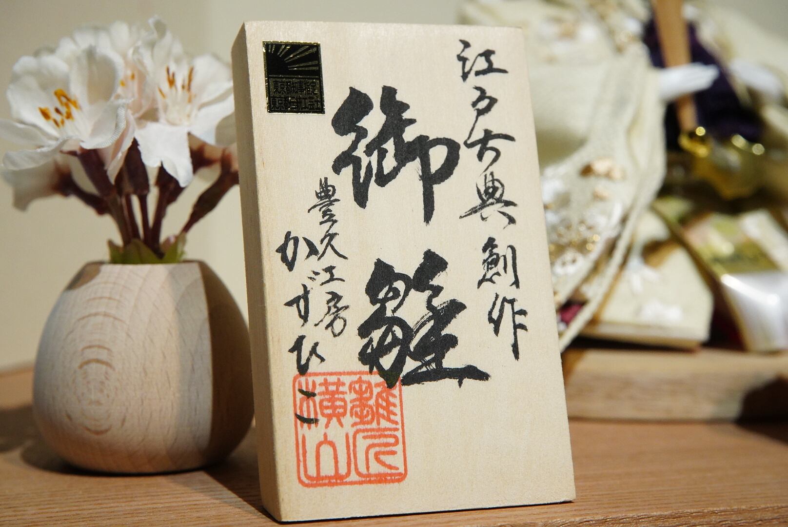 木目の台座と丸みのある花飾りが、全体にやわらかな温もりを添え、現代のインテリアにも調和する上品なデザイン。