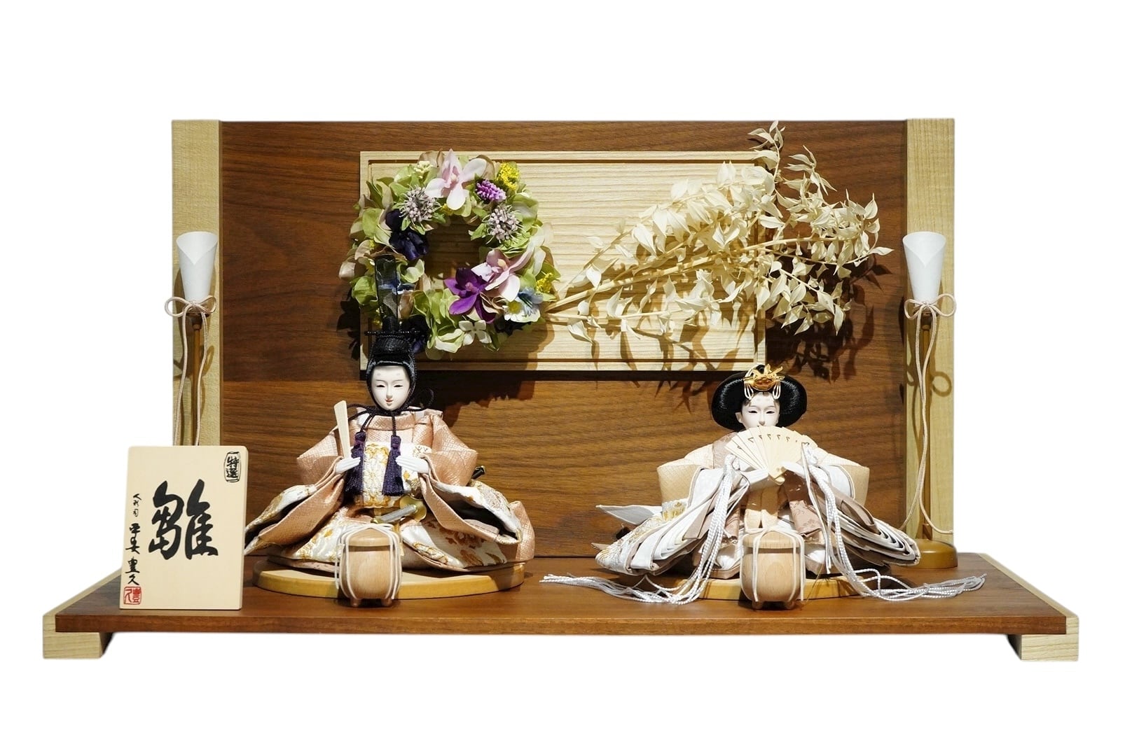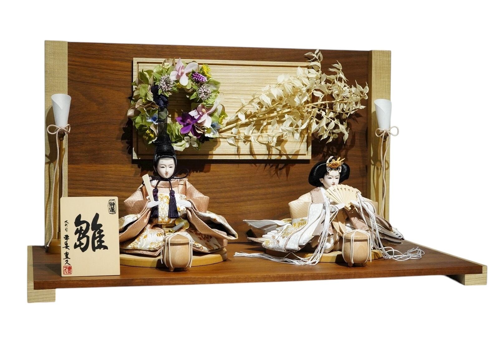 深みのある木目が美しい台座と屏風に、華やかなリースをあしらった上品な親王飾り。