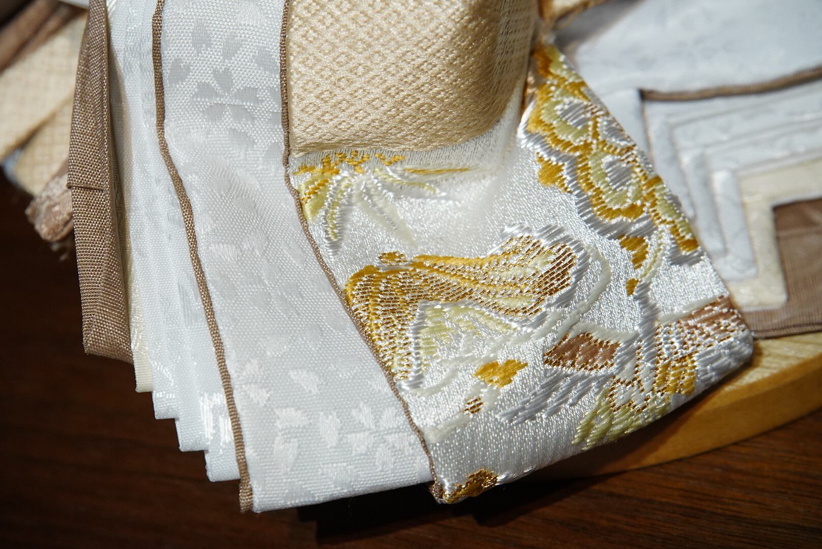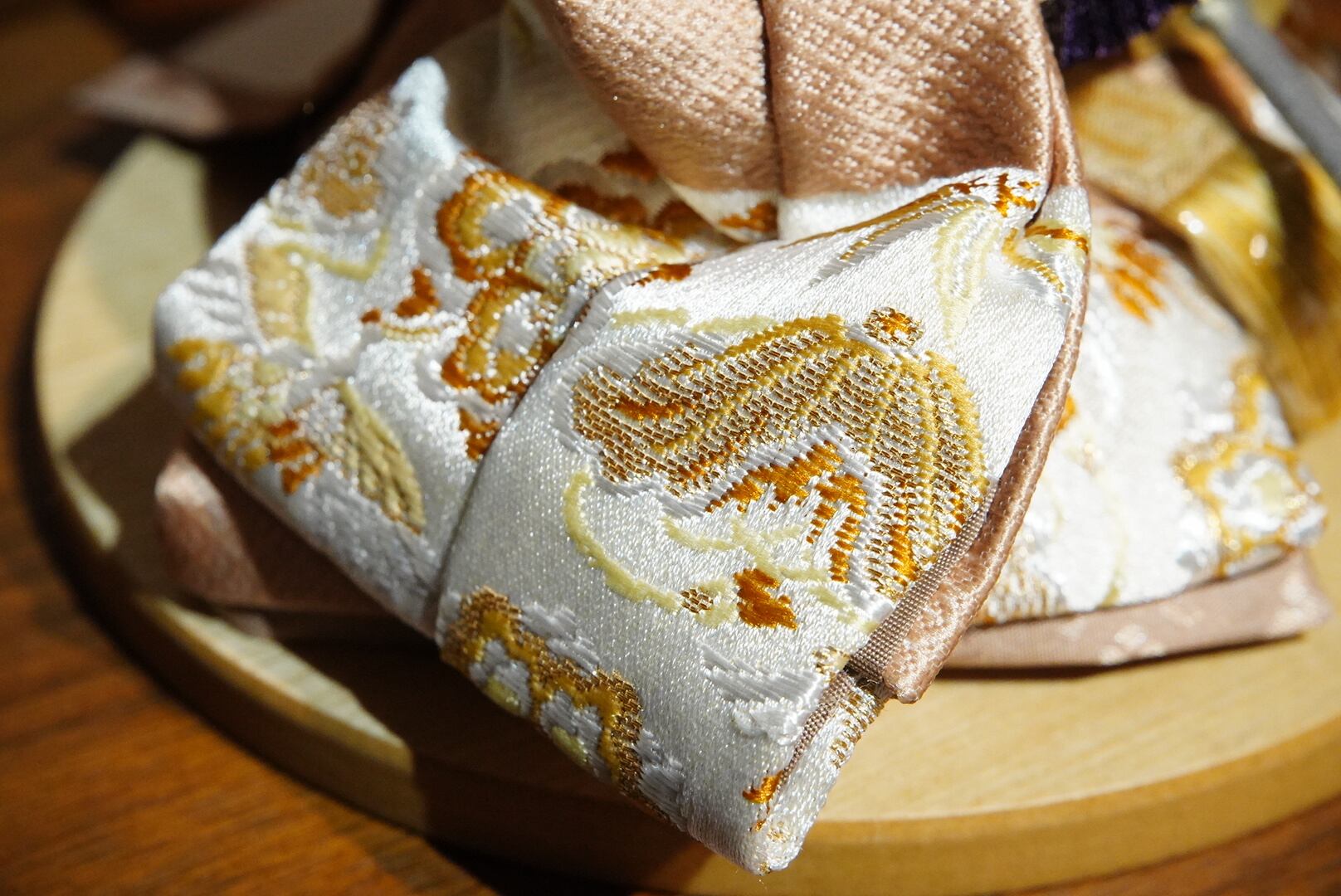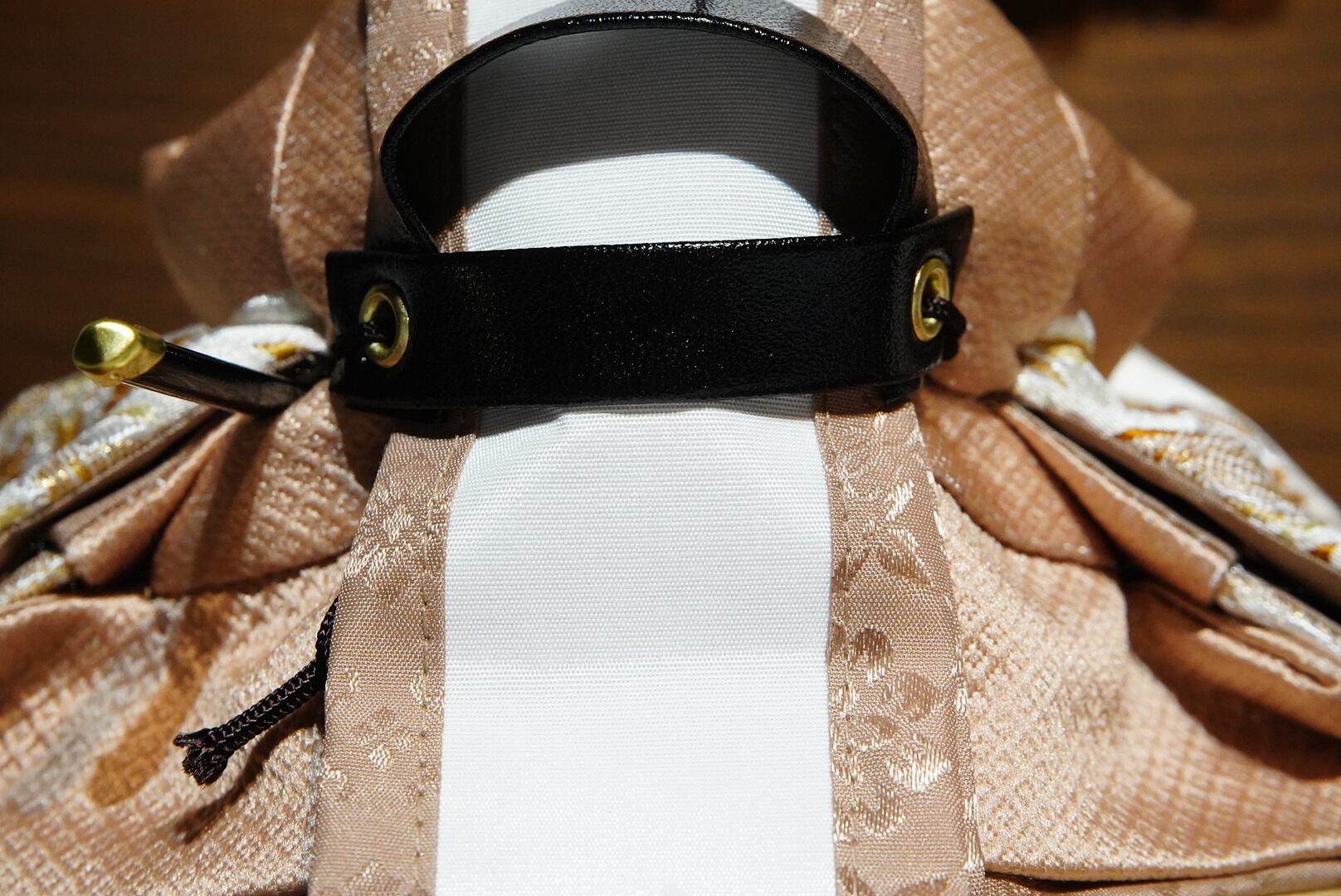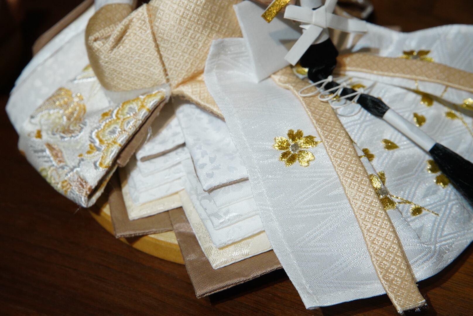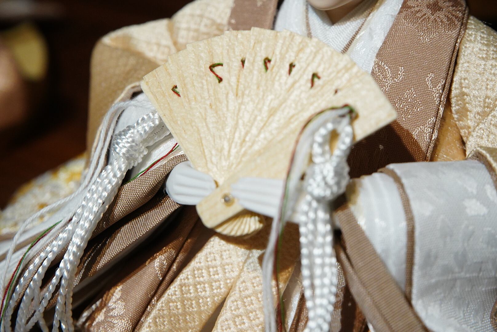 お雛様は生成りと白を基調にした衣裳をまとい、柔らかな光沢が気品を引き立てます。