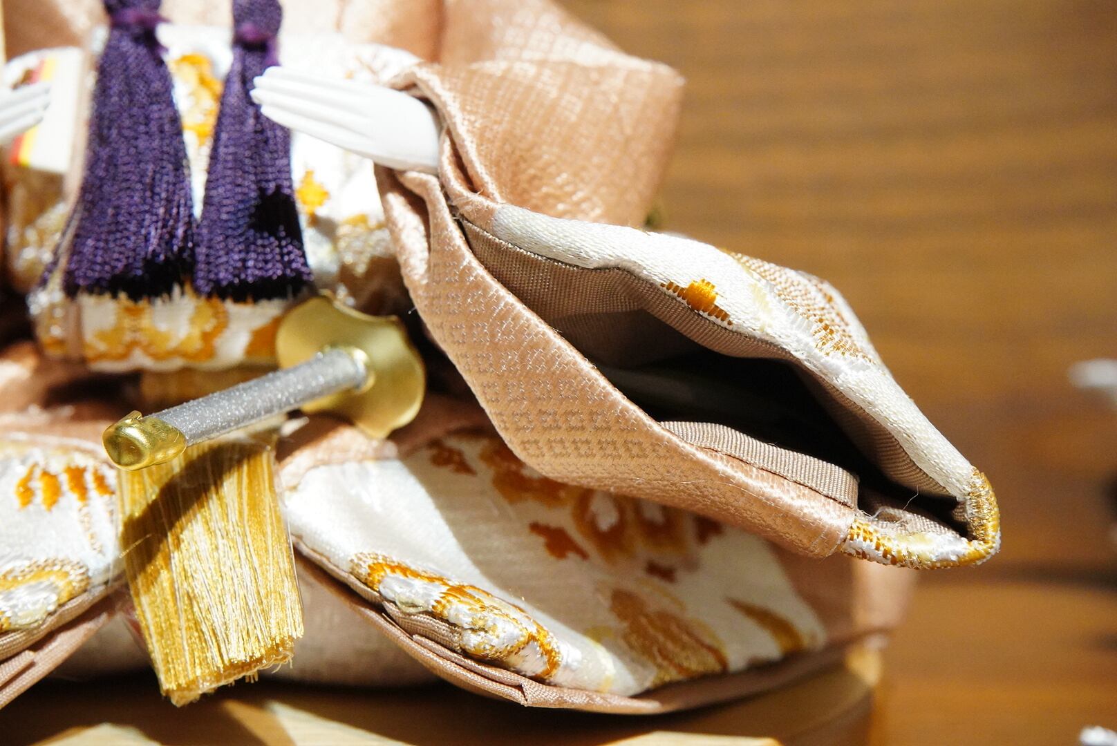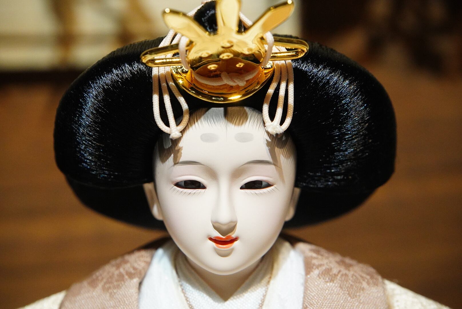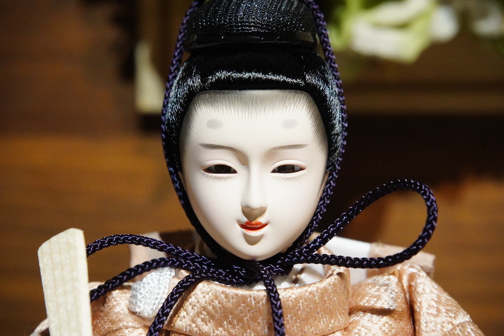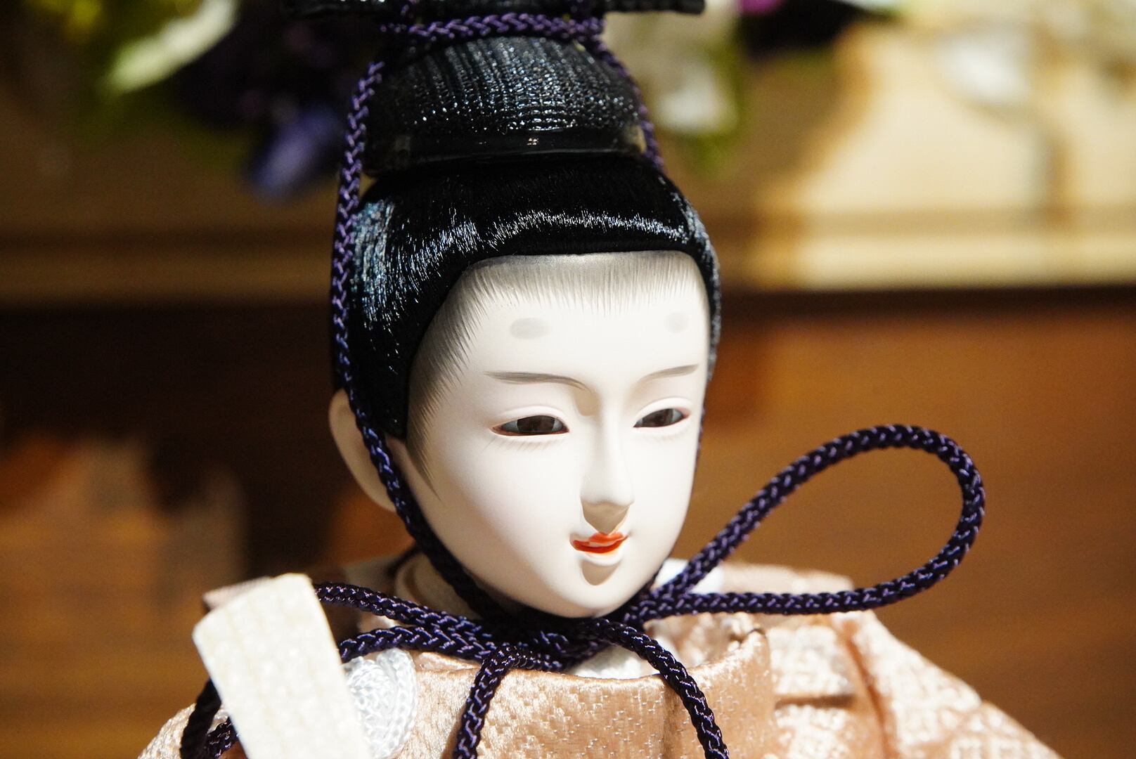 お内裏様は淡い金桃色に紫を差し込んだ衣裳で、端正かつ格調高い佇まいに。