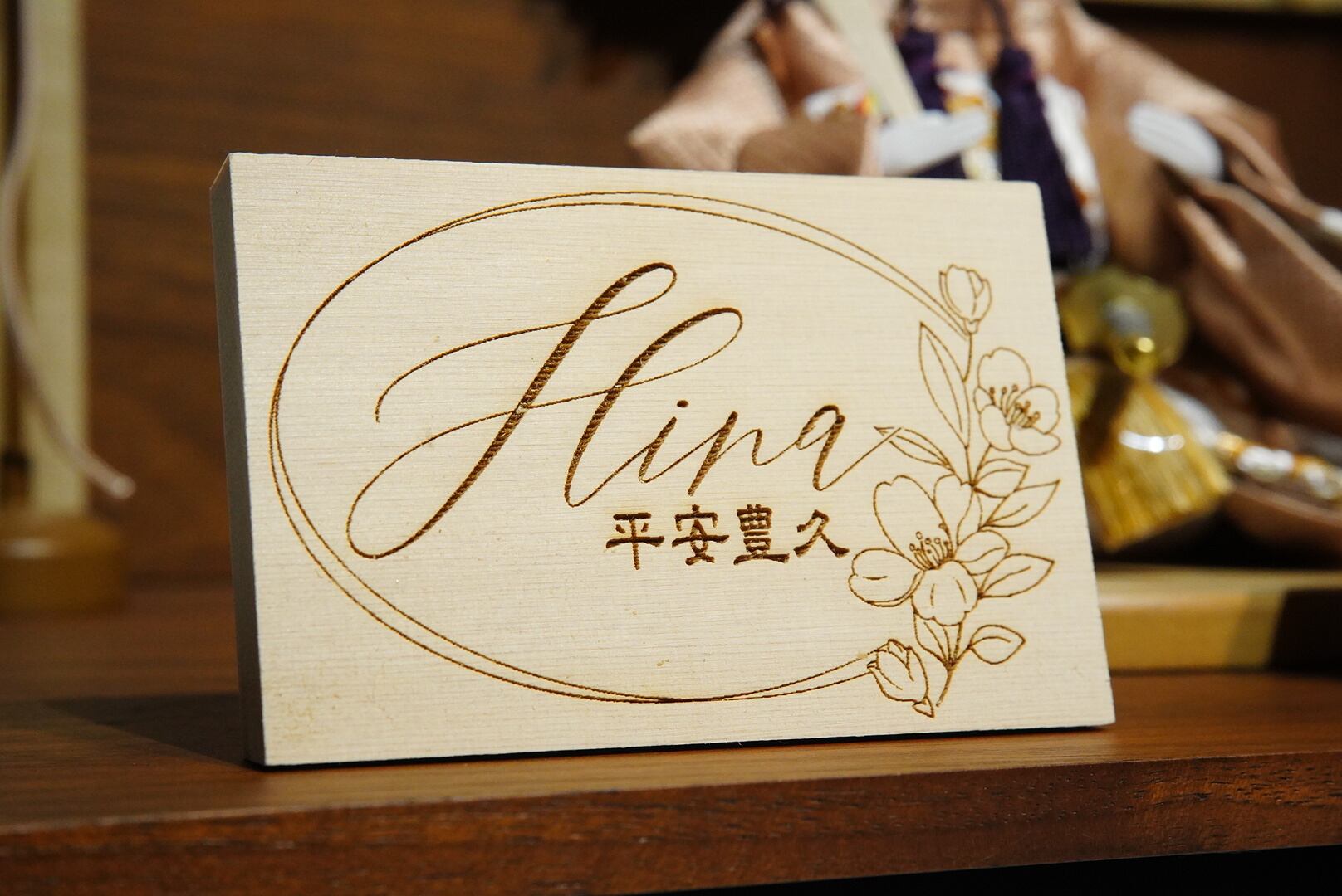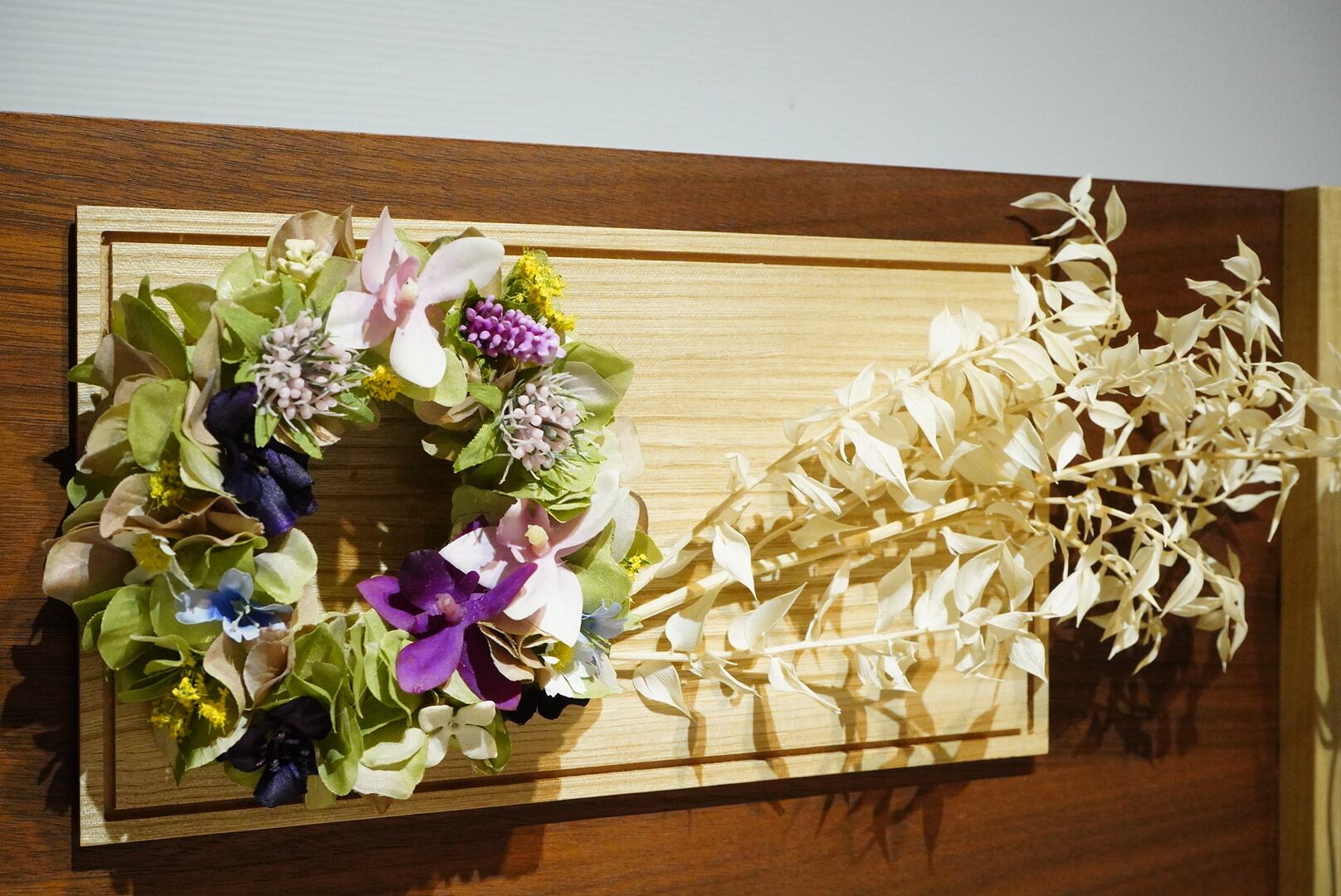 木の温もりと花の華やかさが調和する、穏やかで高雅なお飾りです。