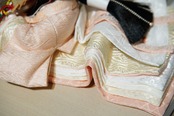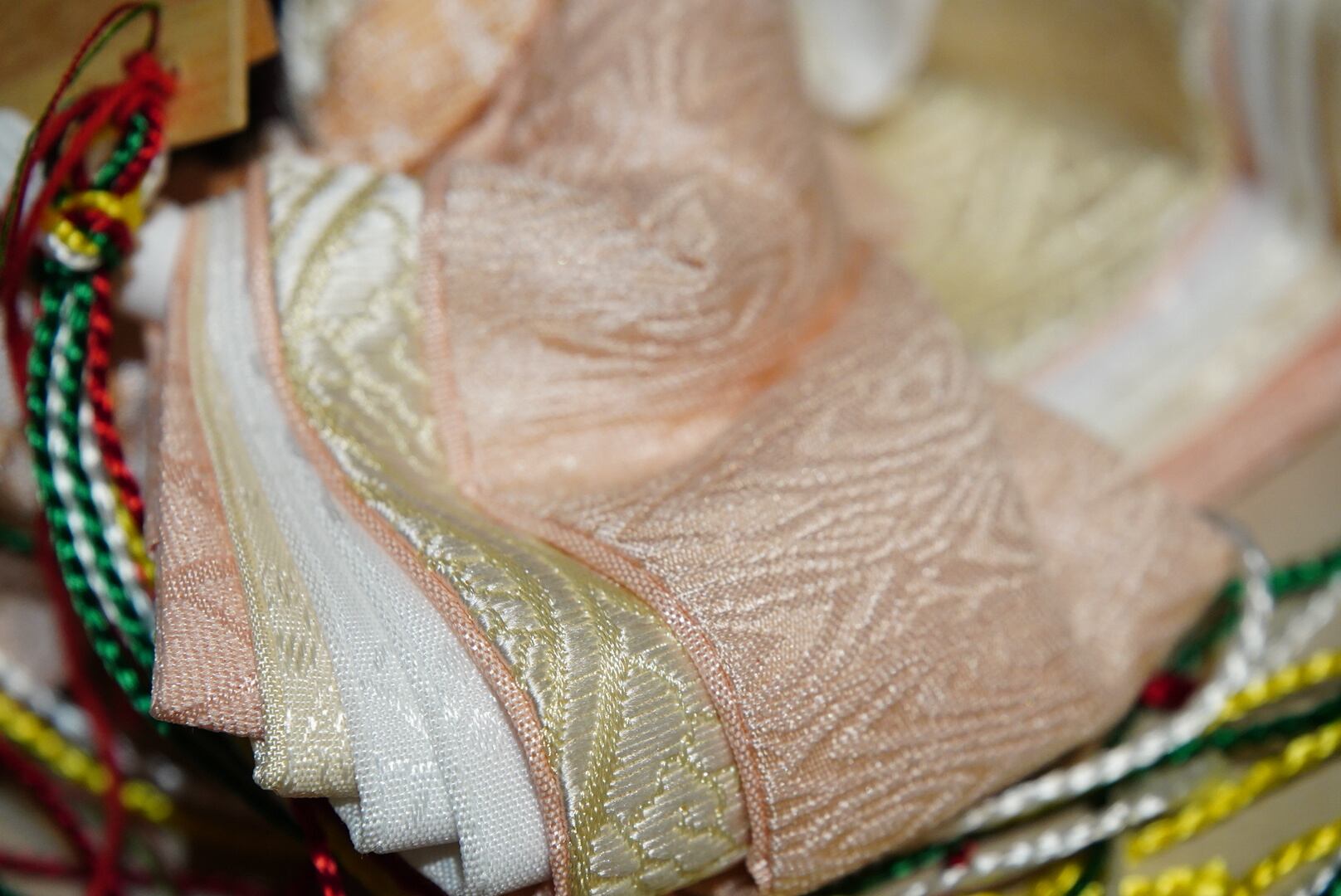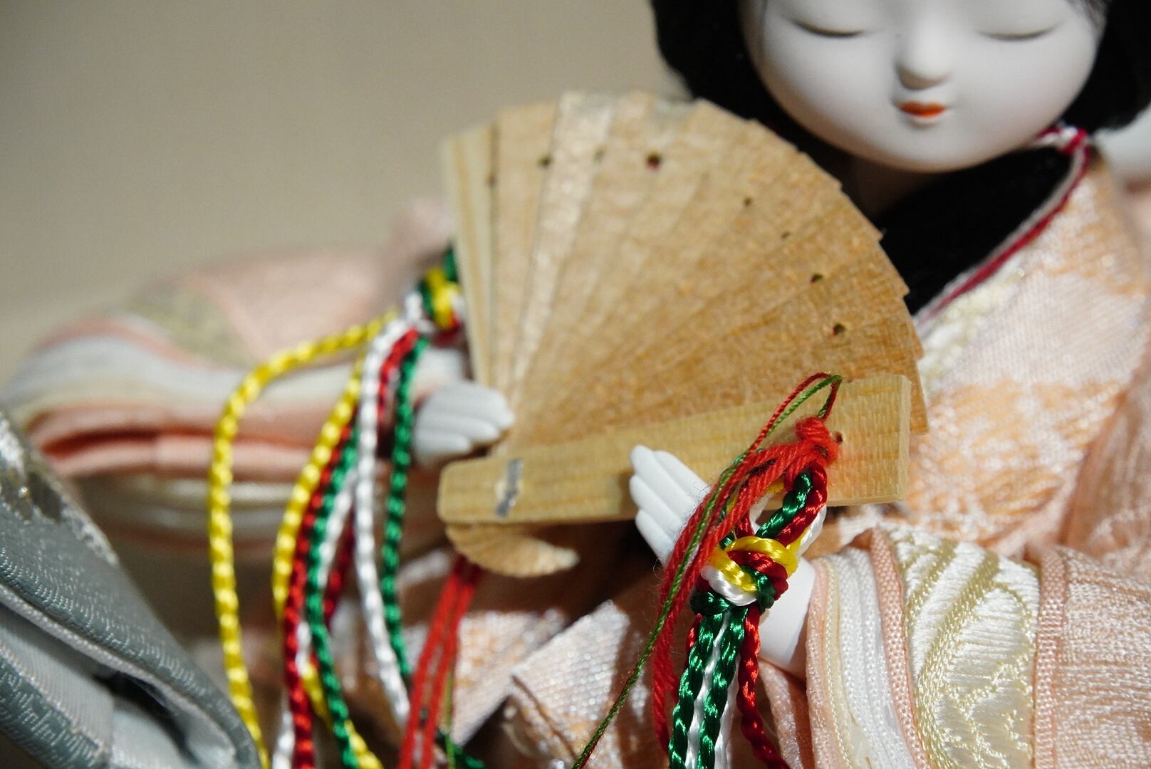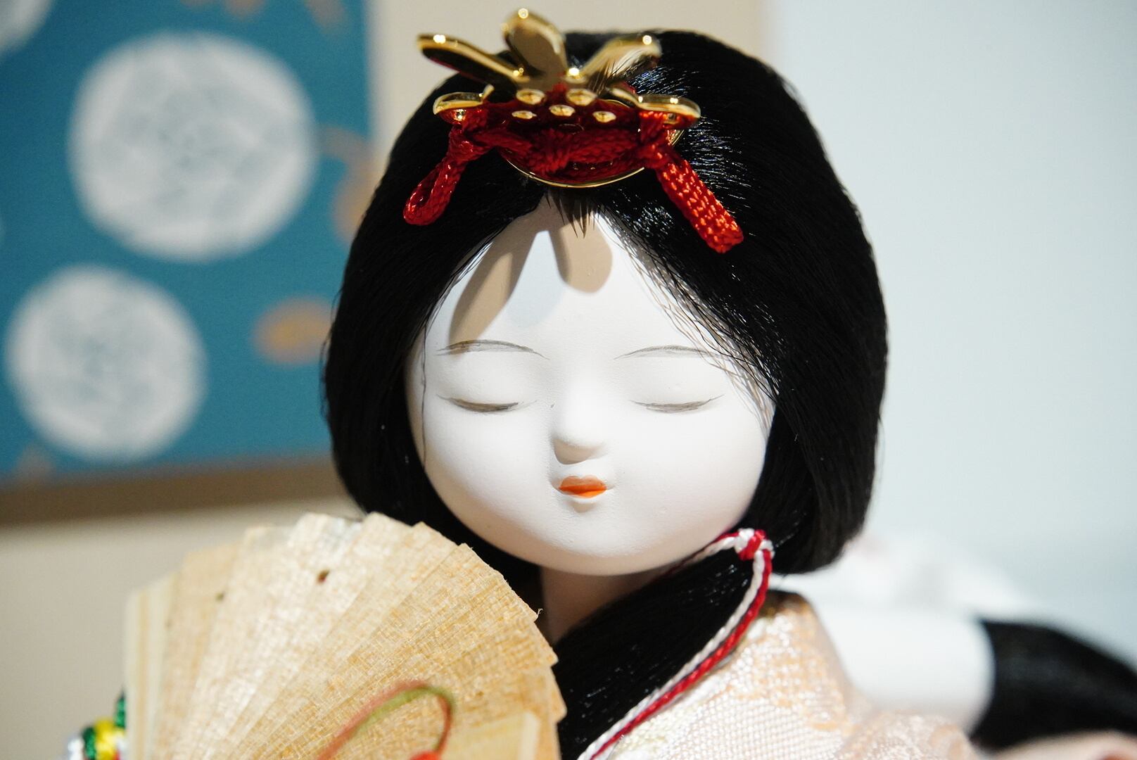 お雛様は淡い桜色を基調とした重ねの衣に、気品ある姿で寄り添うように座します。
