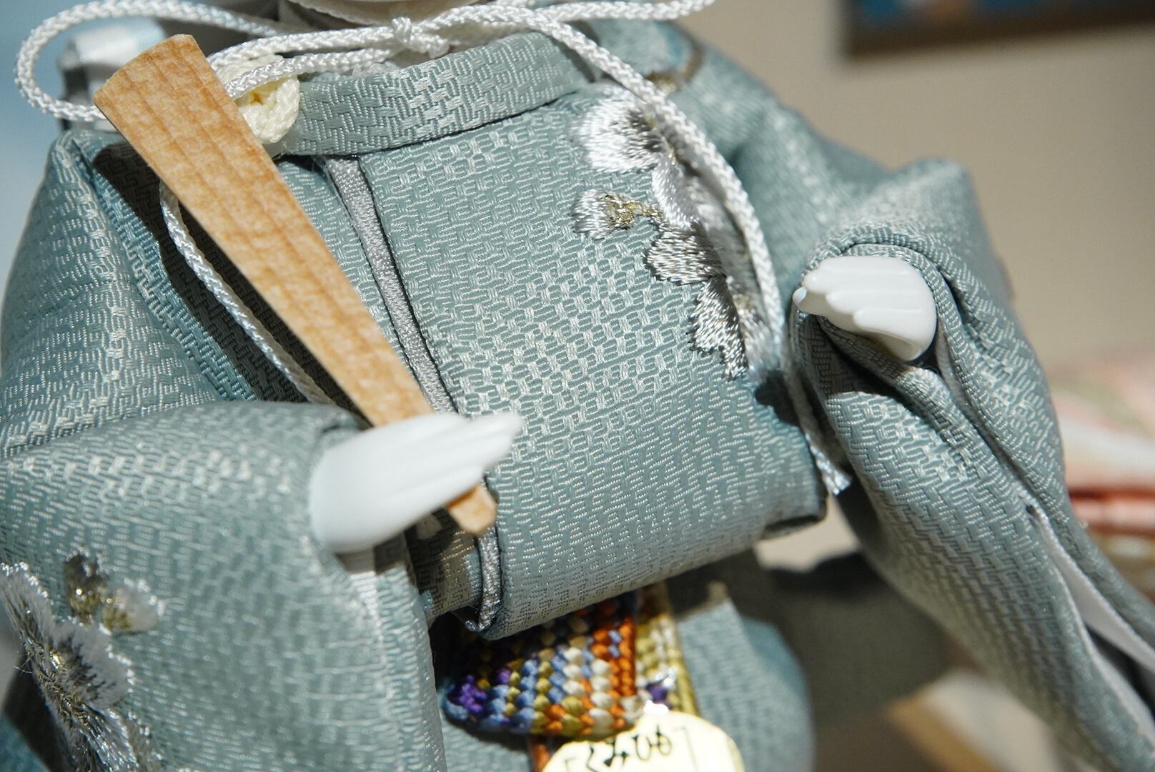 淡く光沢を放つ衣裳と、やわらかな表情が調和した、洗練されたひと品です。