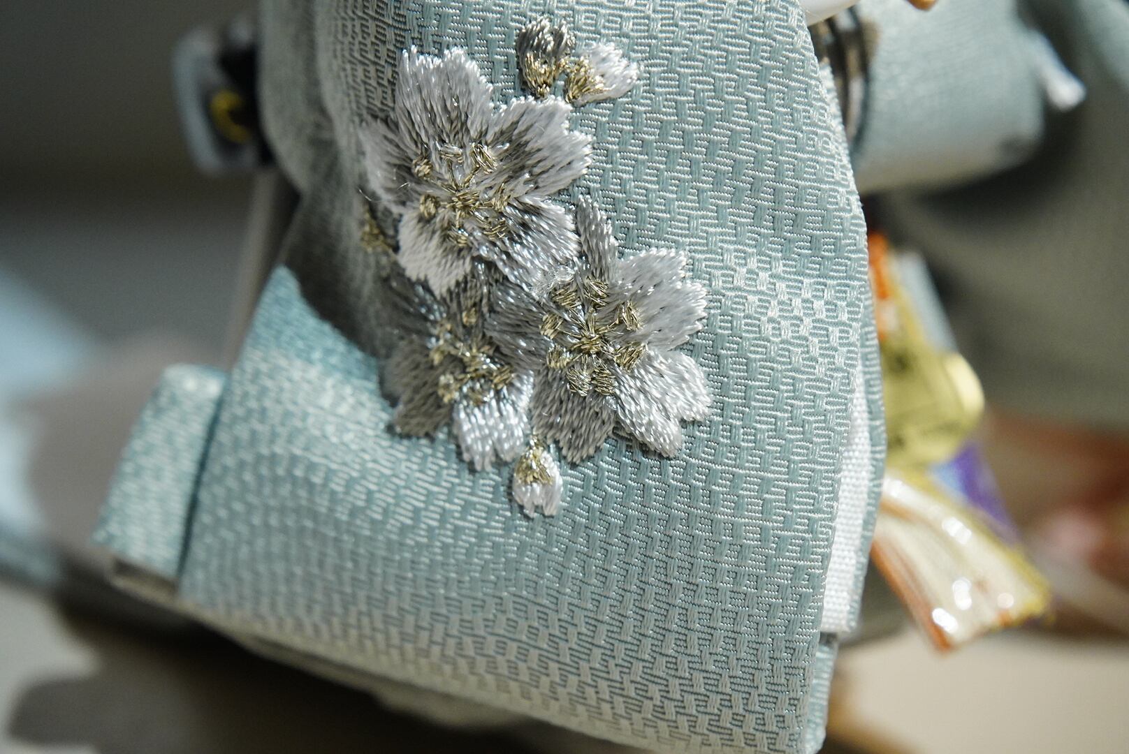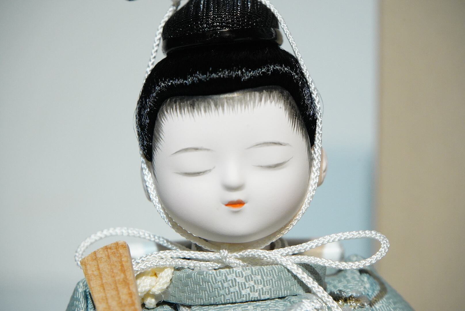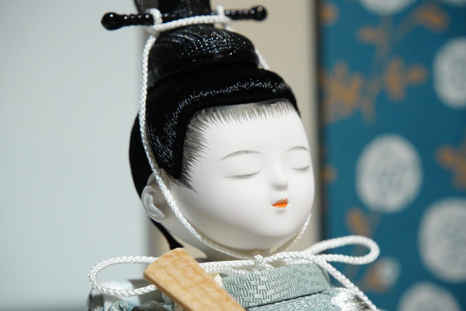 お内裏様は淡い青磁色の衣裳に、細やかな文様が上品に浮かぶ凛とした佇まい。