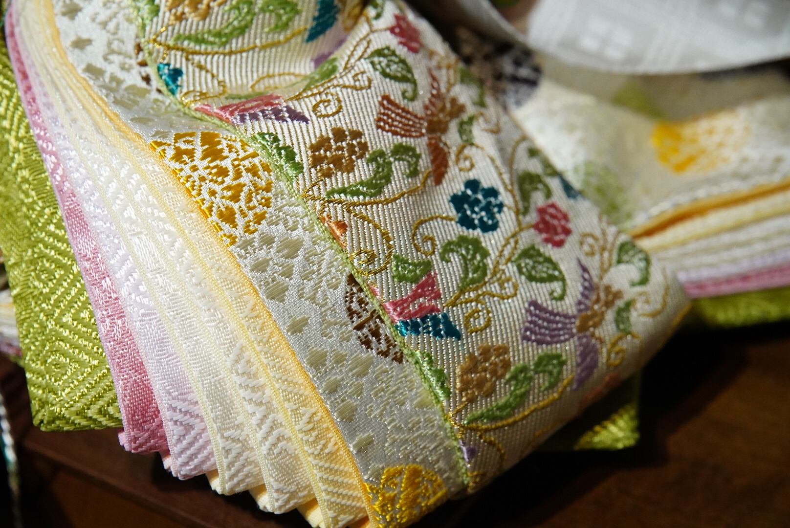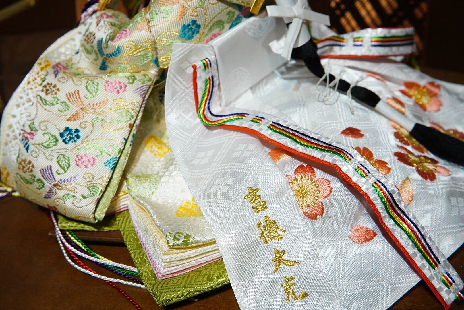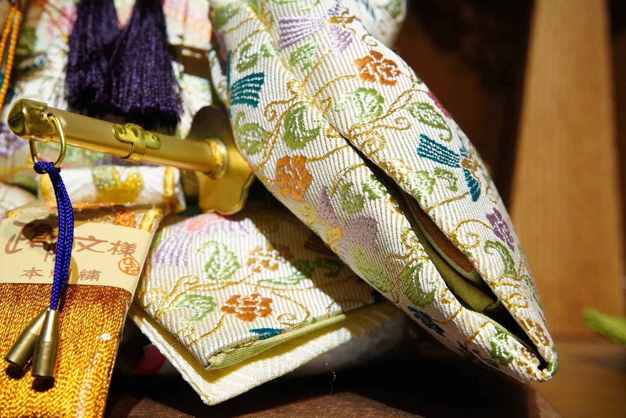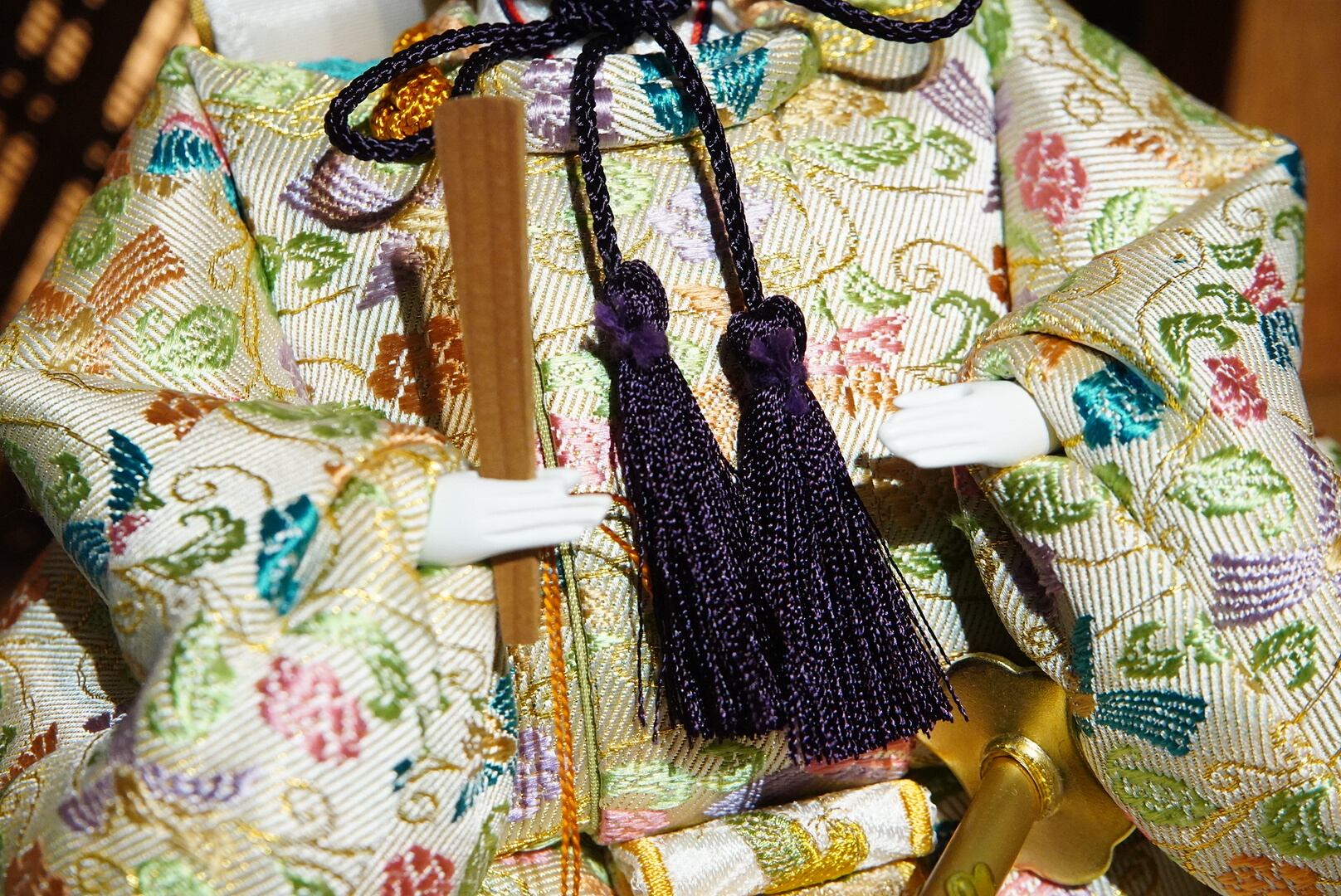 お内裏様・お雛様ともに淡い金地に彩り豊かな文様を織り込み、光を受けてやさしく輝く上質な衣裳に仕立てられています。