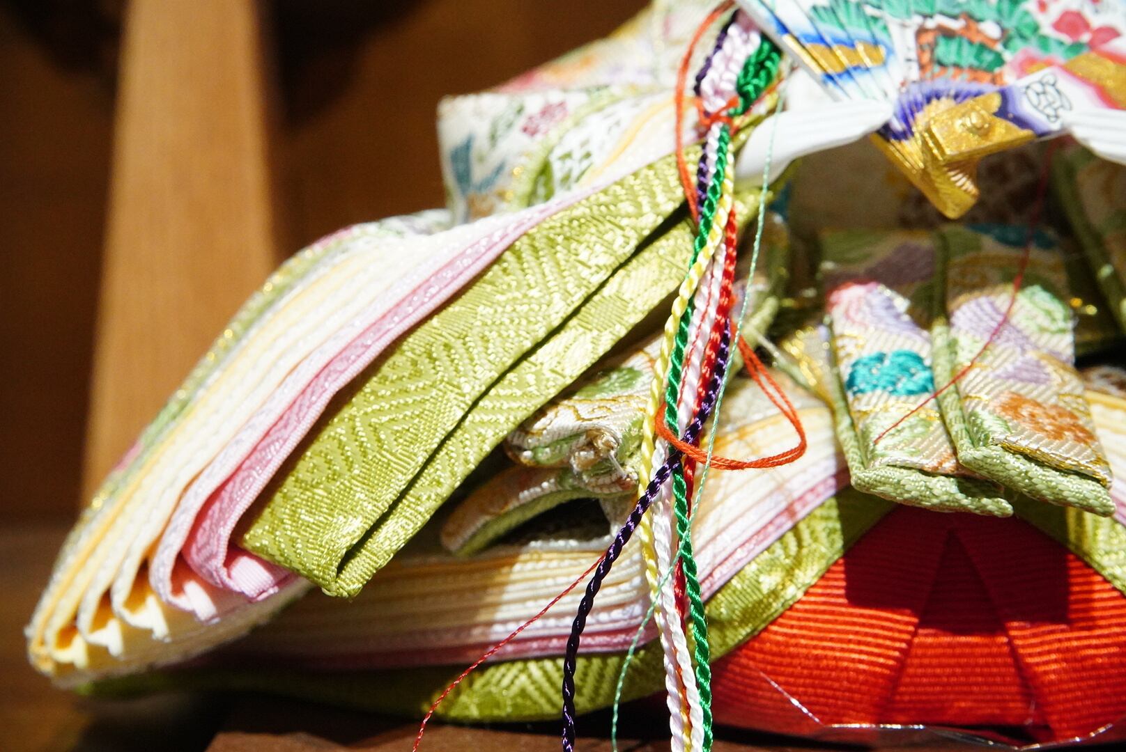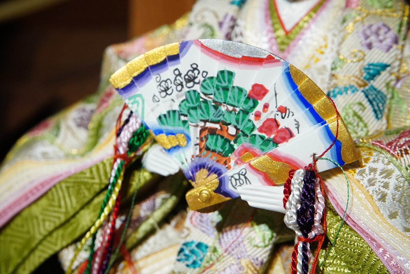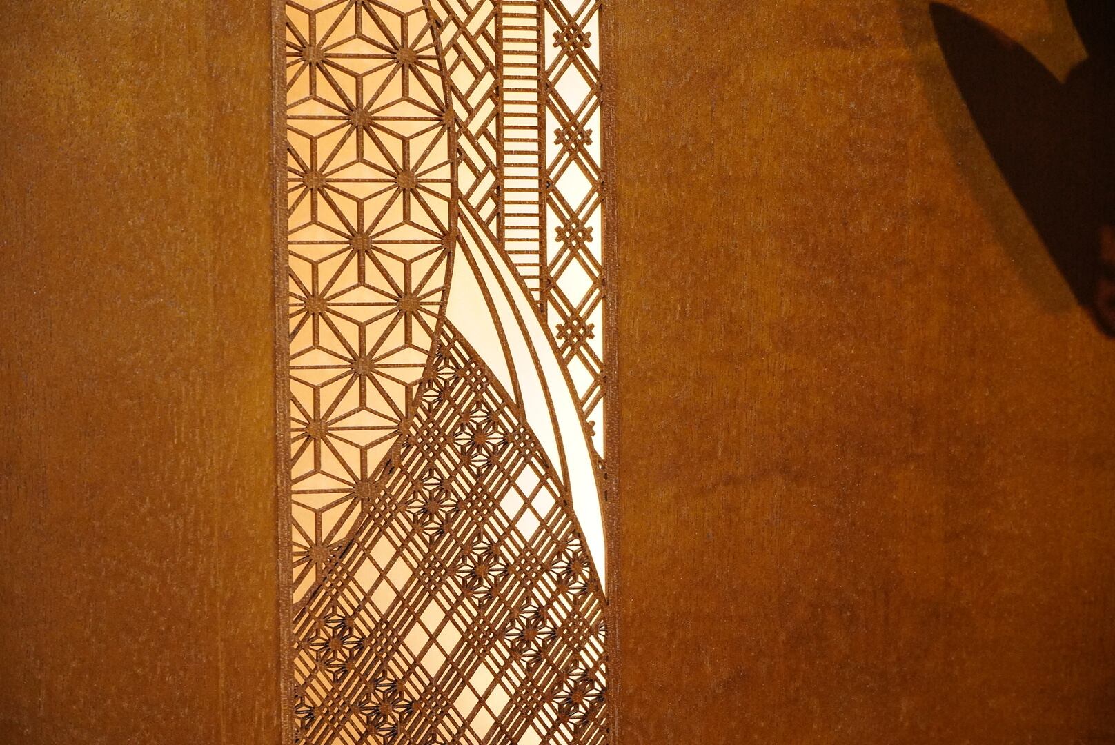 屏風には、伝統文様の麻の葉模様をあしらい、中央には自然の趣を感じさせる木製の花飾りを配置。