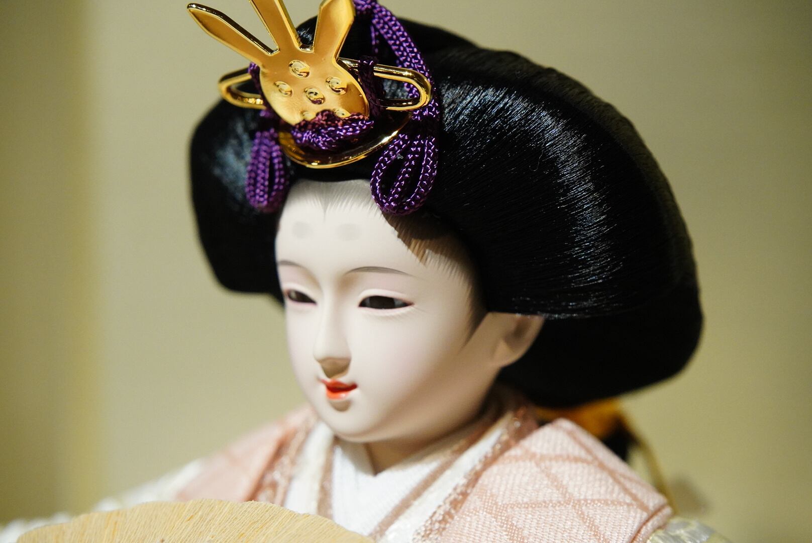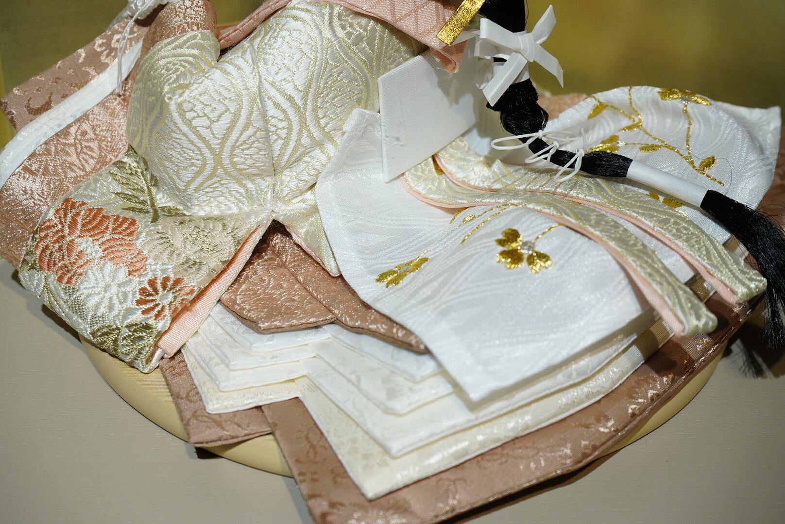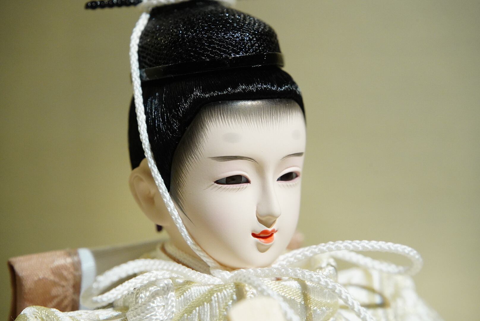 柔らかな生成りと淡桃色の衣装をまとったお内裏様とお雛様が、やさしい光に照らされて静かに佇む親王飾り。