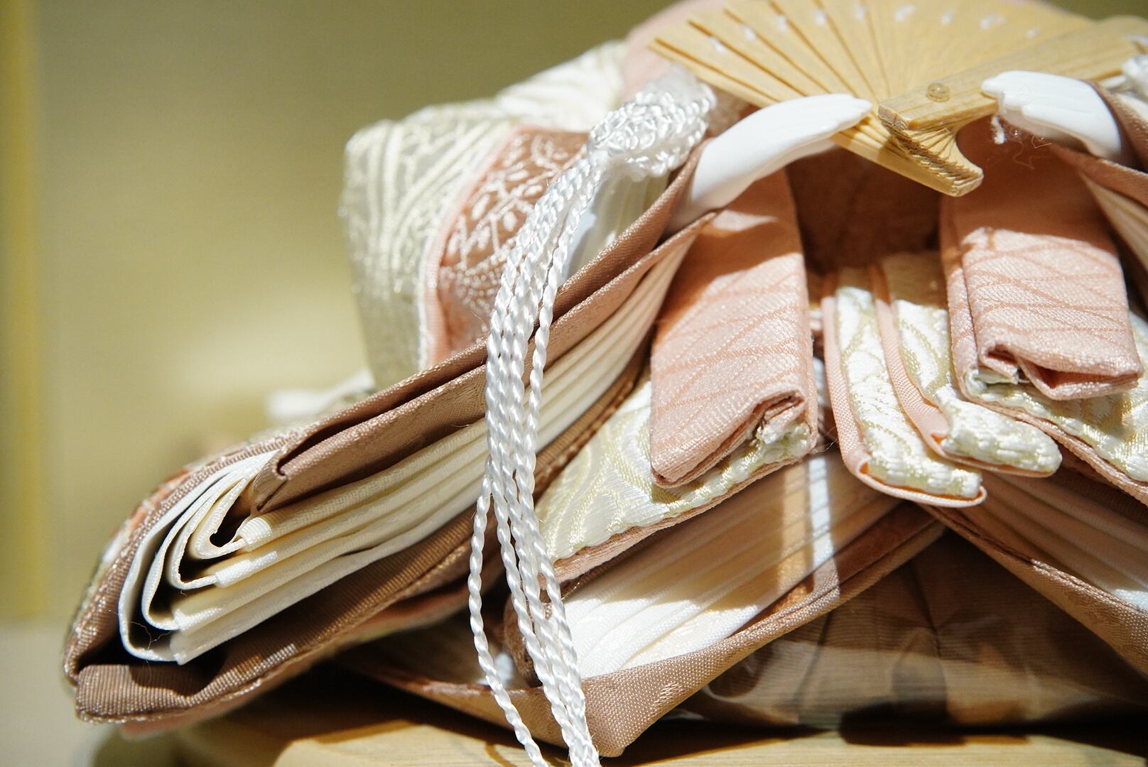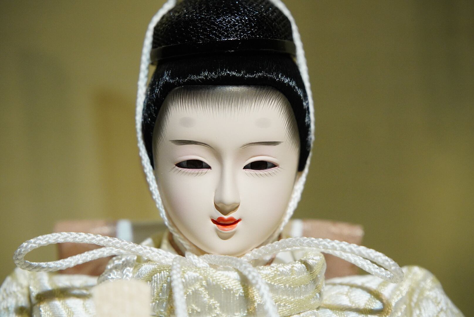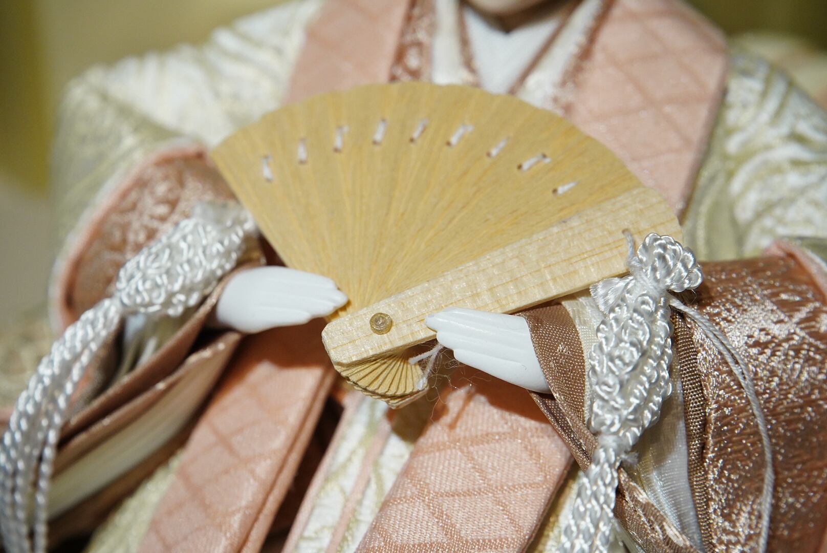 柔らかな生成りと淡桃色の衣装をまとったお内裏様とお雛様が、やさしい光に照らされて静かに佇む親王飾り。
