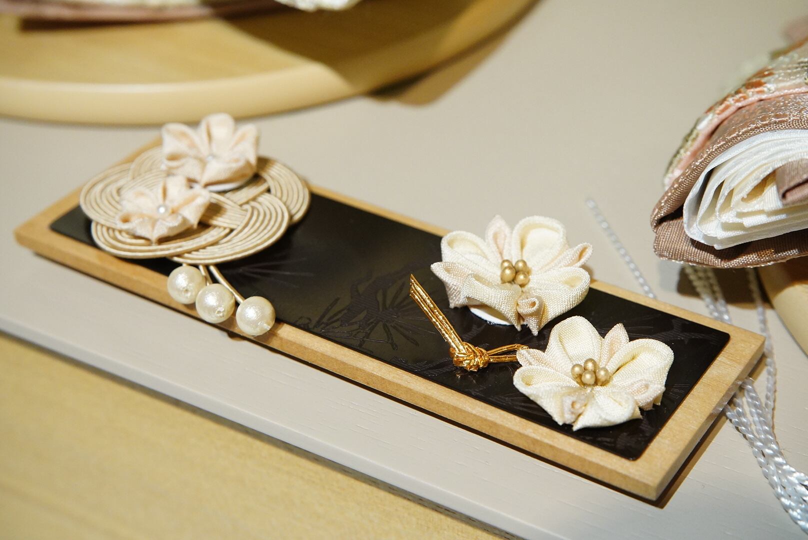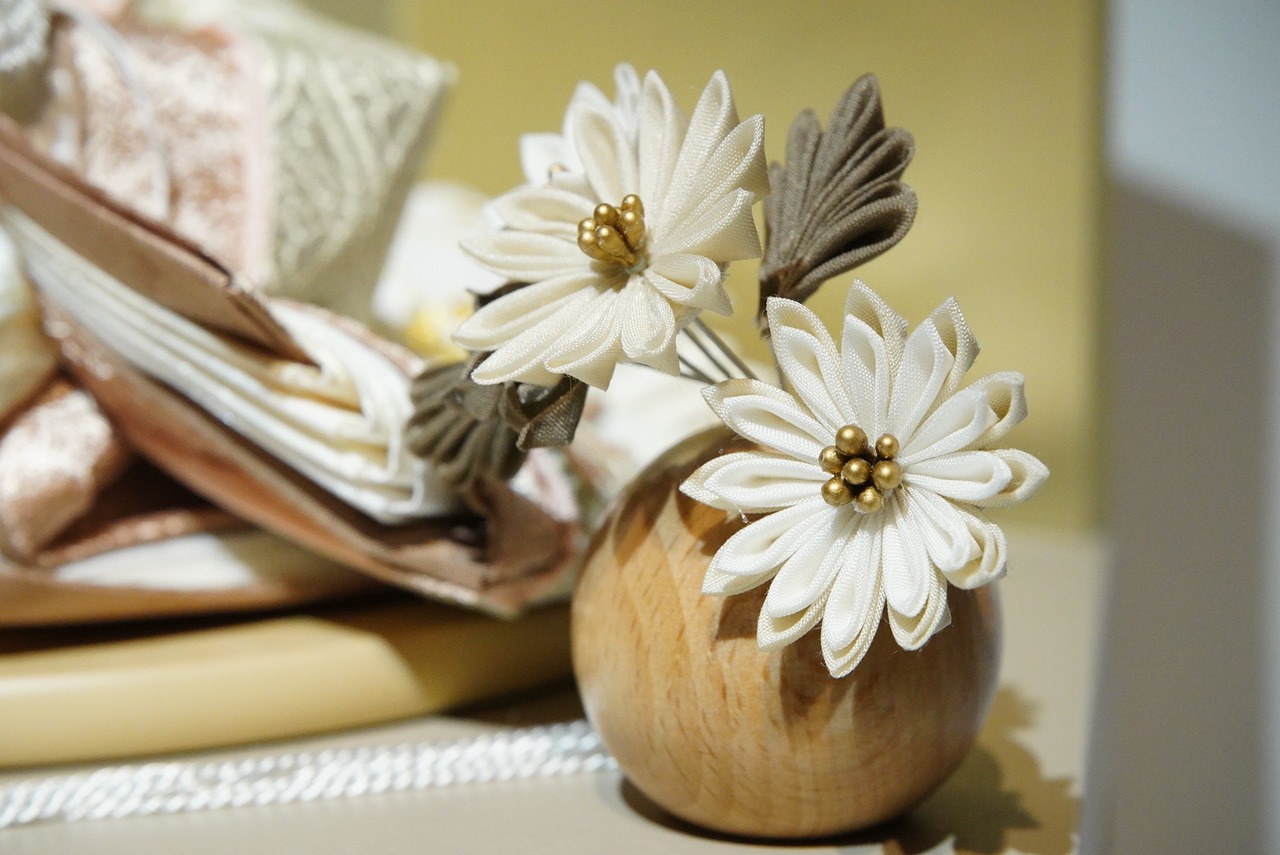 木目の美しい飾り台には可憐な木製のお花飾りを添え、ナチュラルでありながら高級感を感じる優雅なデザインに仕上げました。