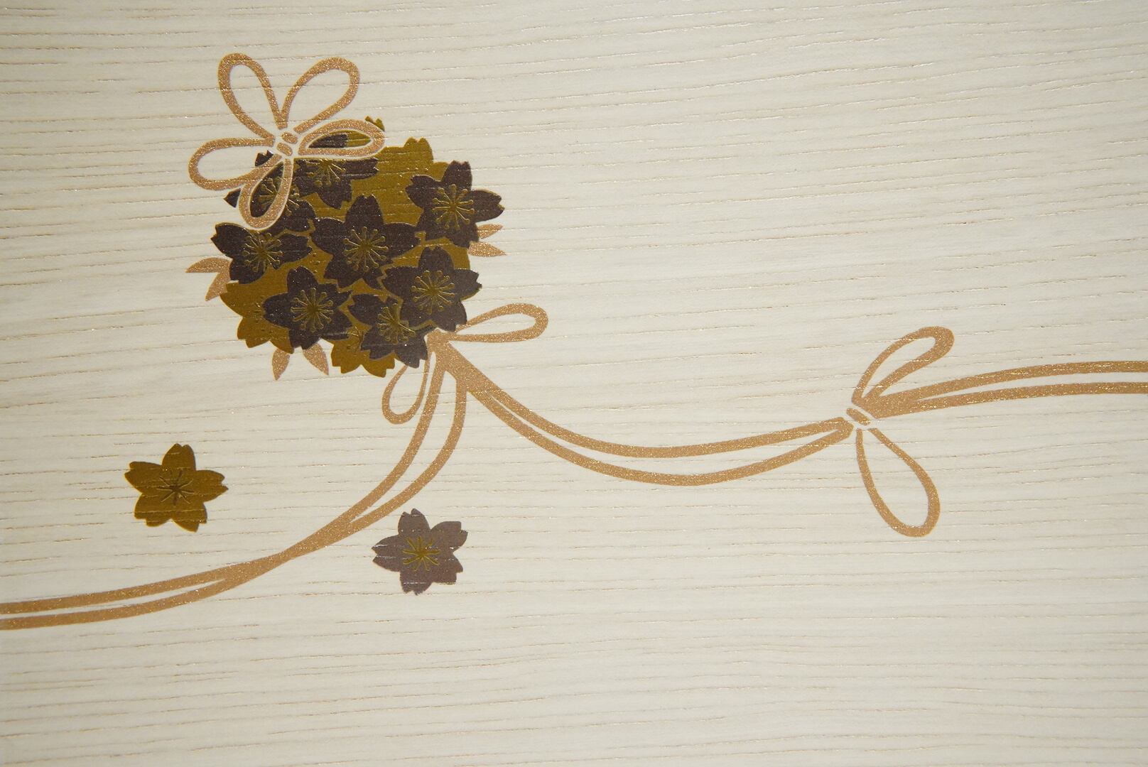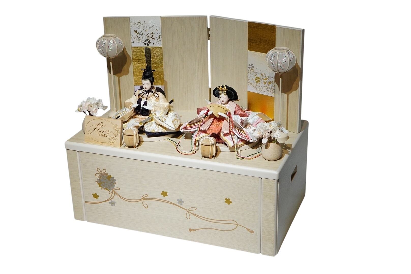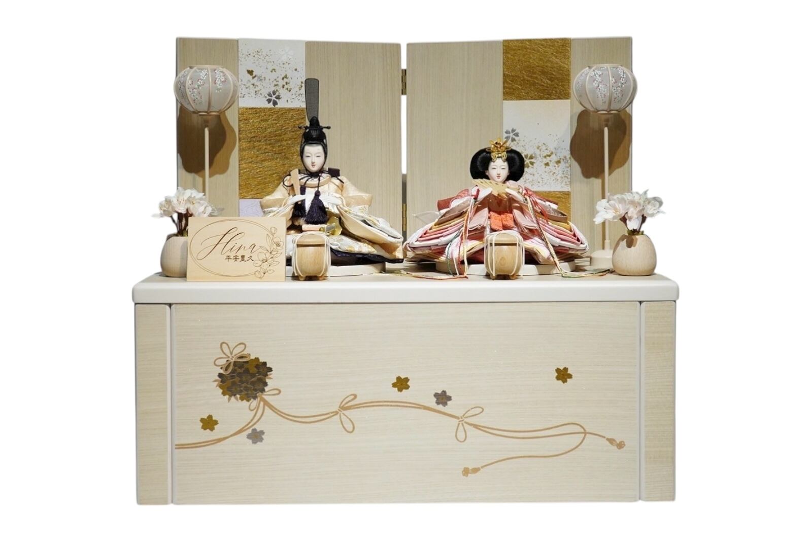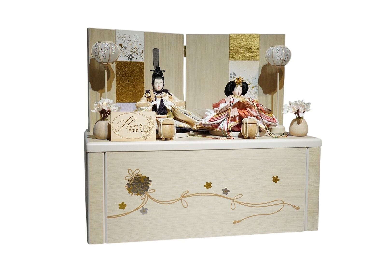 淡い木目の台座に、金彩の桜模様が優雅に描かれた、洗練された雰囲気のひな飾りです。