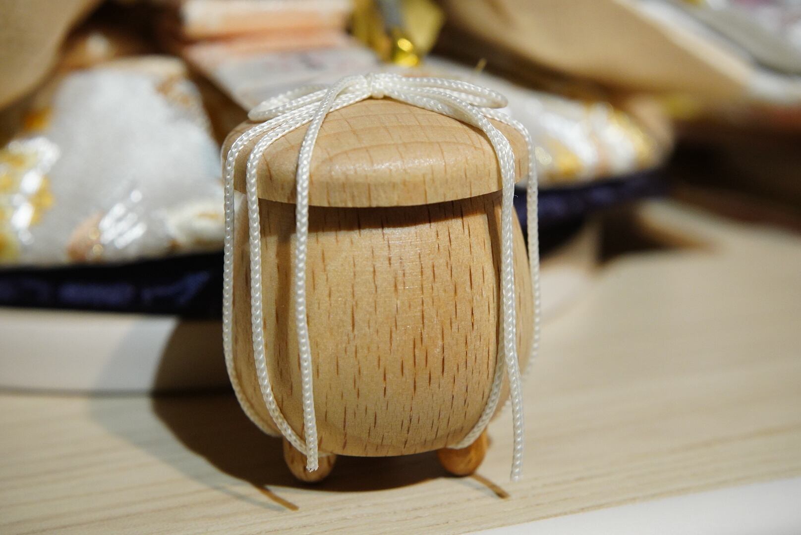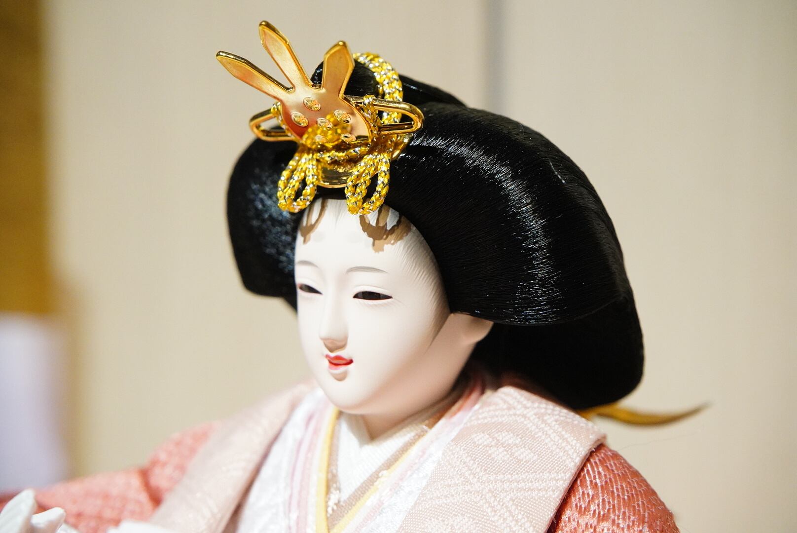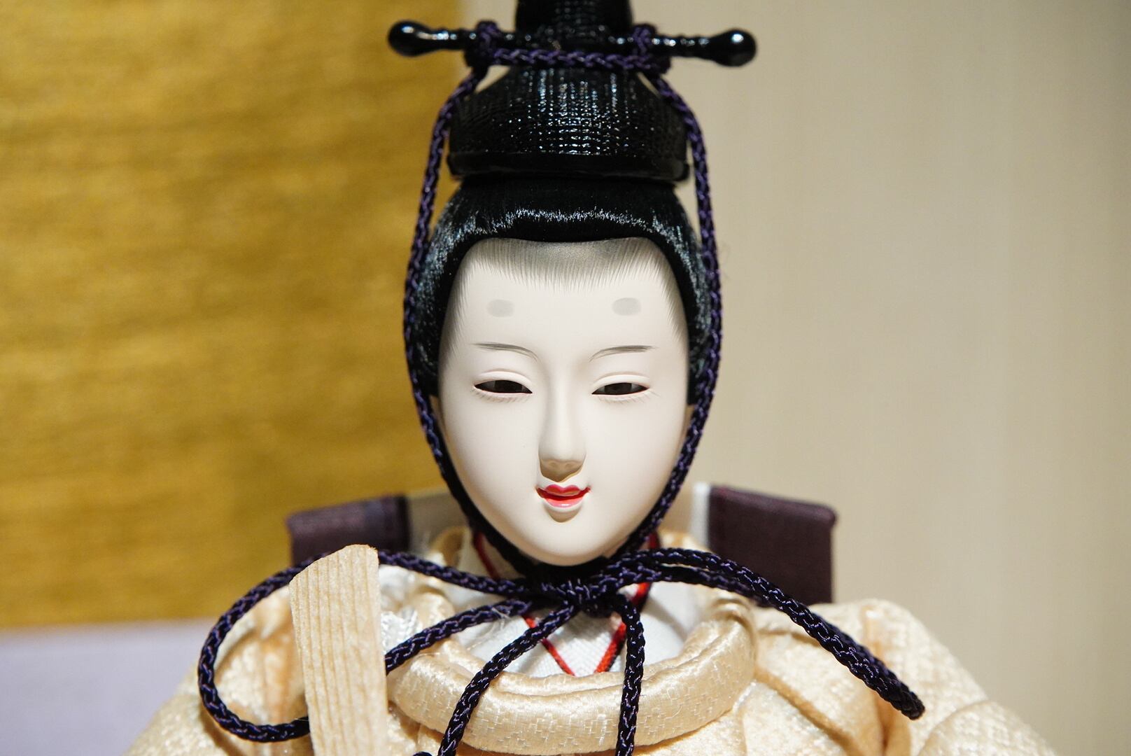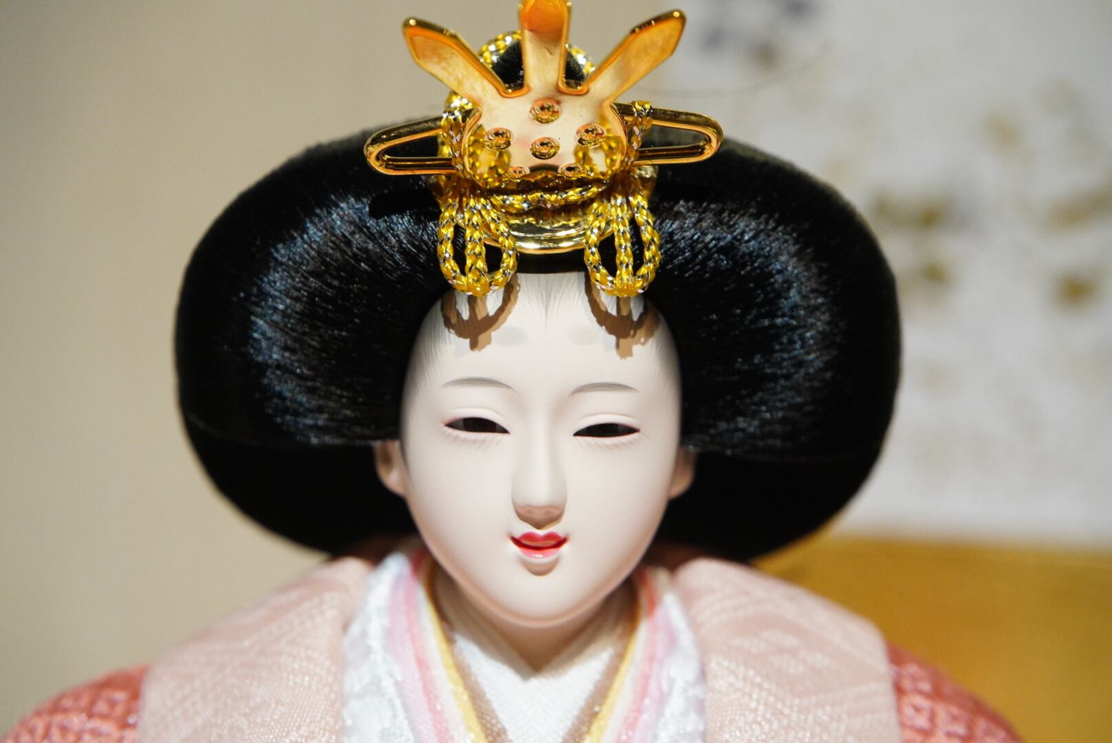 淡い木目の台座に、金彩の桜模様が優雅に描かれた、洗練された雰囲気のひな飾りです。
