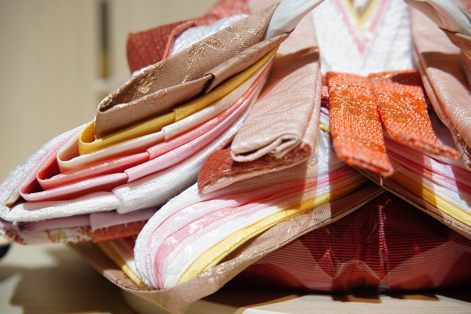 屏風には金箔を思わせる格子模様があしらわれ、華やかさの中にも落ち着いた品格を感じさせます。お内裏様とお雛様は、やさしい生成りと淡紅色を基調とした衣裳をまとい、柔らかな光に包まれるような温もりを演出。