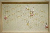 淡い木目の優しい色合いと、品のある金彩模様が調和した上質なひな飾りです。お人形は穏やかな表情と柔らかな衣装の色使いが印象的で、見るたびに心和む華やぎを感じさせます。