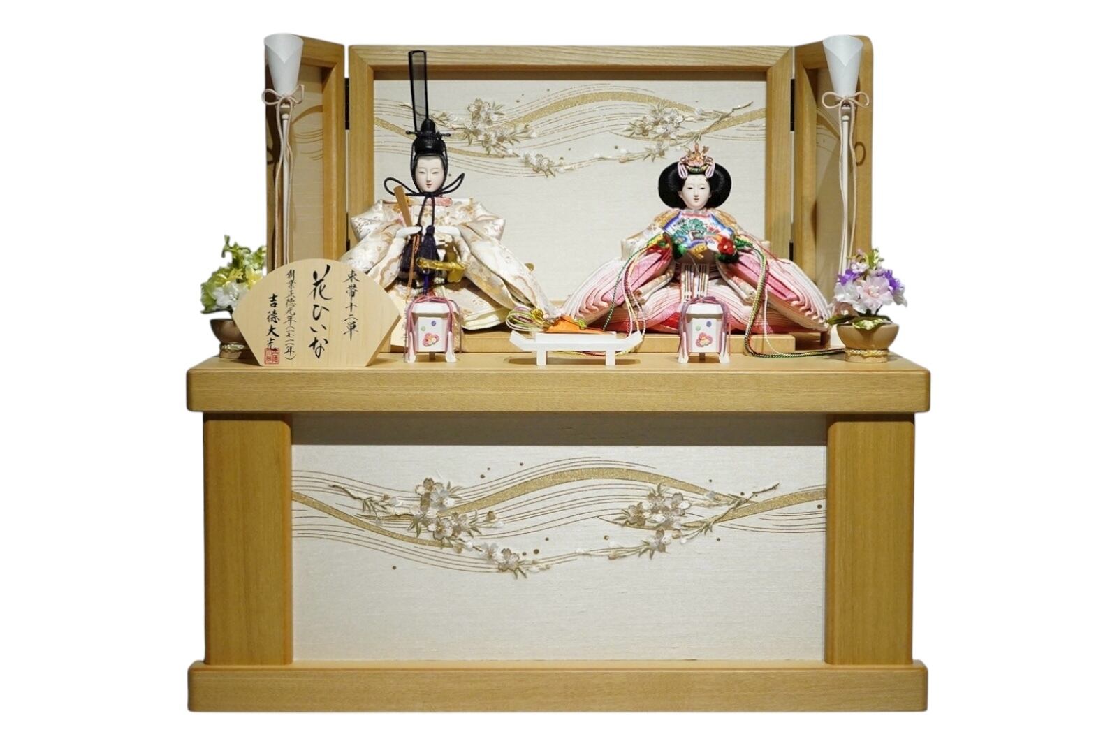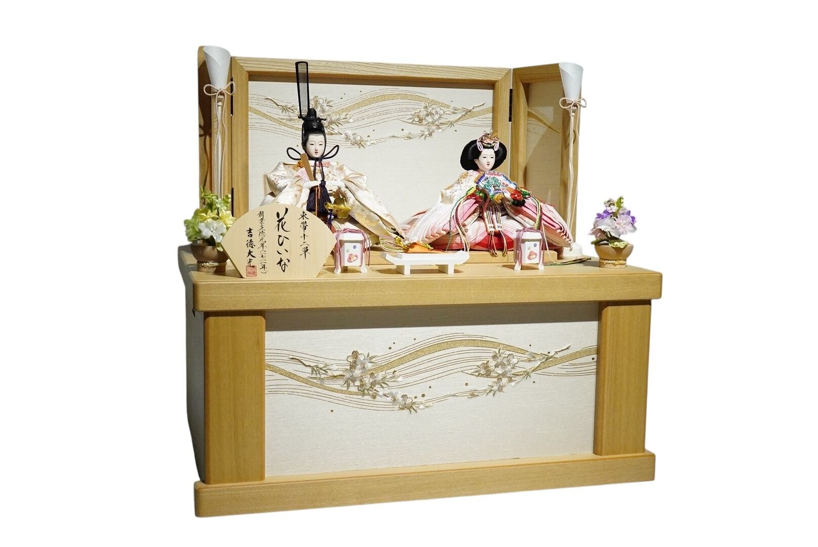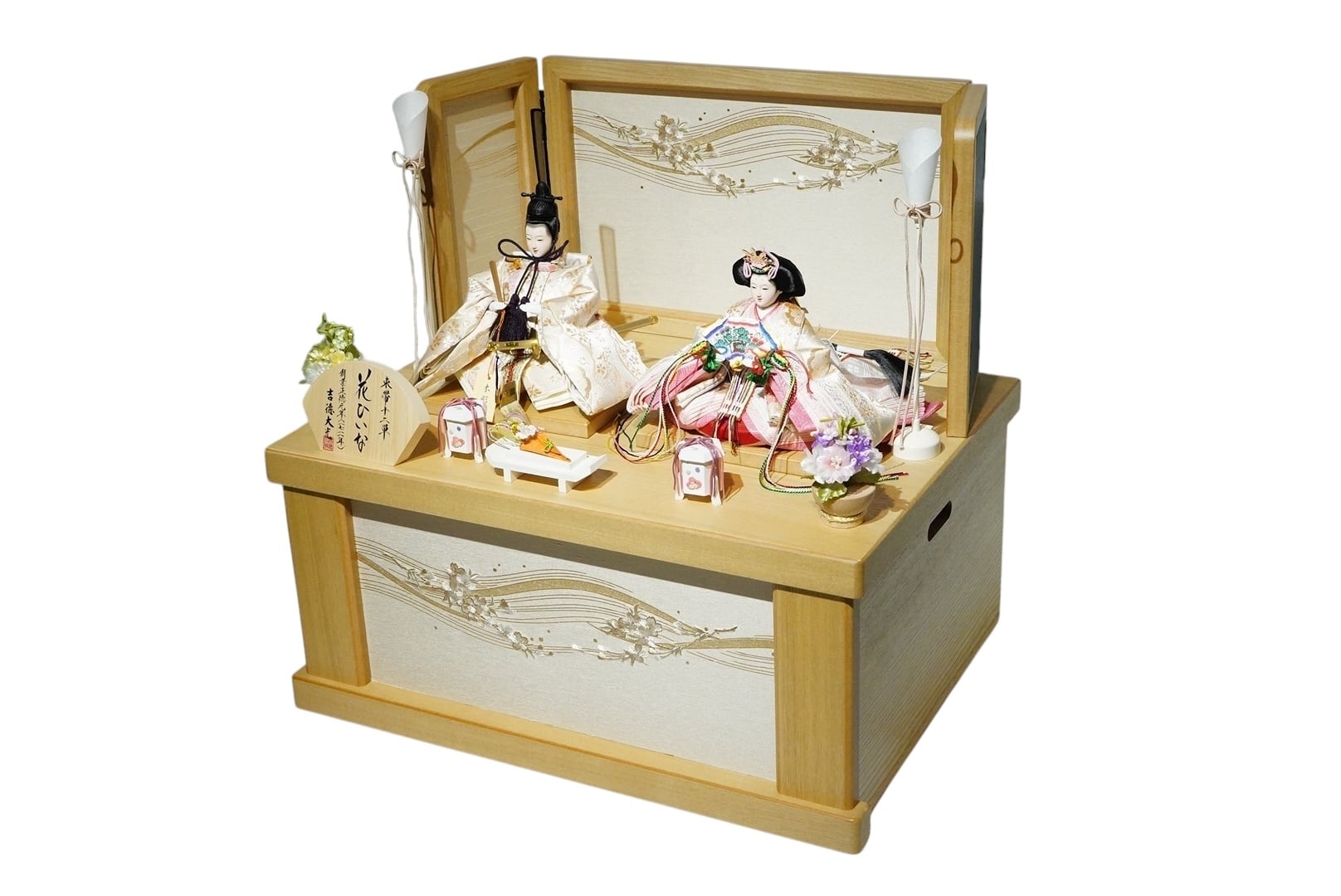 淡い木の色合いと、優しく流れる花模様が調和した、上品であたたかみのある親王収納飾りです。