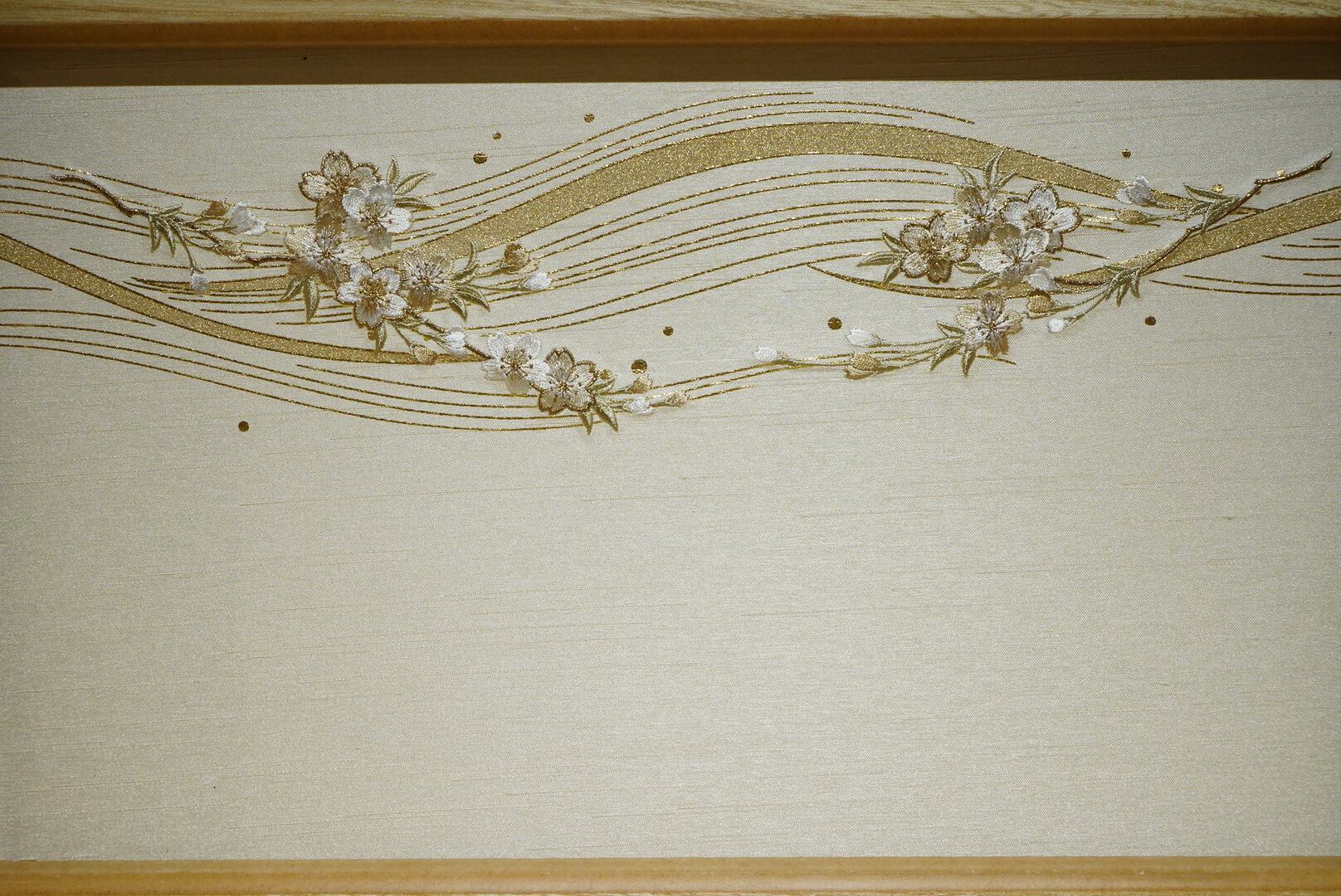 背景と台には、桜の花をモチーフにした立体的な蒔絵風デザインを施し、春の訪れを感じさせる優美な仕上がりに。ナチュラルな木目が空間にやさしく溶け込み、現代のインテリアにも自然に馴染みます。