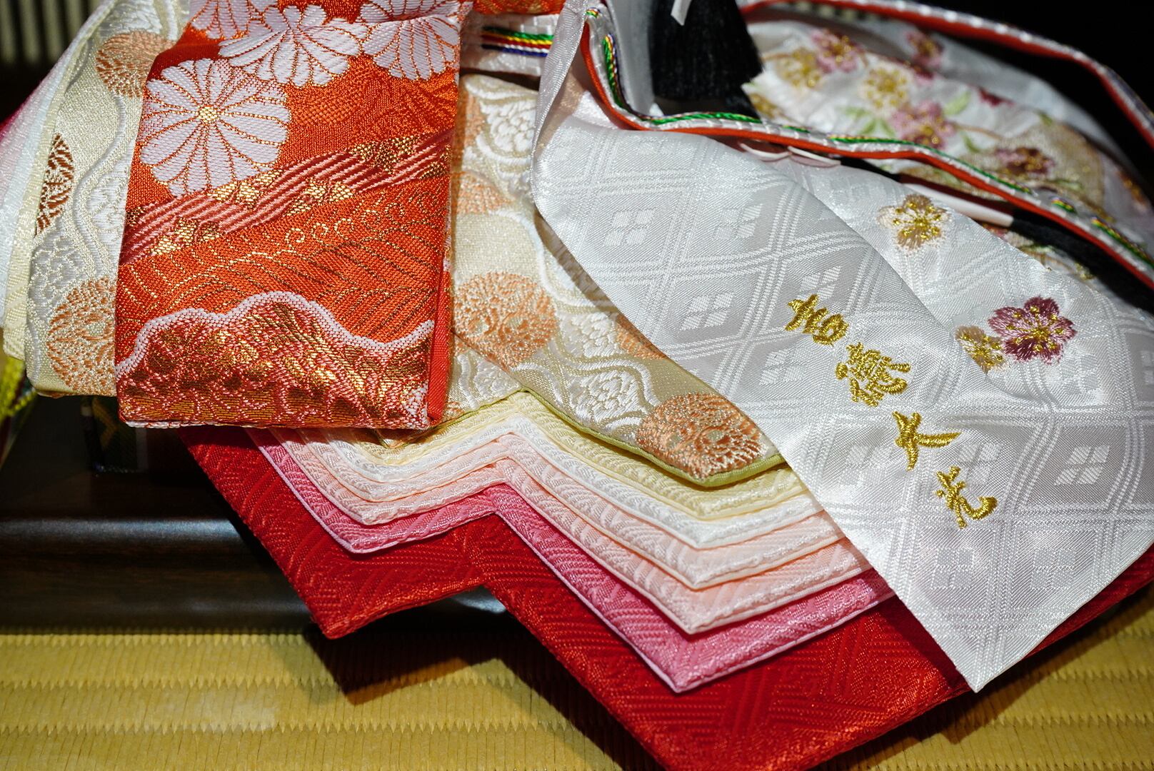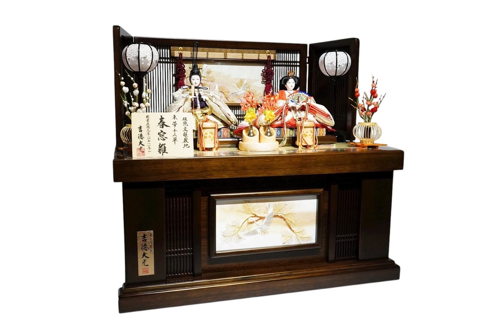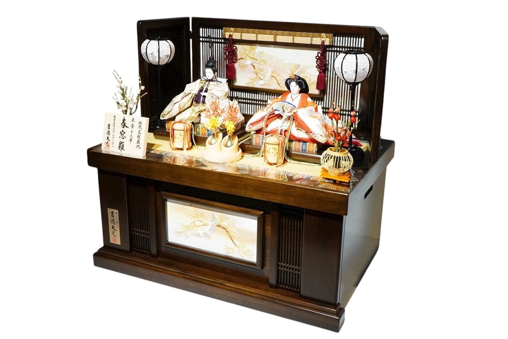 深みのある木目が美しい飾り台に、金彩で描かれた松と鶴の刺繍が華やぎを添える親王収納飾り。