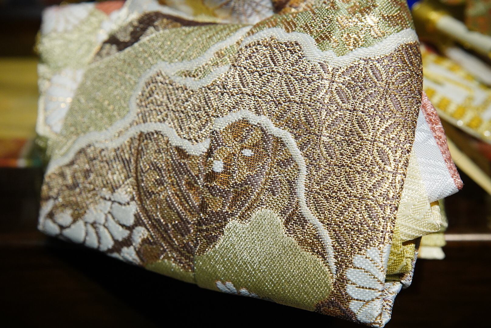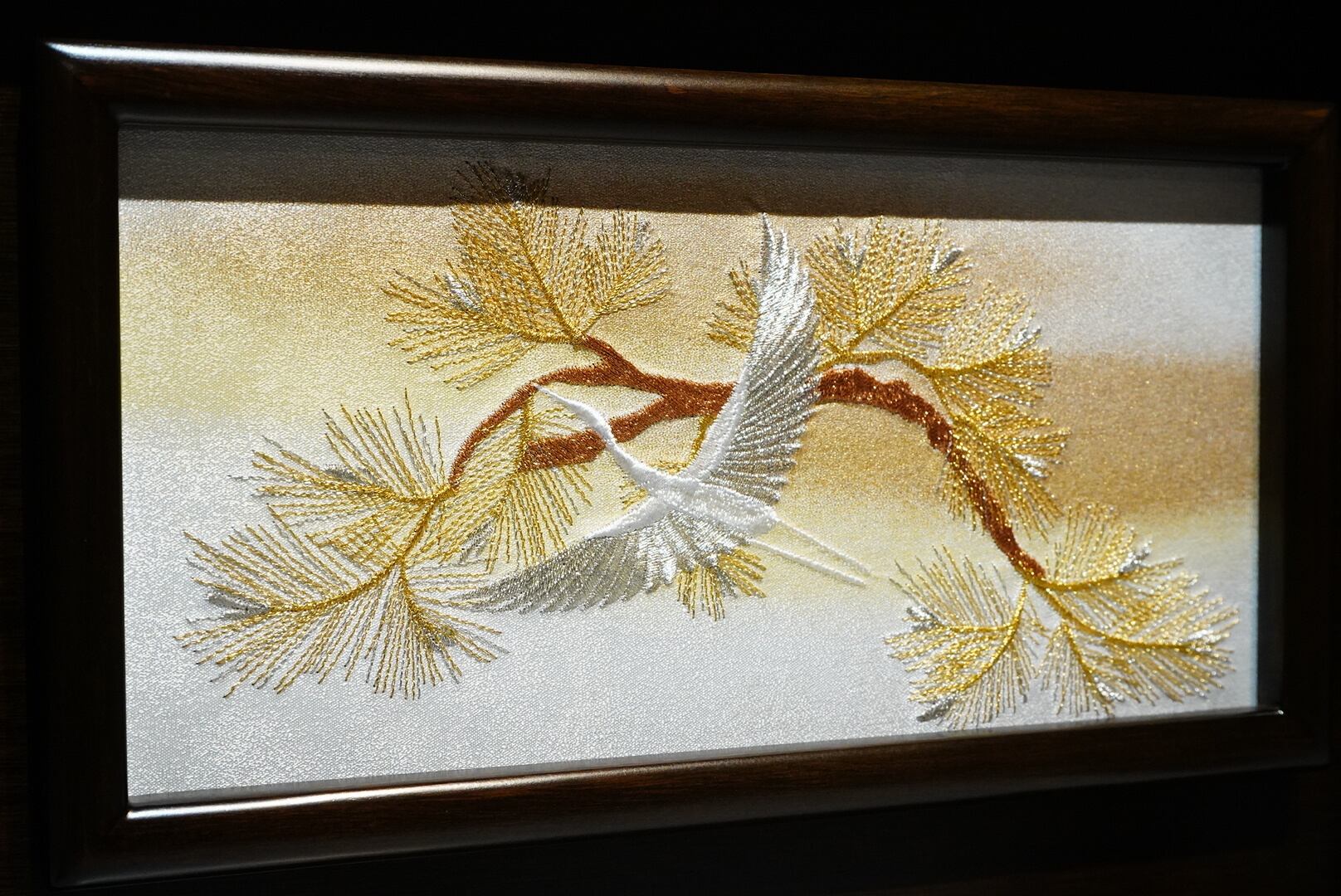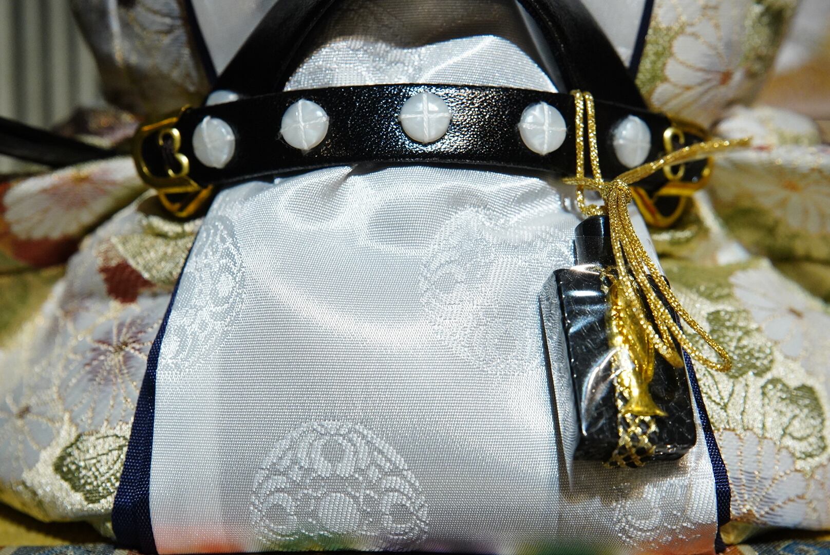 深みのある木目が美しい飾り台に、金彩で描かれた松と鶴の刺繍が華やぎを添える親王収納飾り。