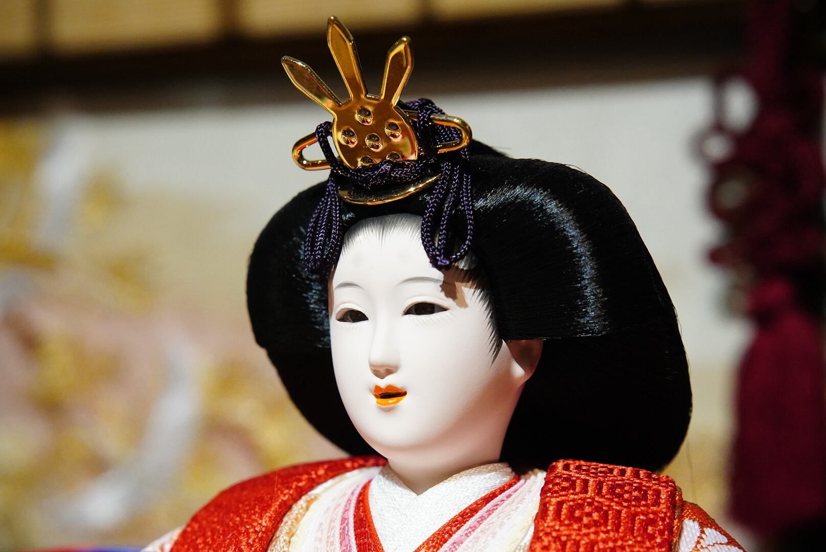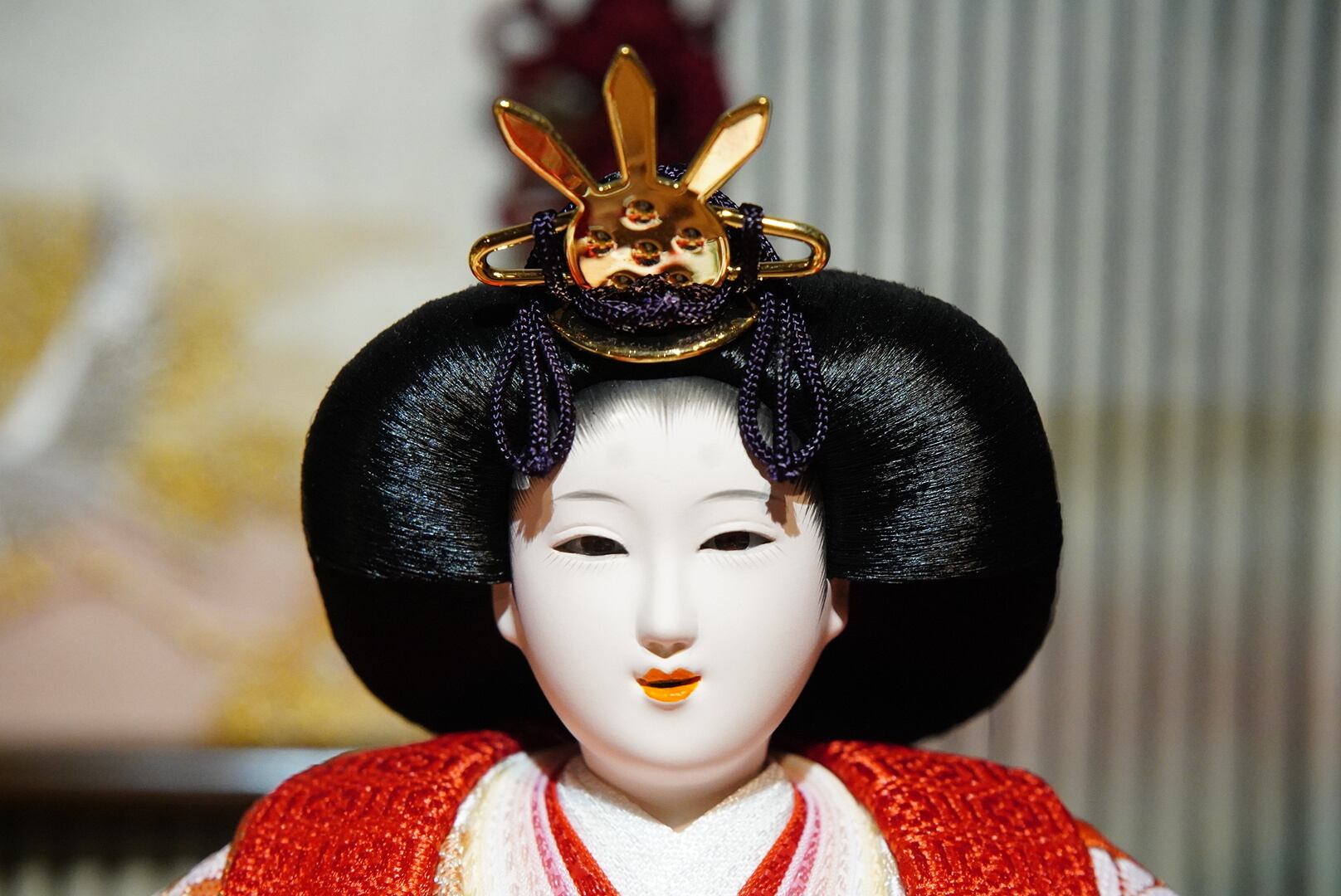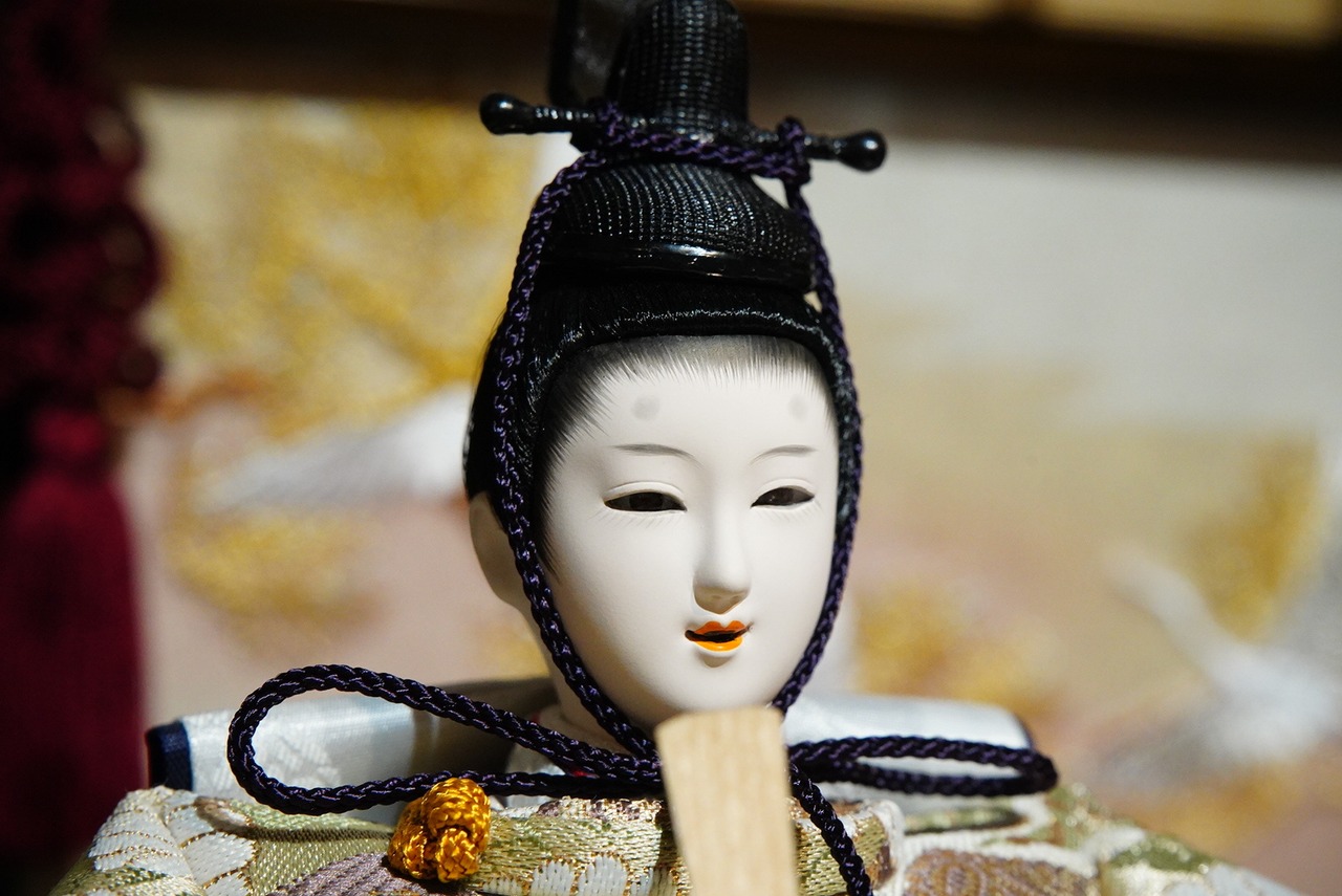 お内裏様・お雛様は、柔らかな光沢を持つ衣裳に包まれ、凛とした表情が格調高い存在感を放ちます。