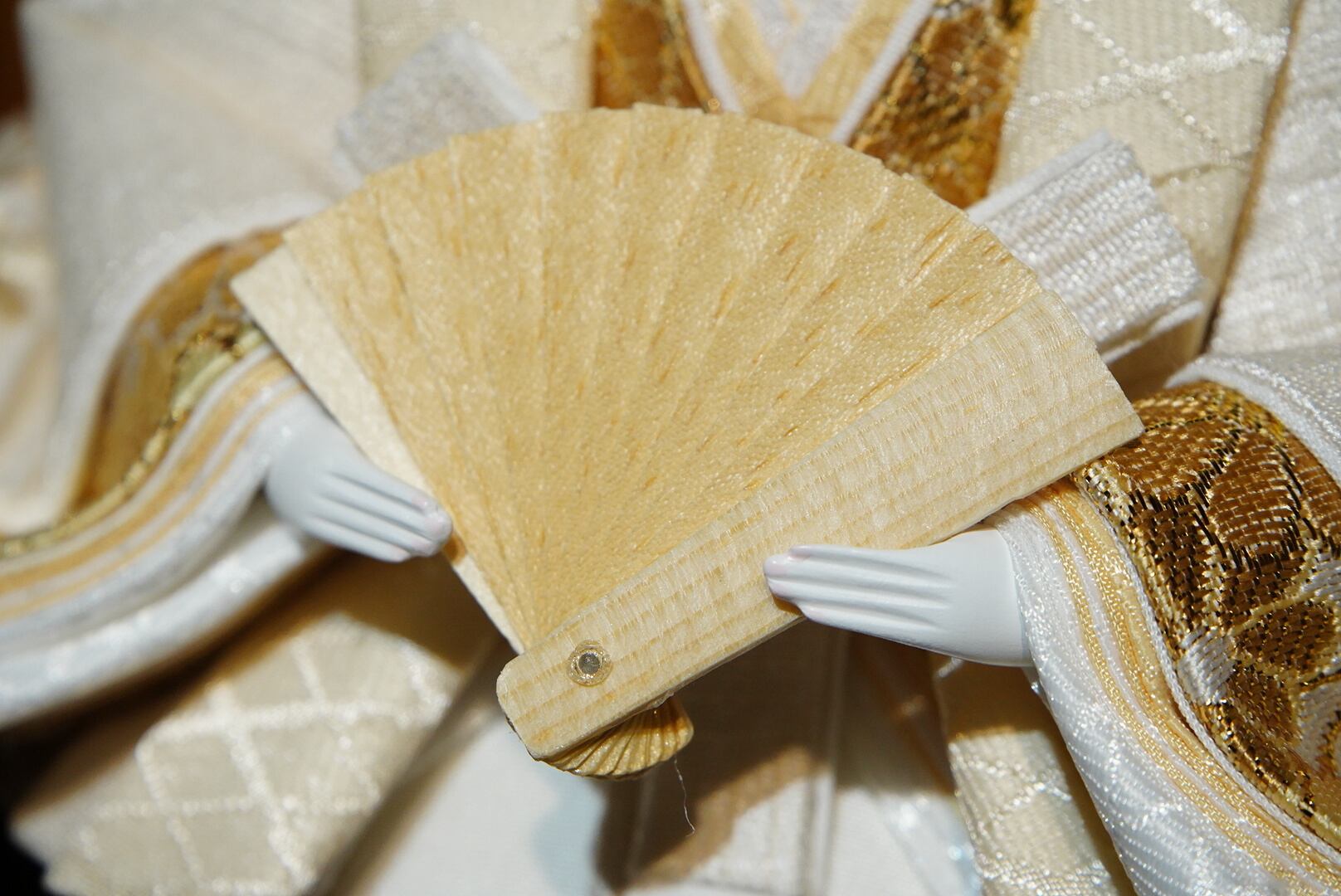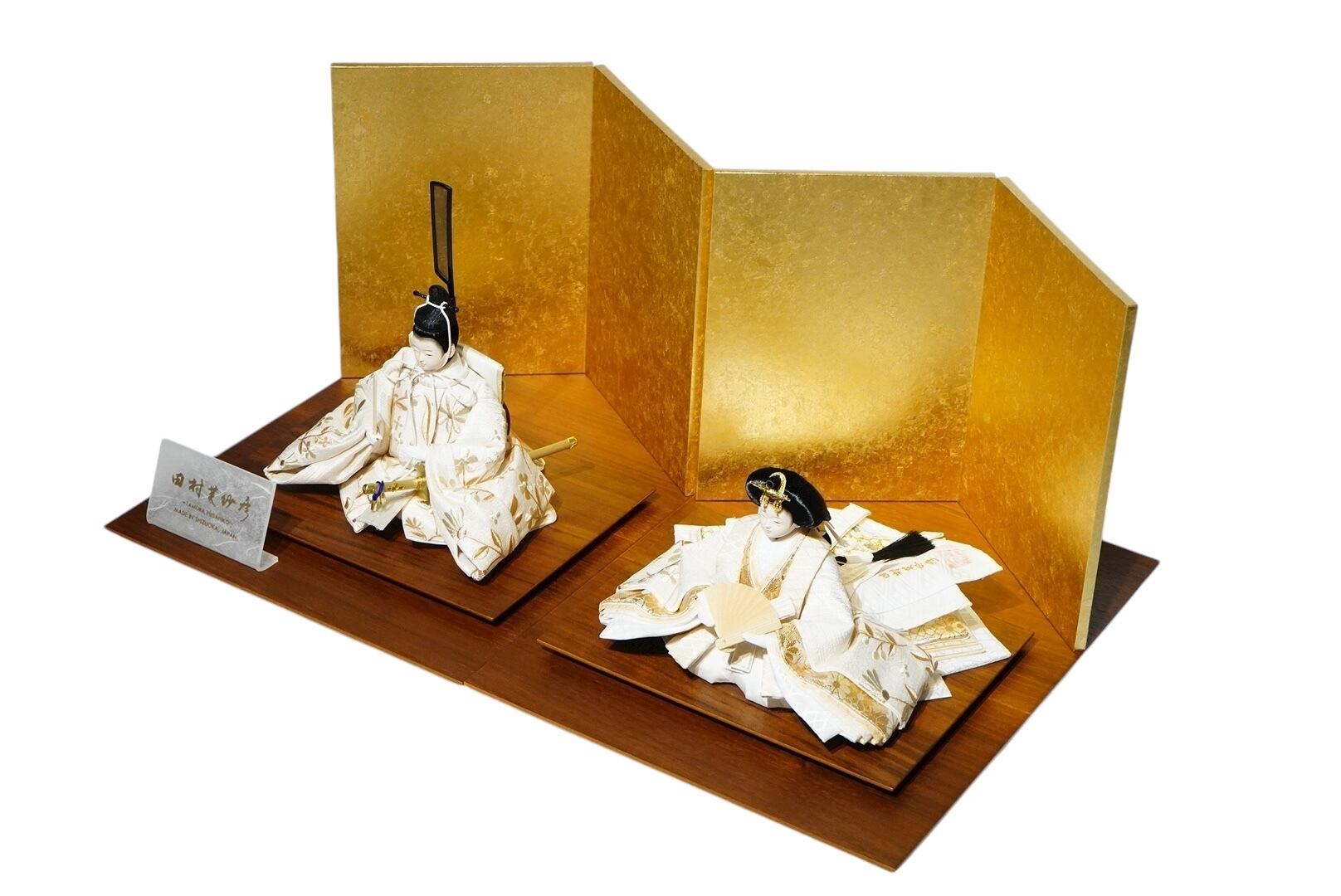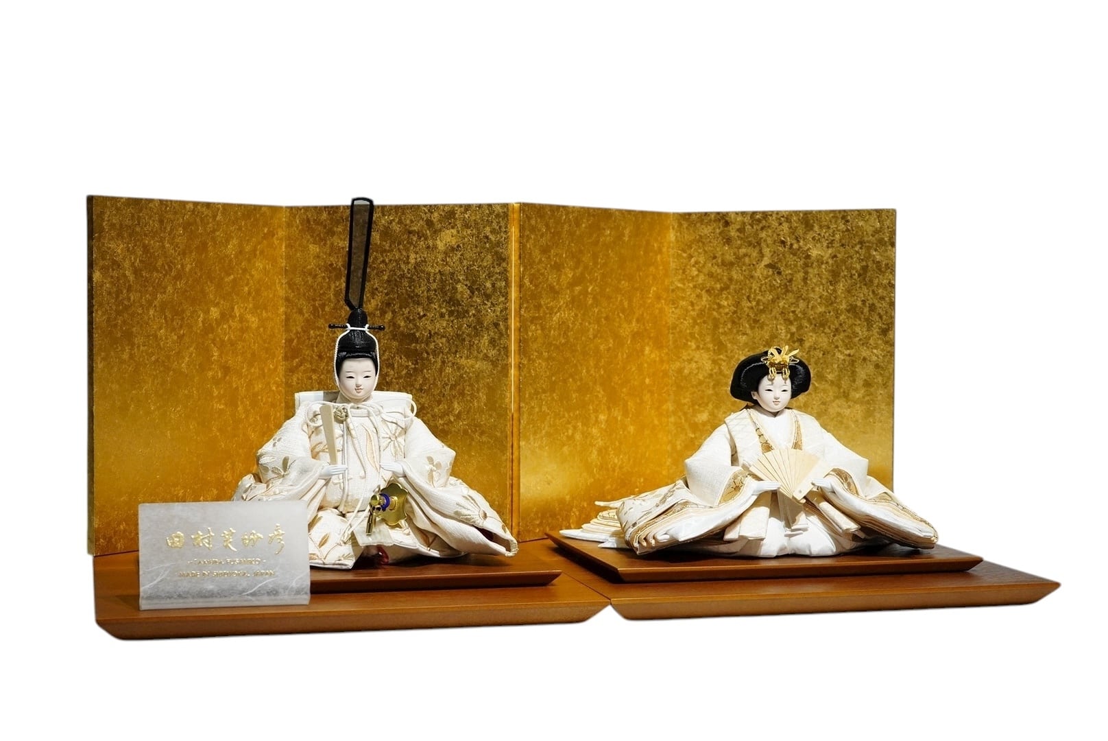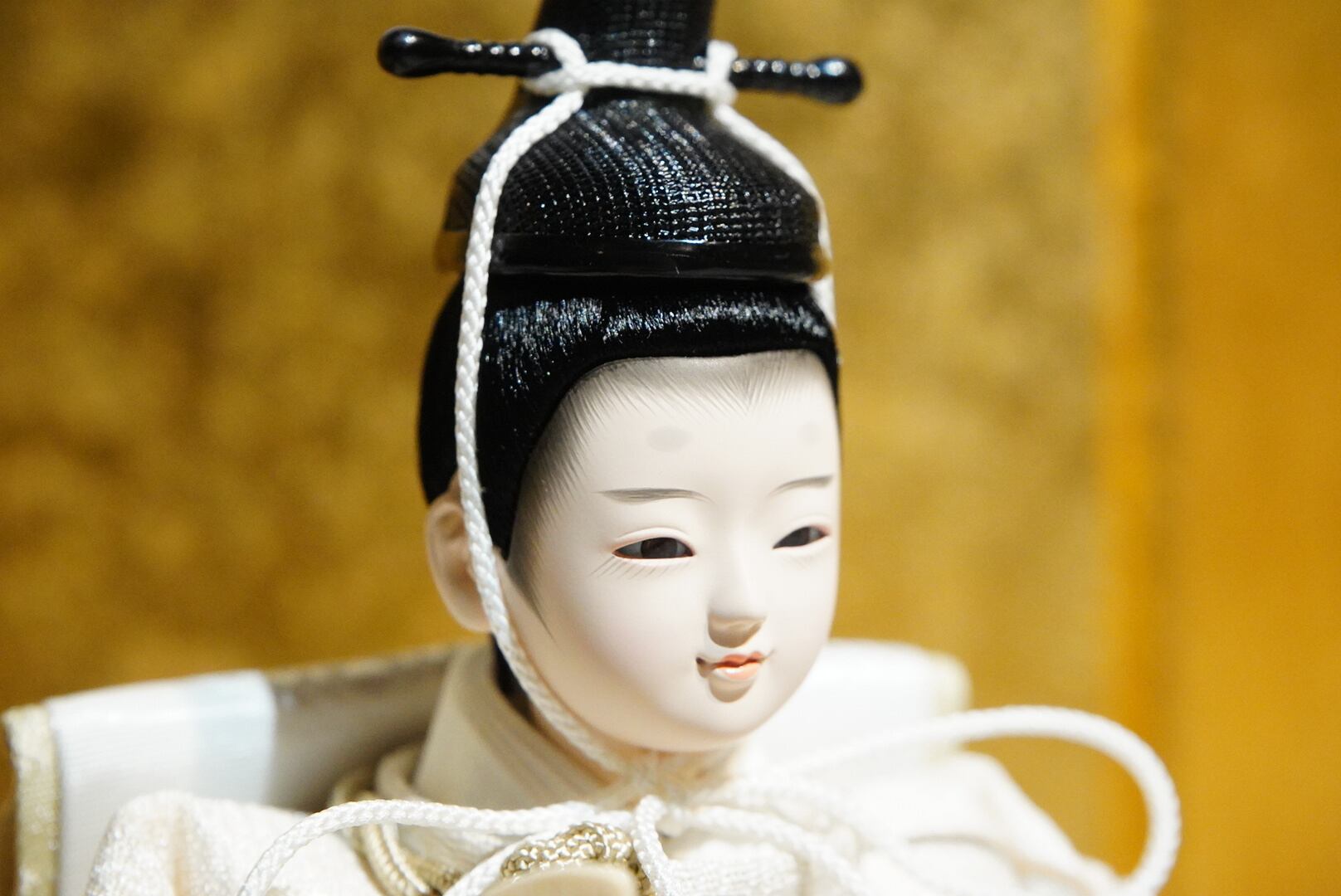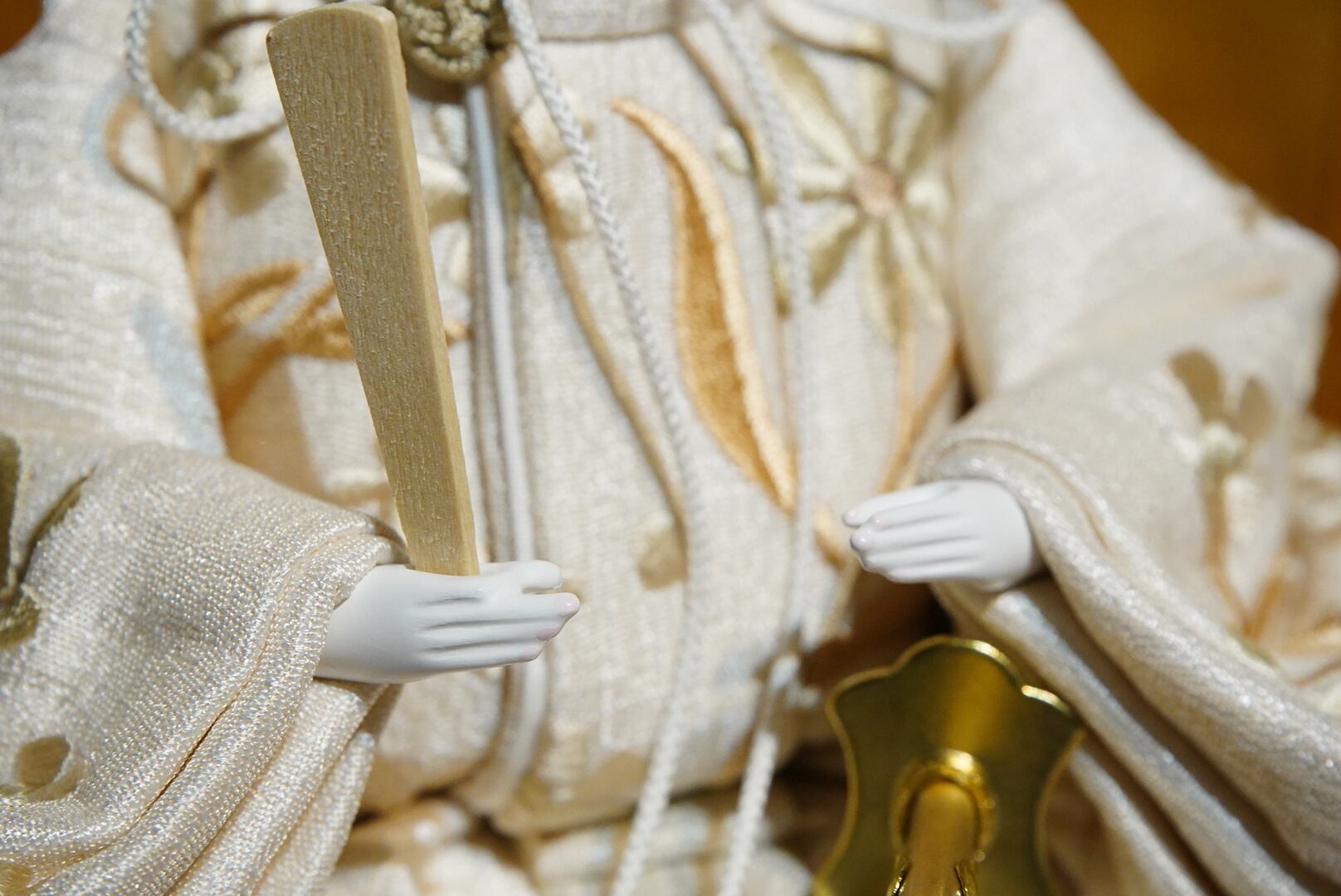 柔らかな白を基調とした衣装に、金の差し色が上品に映える親王飾りです。