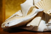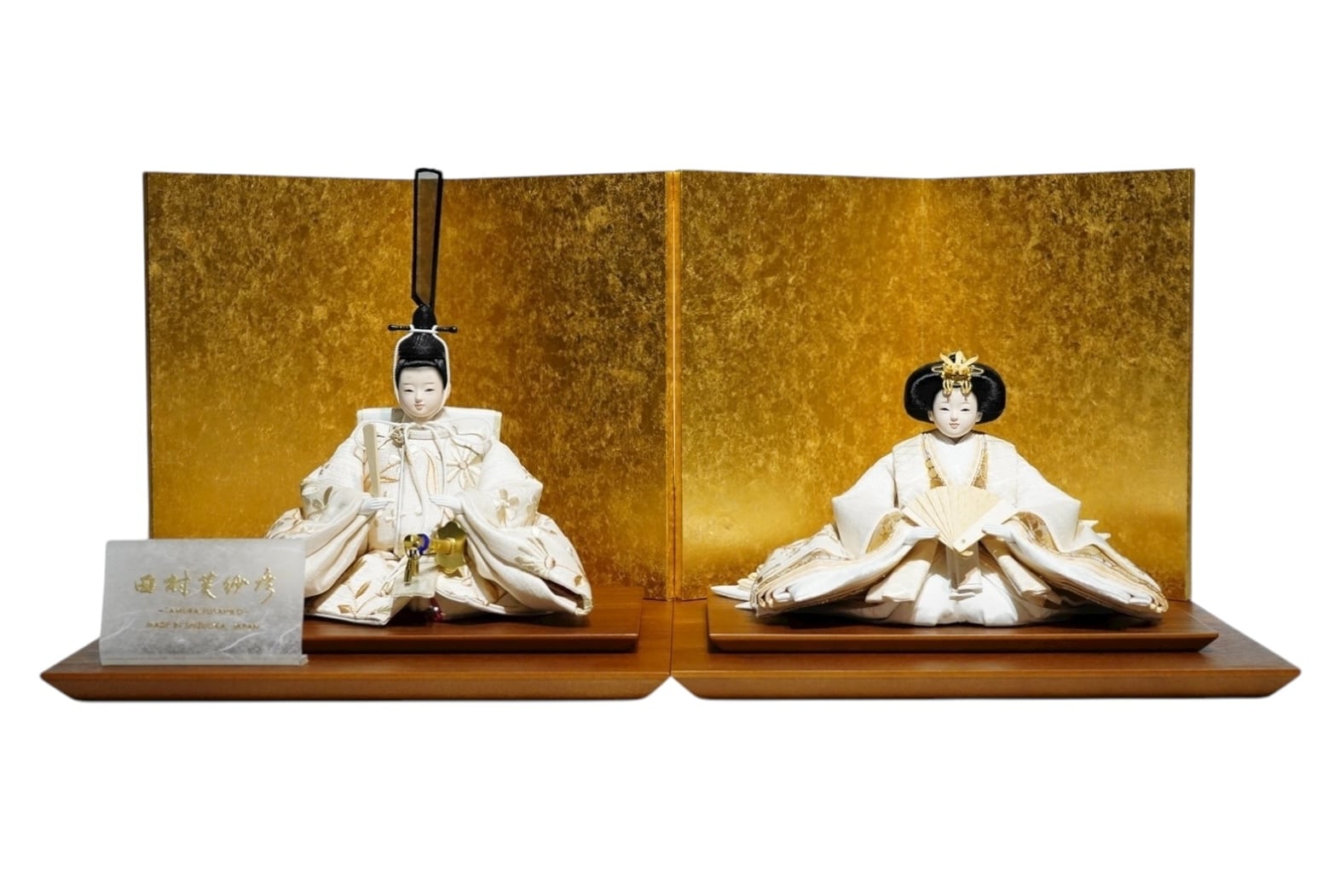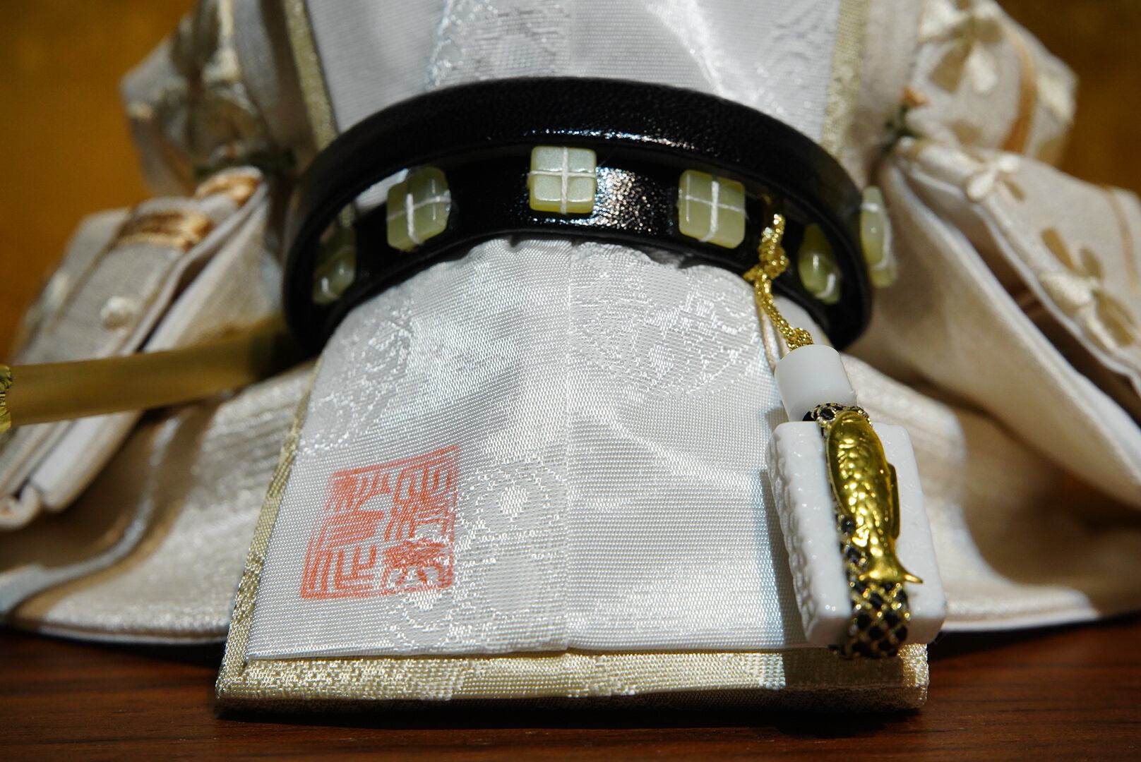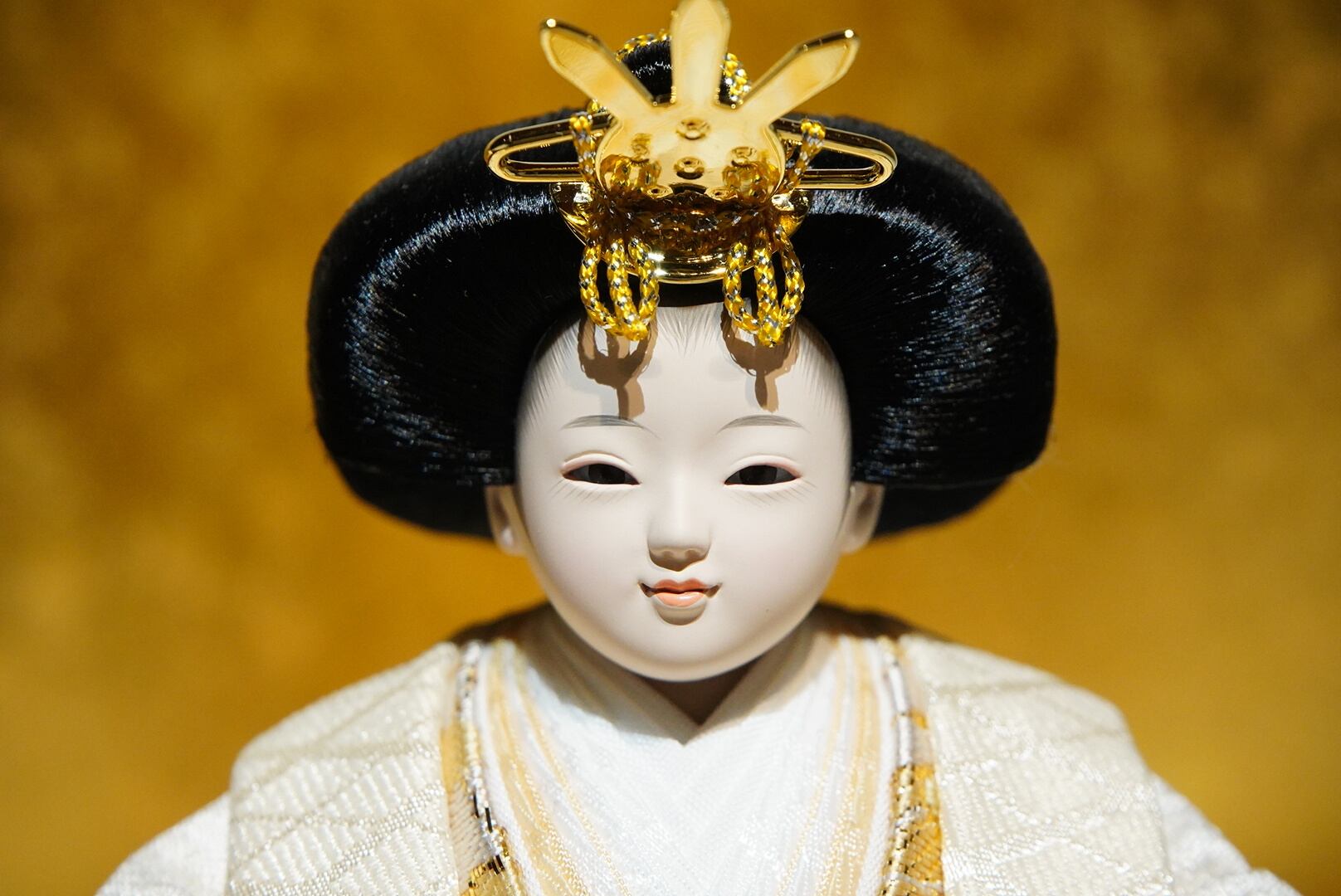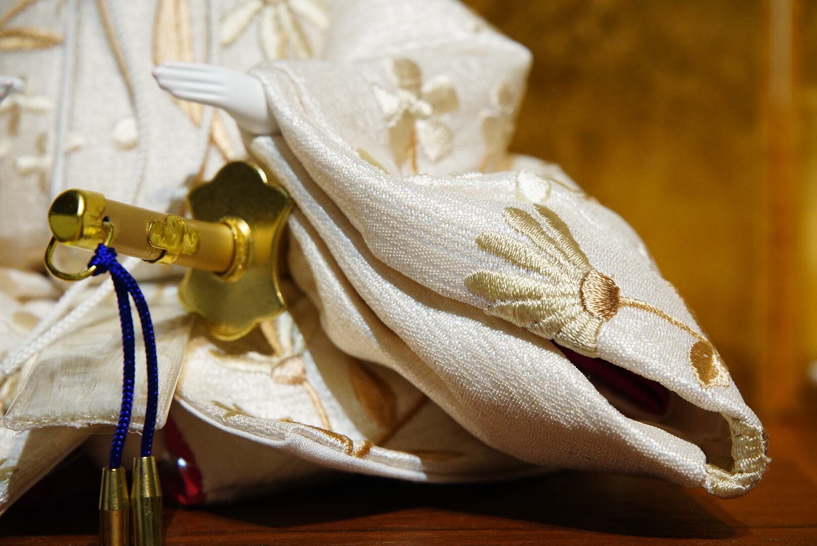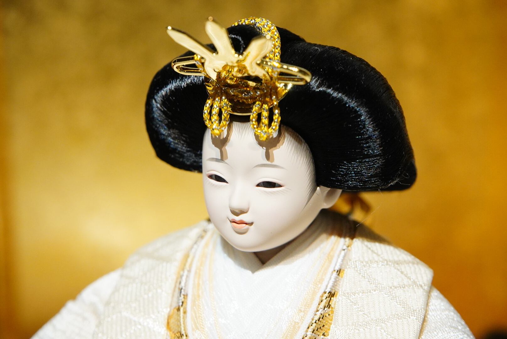 柔らかな白を基調とした衣装に、金の差し色が上品に映える親王飾りです。