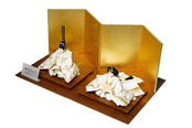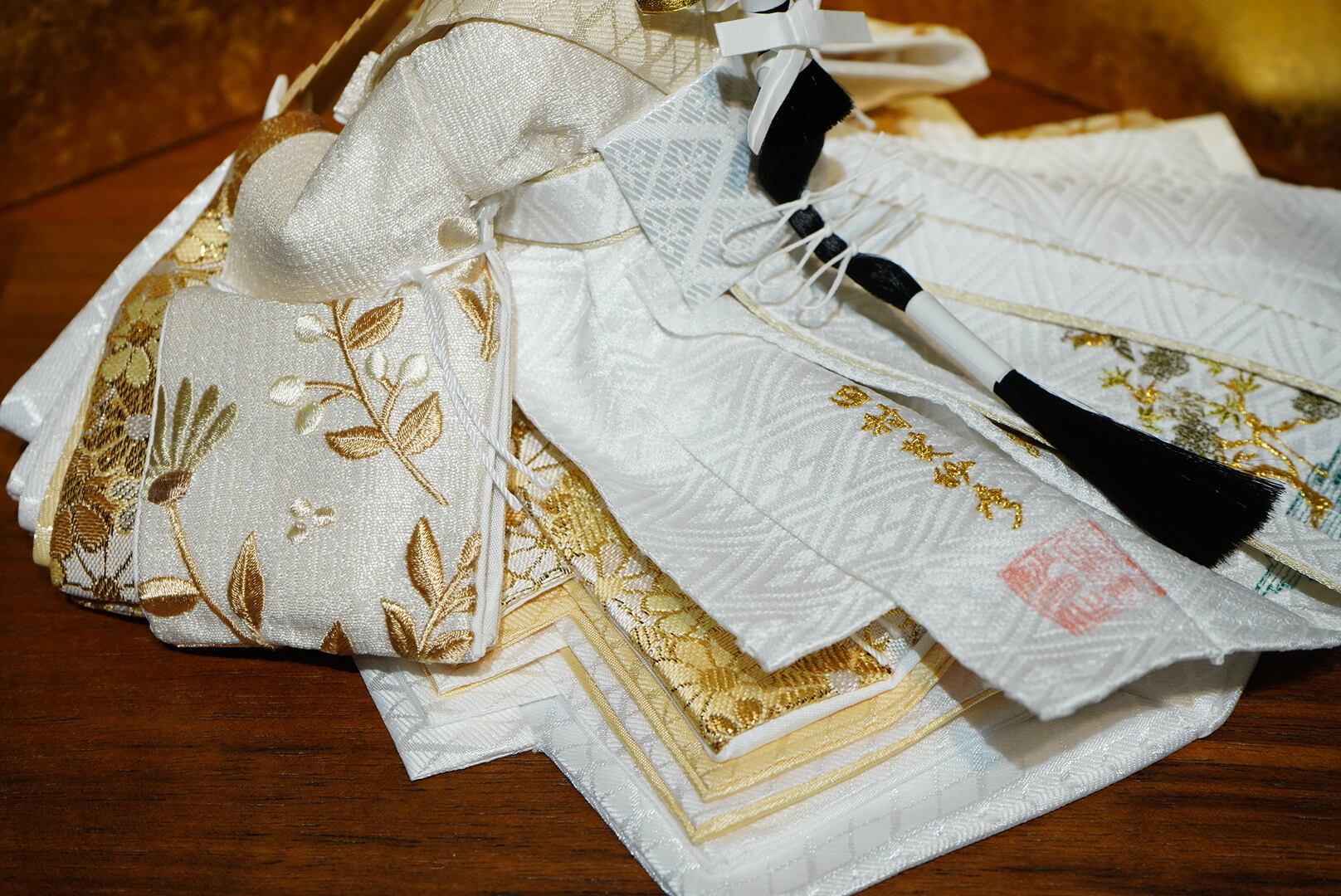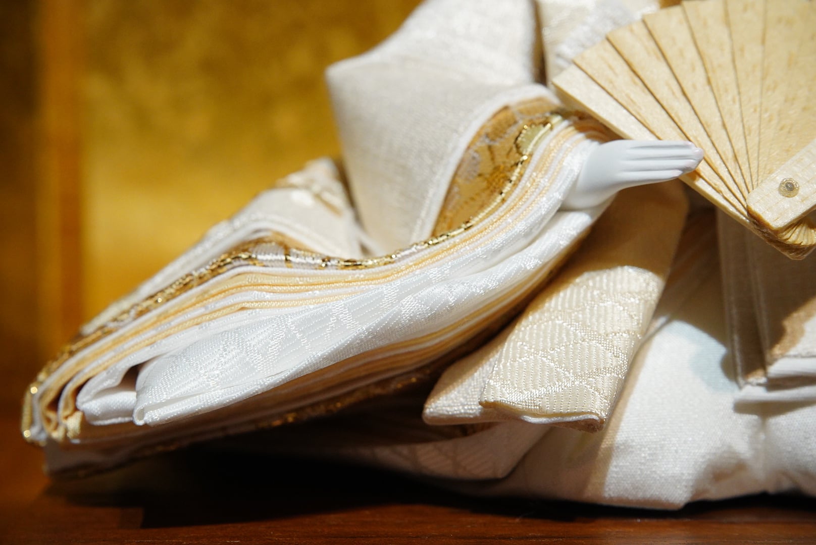 背景には、深みのある金屏風を合わせ、光を受けてあたたかに輝く装いに。