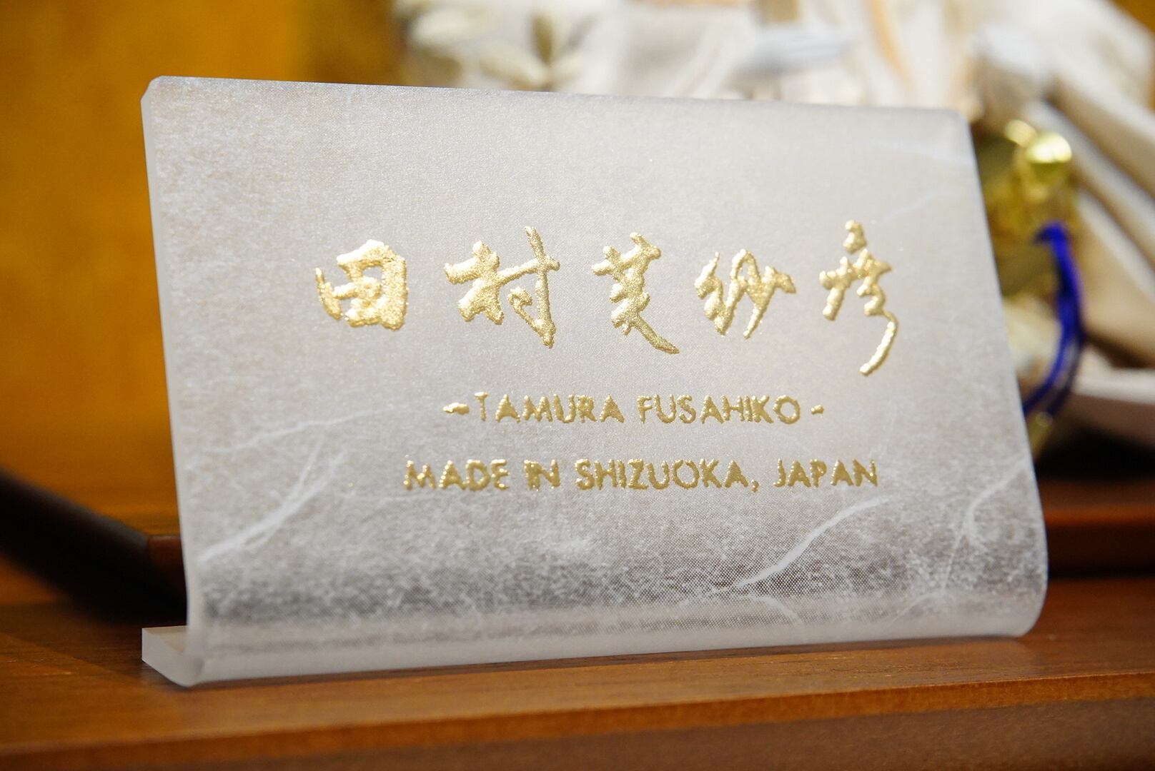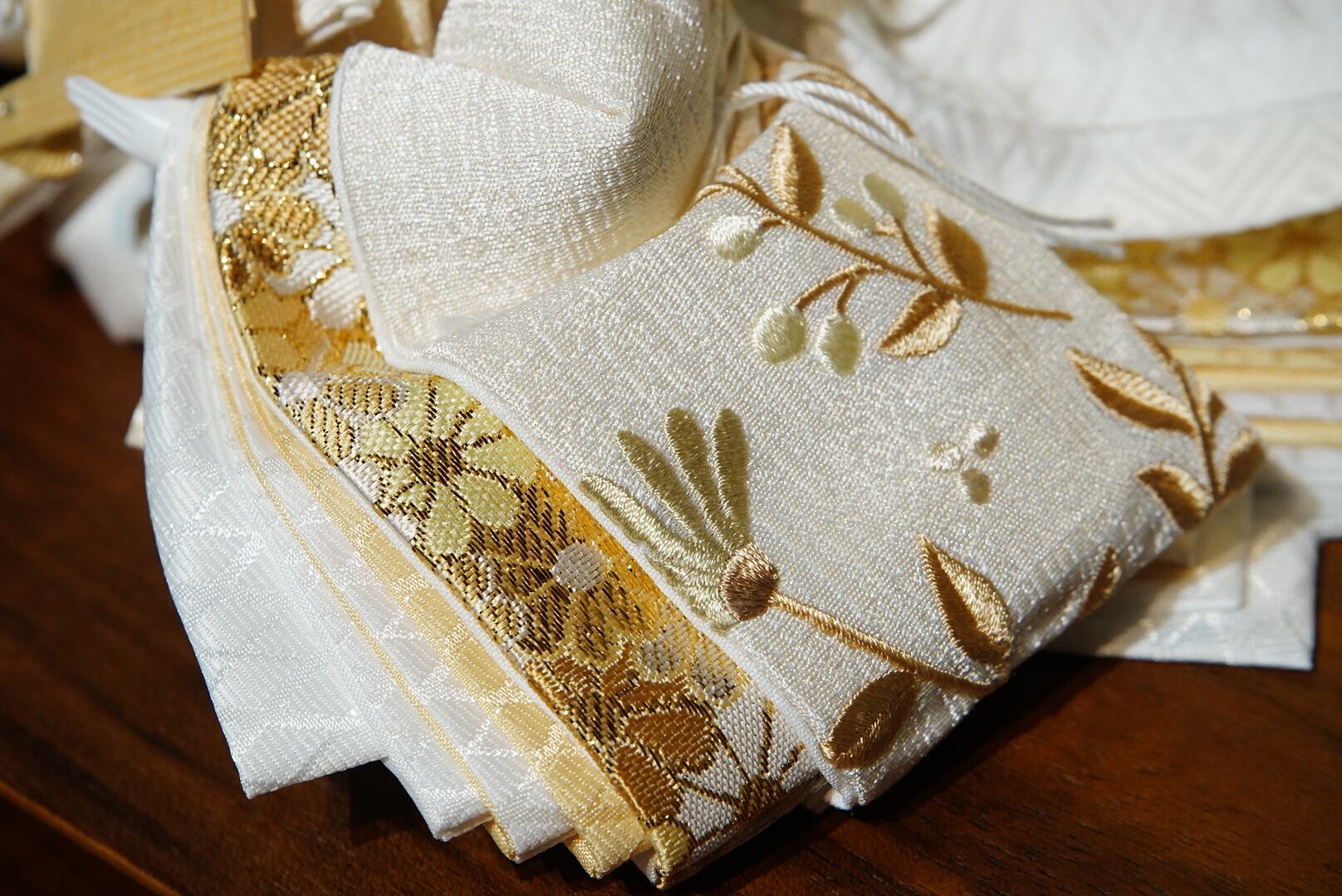 衣装は立体感のある仕立てで、落ち着きと品のある金糸の装飾が、全体に優雅な華やぎを添えています。