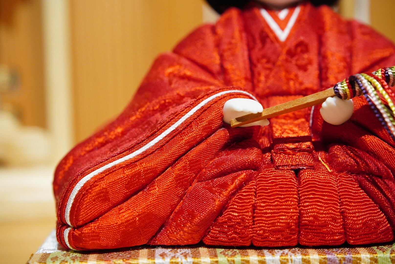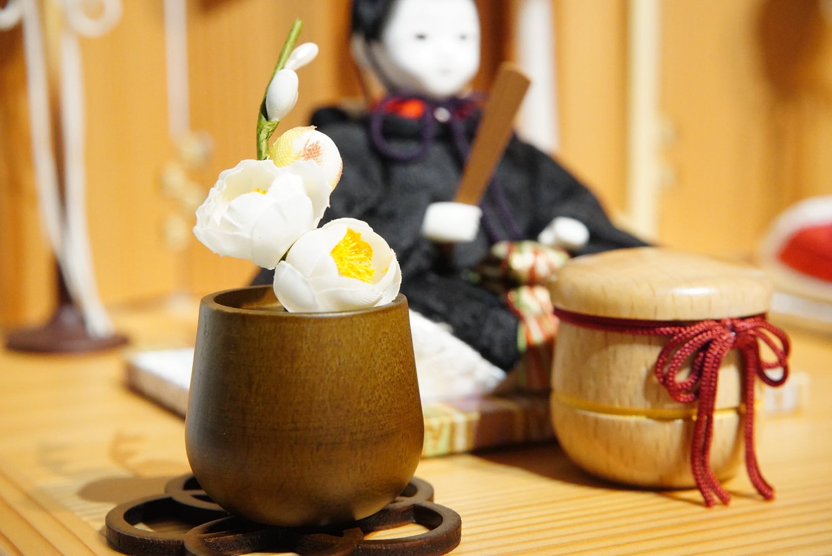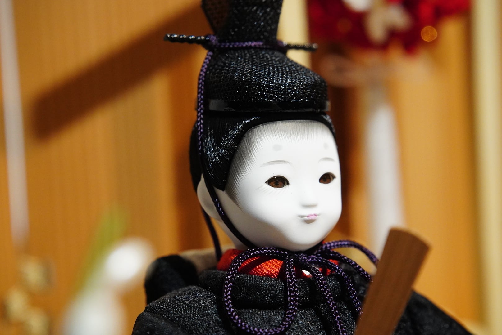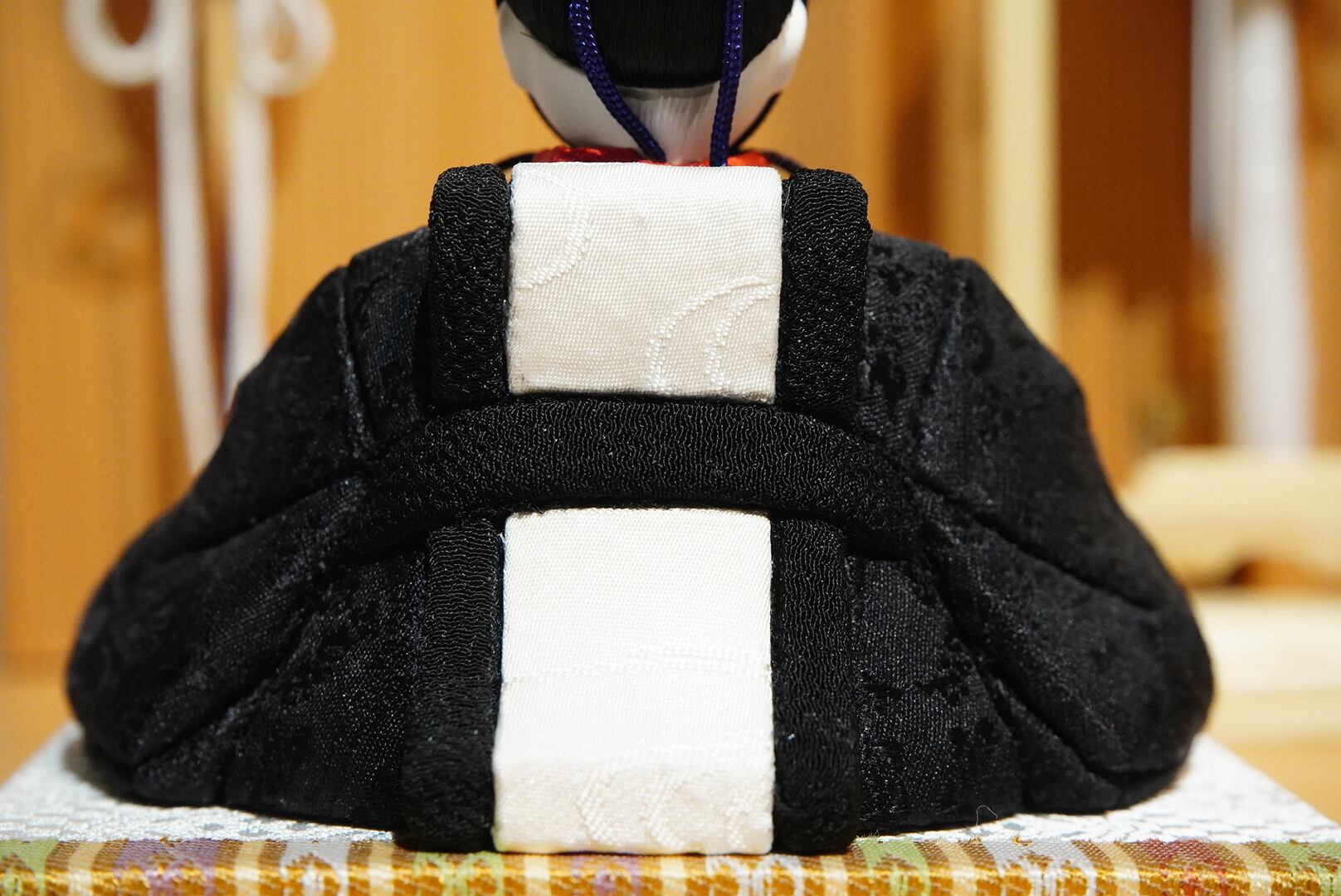 お内裏様は深みのある黒の衣をまとい、凛とした気品を漂わせ、お雛様は朱赤の衣裳に繊細な文様を施した華やかな姿で、お二人が並ぶ姿は格調高くも温かみのある佇まい。中央に飾られた紅白のつまみ細工の花が、全体をやさしく引き締めます。