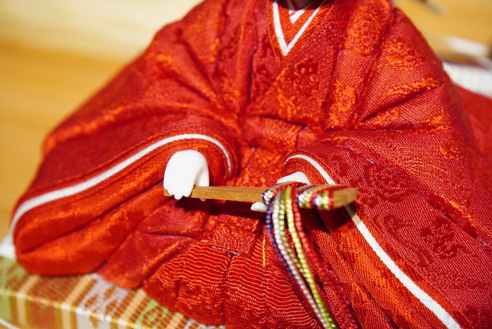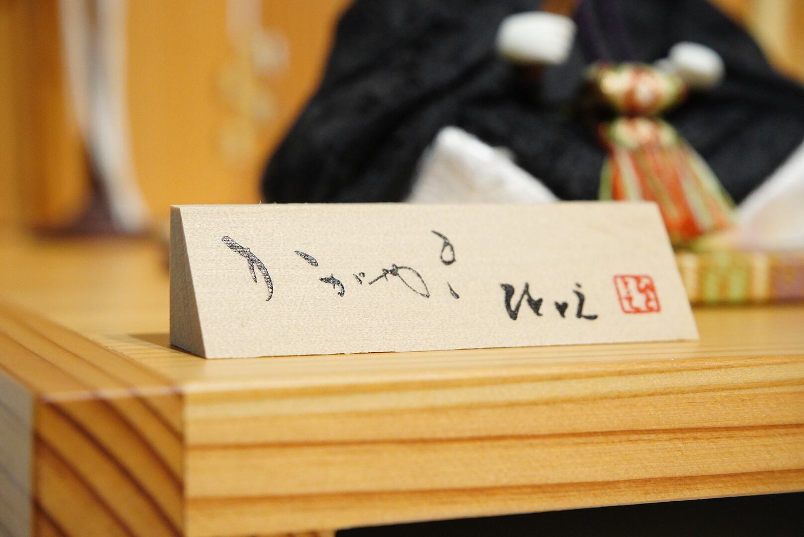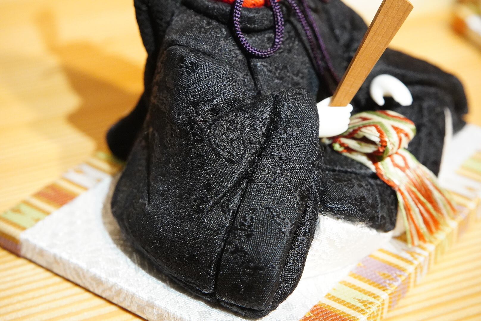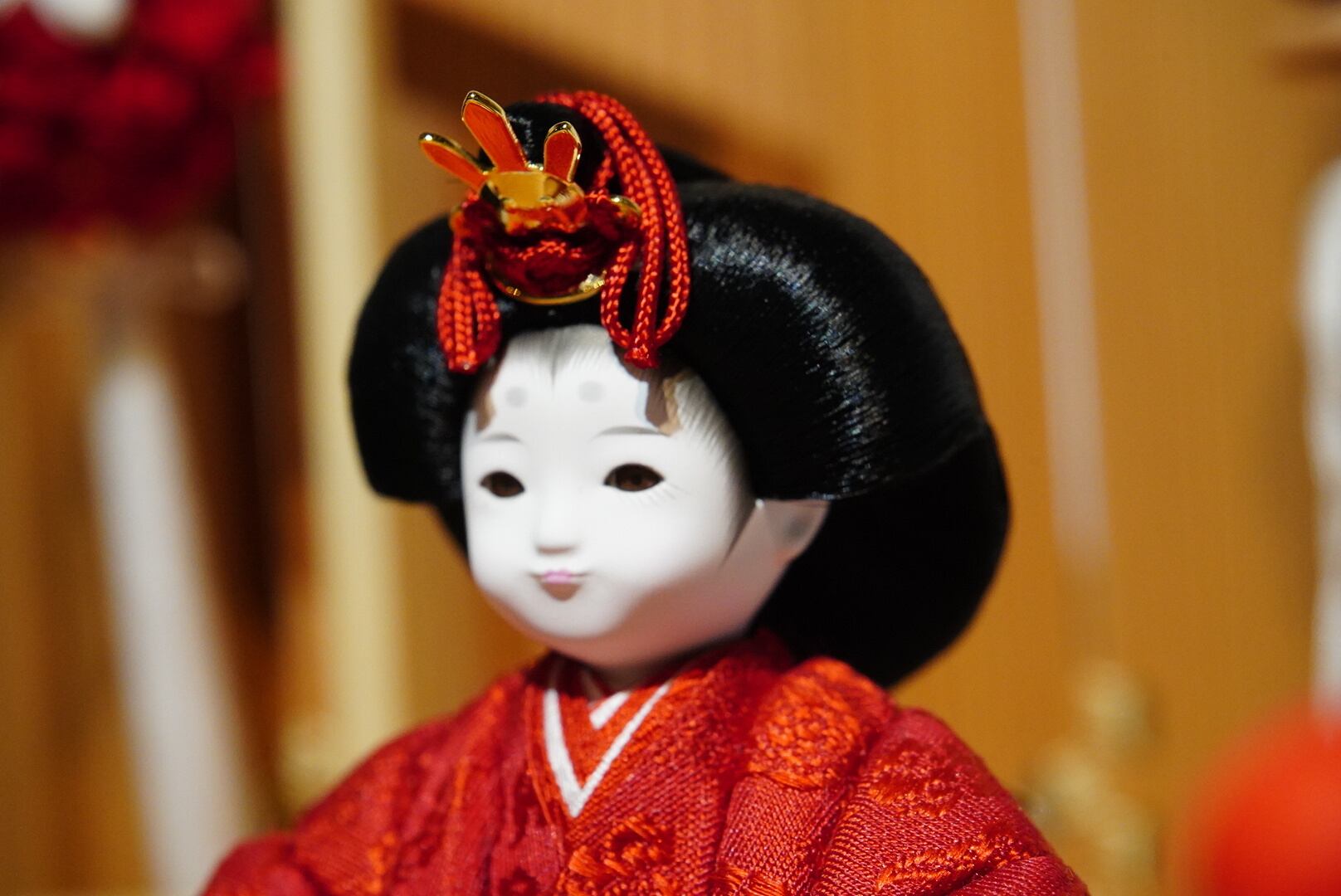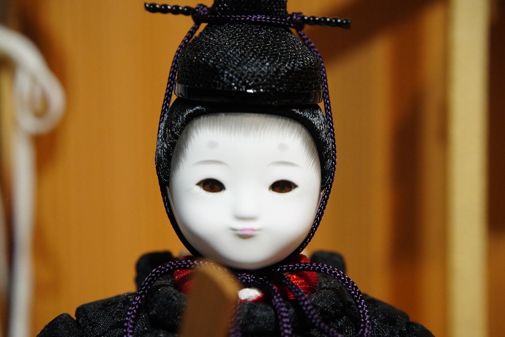 お内裏様は深みのある黒の衣をまとい、凛とした気品を漂わせ、お雛様は朱赤の衣裳に繊細な文様を施した華やかな姿で、お二人が並ぶ姿は格調高くも温かみのある佇まい。中央に飾られた紅白のつまみ細工の花が、全体をやさしく引き締めます。