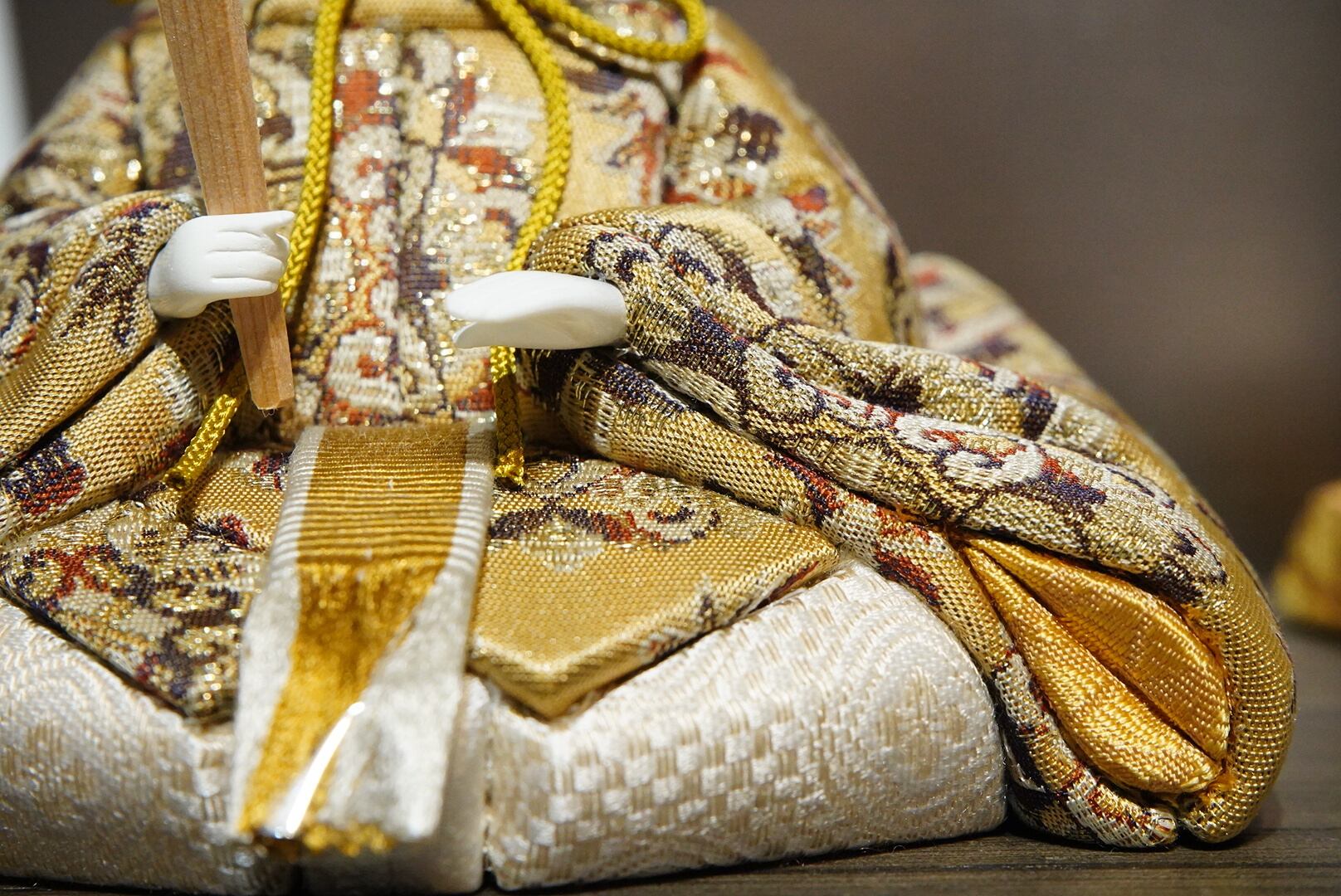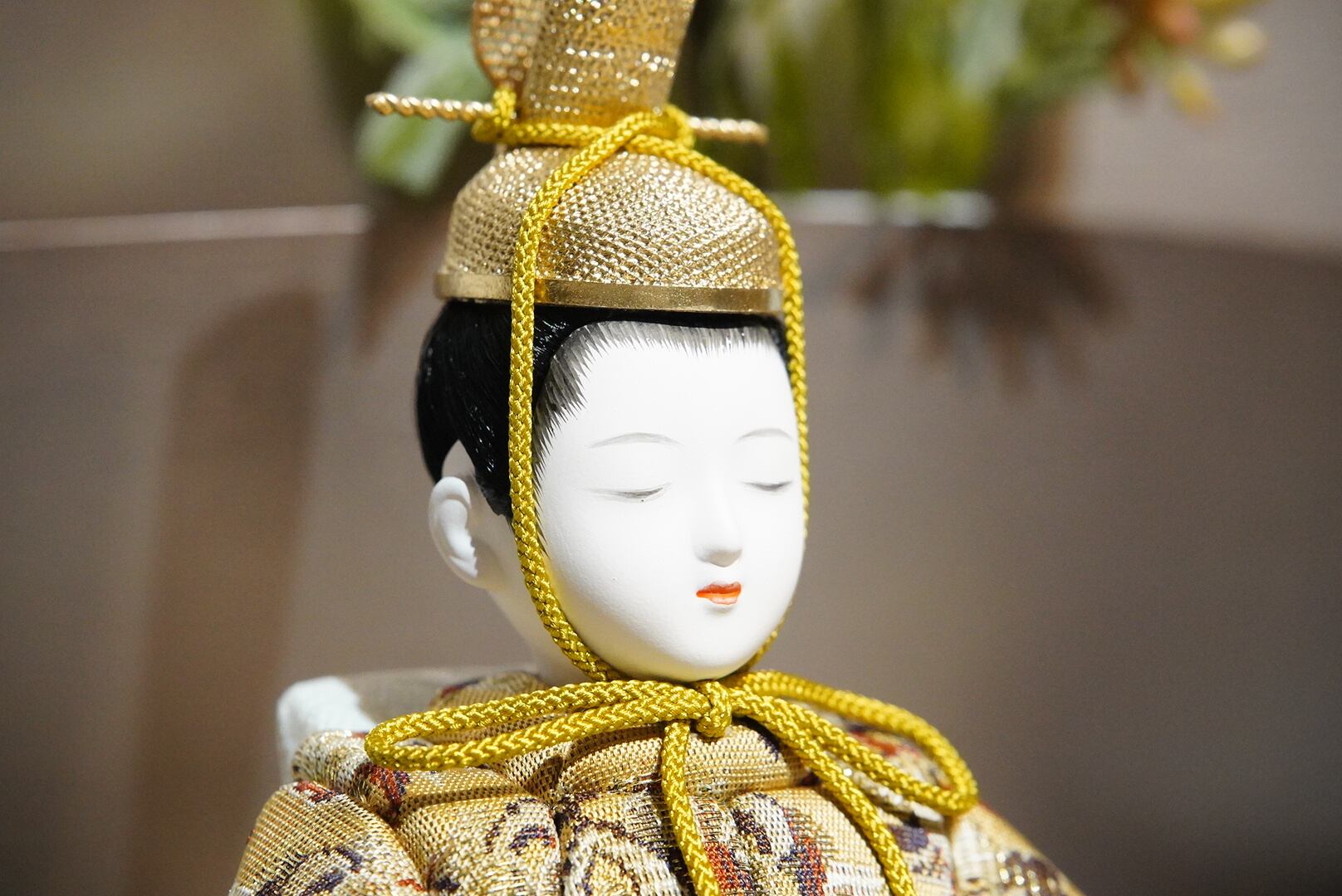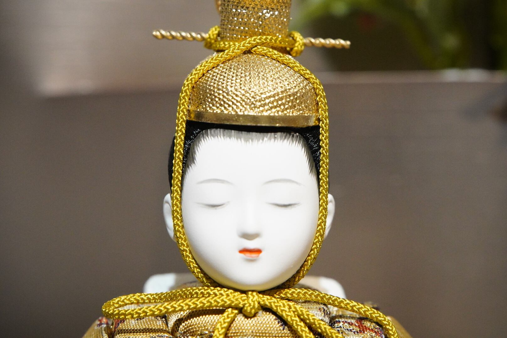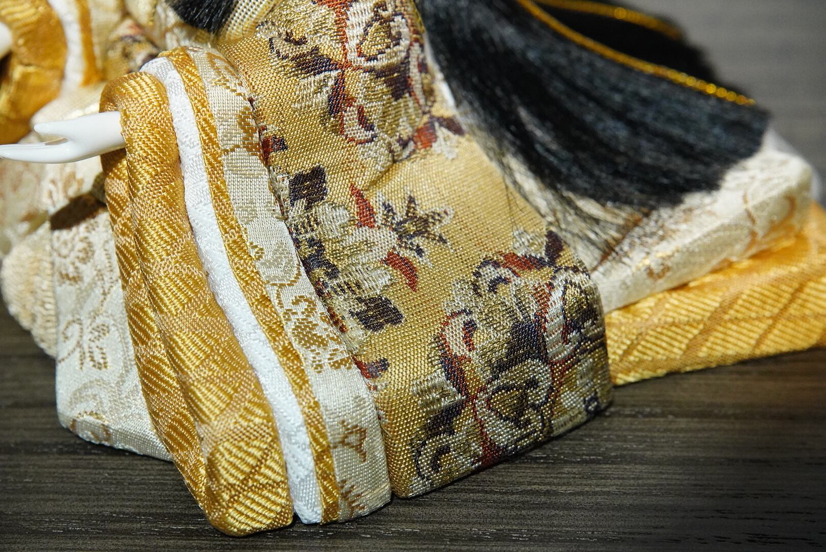 上品な金彩をまとったお内裏様とお雛様が、優雅に並ぶ親王飾り。細やかな織り模様が光をやわらかく受け止め、気品あふれる存在感を放ちます。