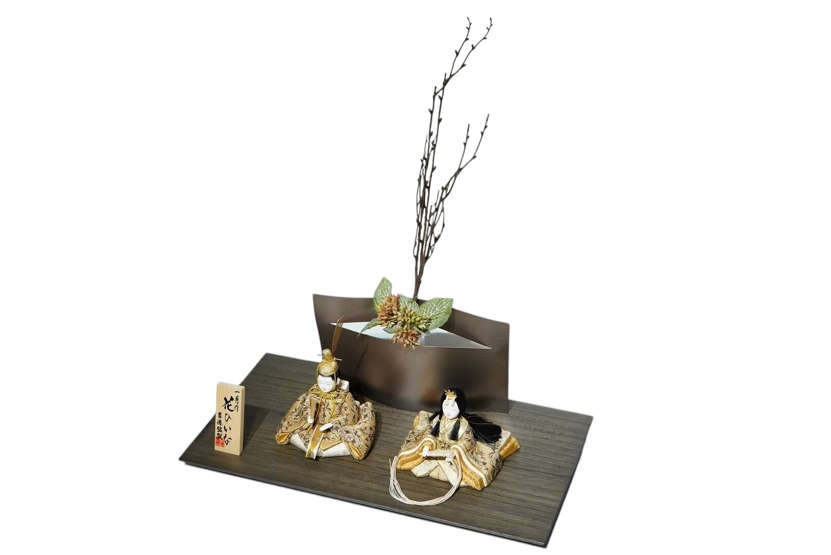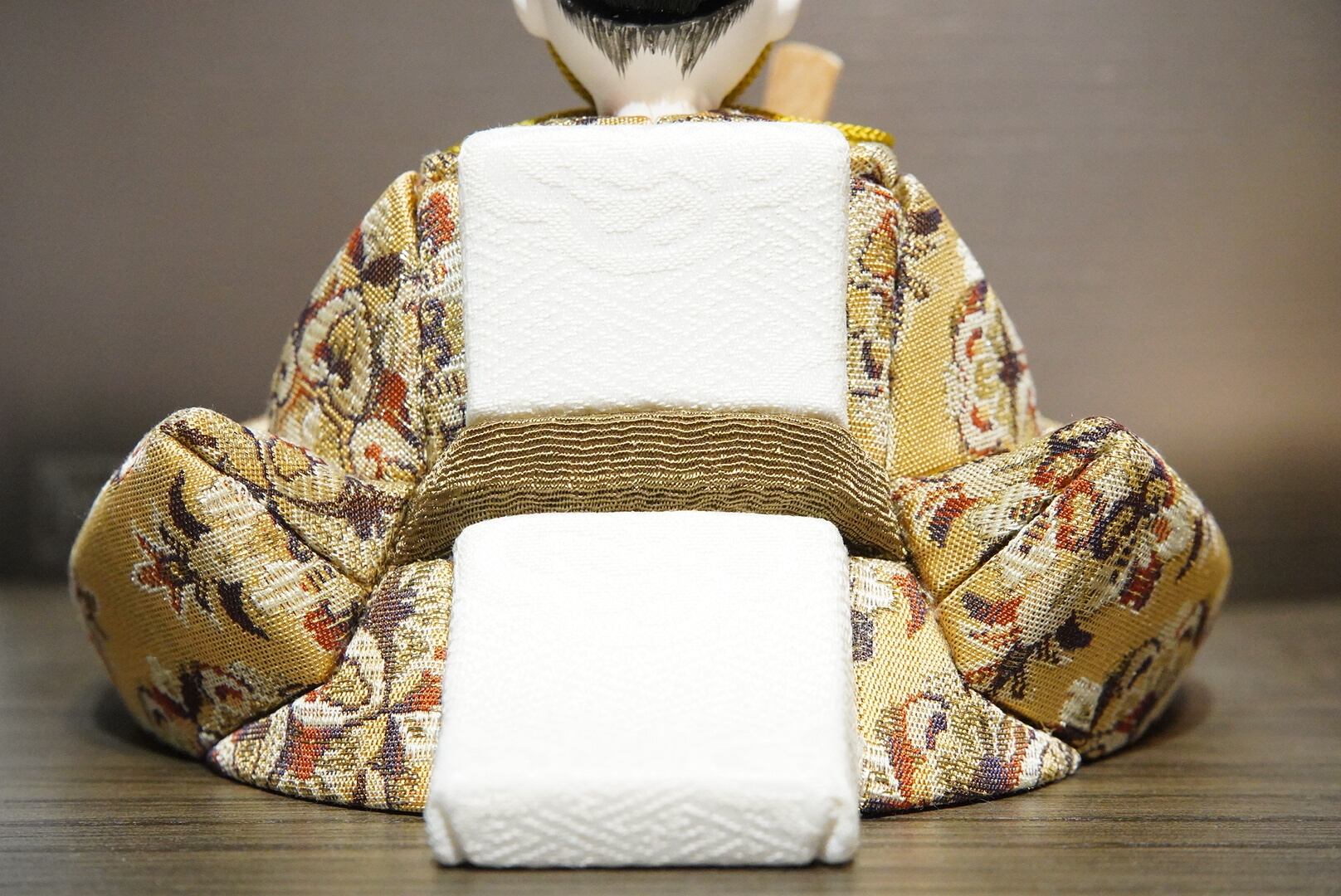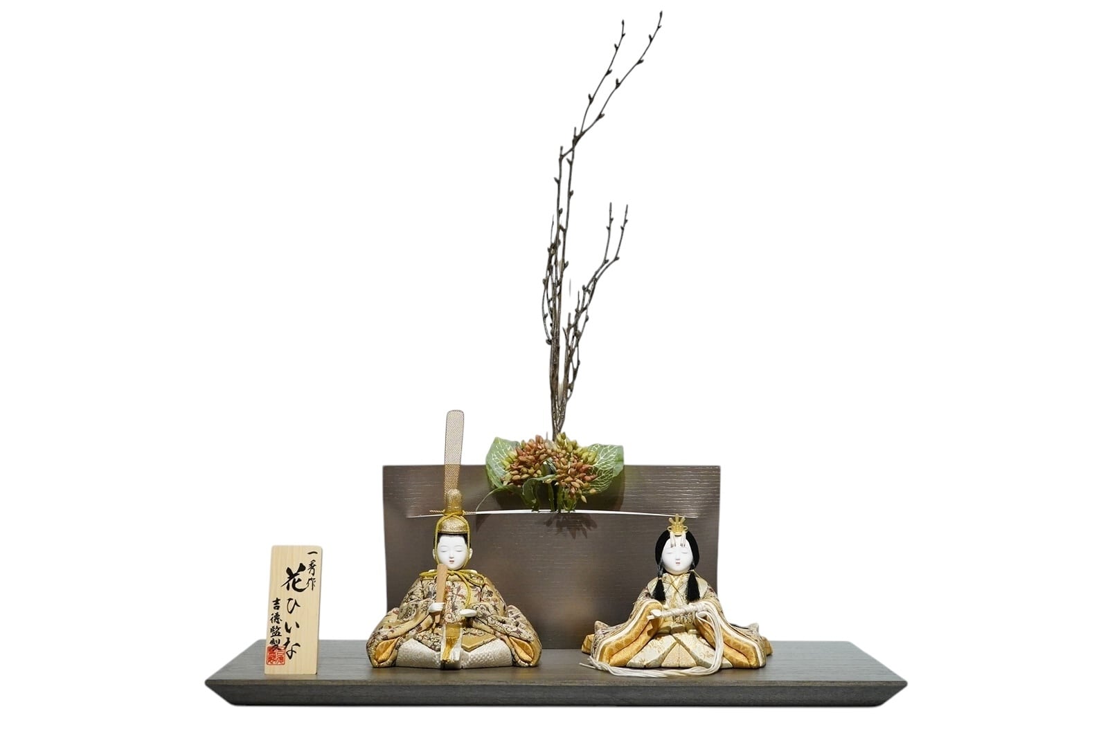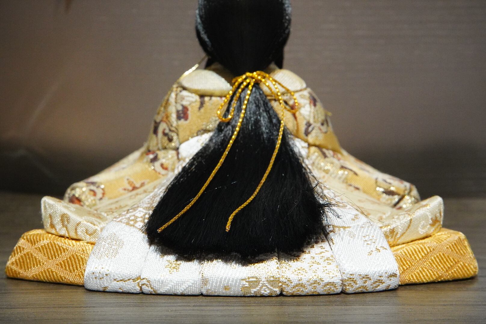 上品な金彩をまとったお内裏様とお雛様が、優雅に並ぶ親王飾り。細やかな織り模様が光をやわらかく受け止め、気品あふれる存在感を放ちます。