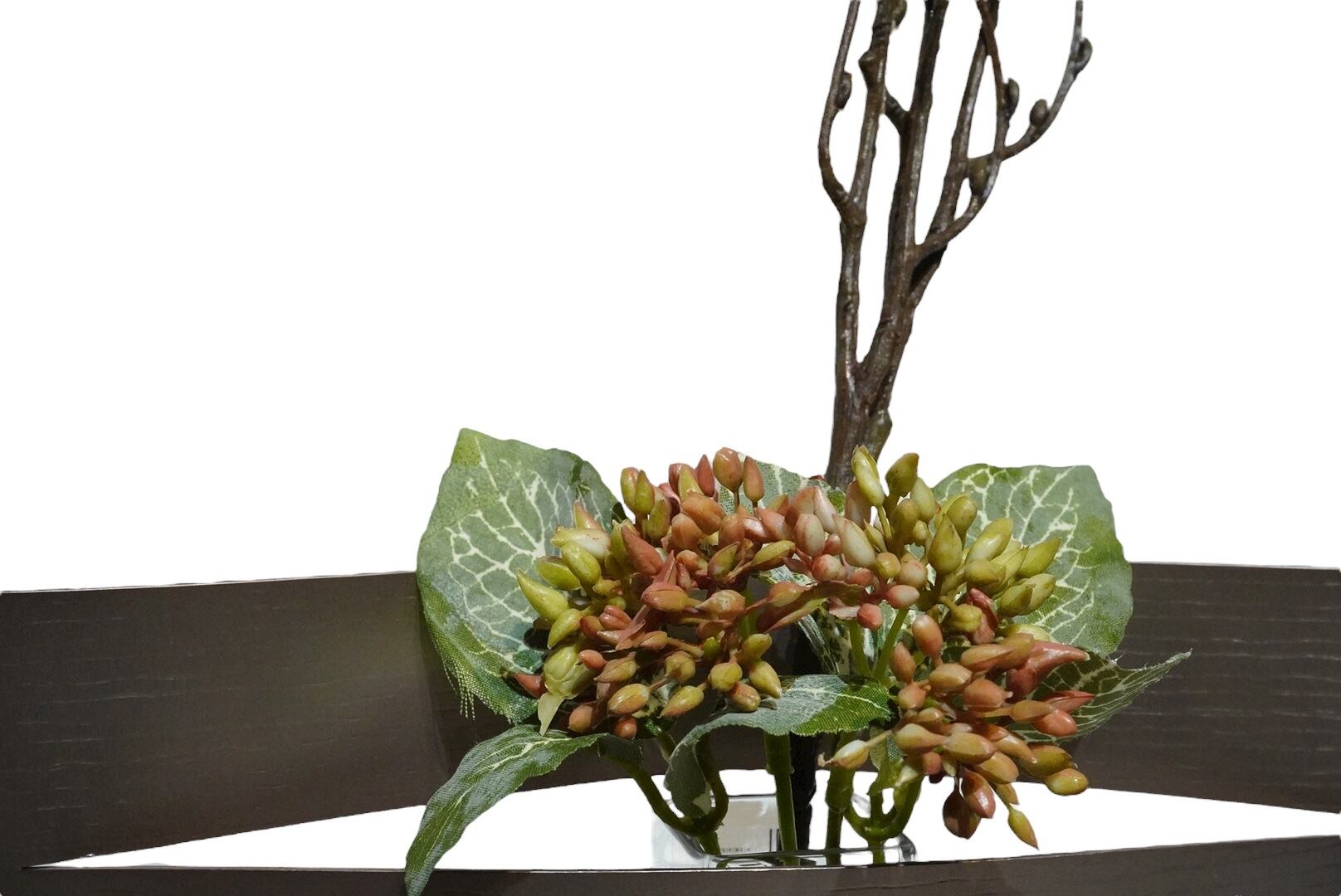 背景には枝ものを配した花飾りをあしらい、自然の美しさと調和する静謐な雰囲気を演出。落ち着いたグレートーンの台座と屏風が、金の衣裳を一層引き立て、モダンで上質な佇まいを生み出しています。
