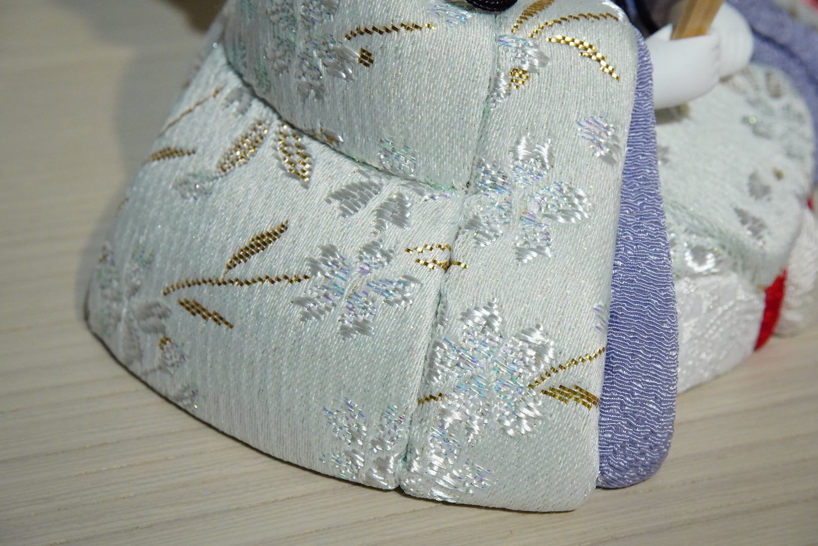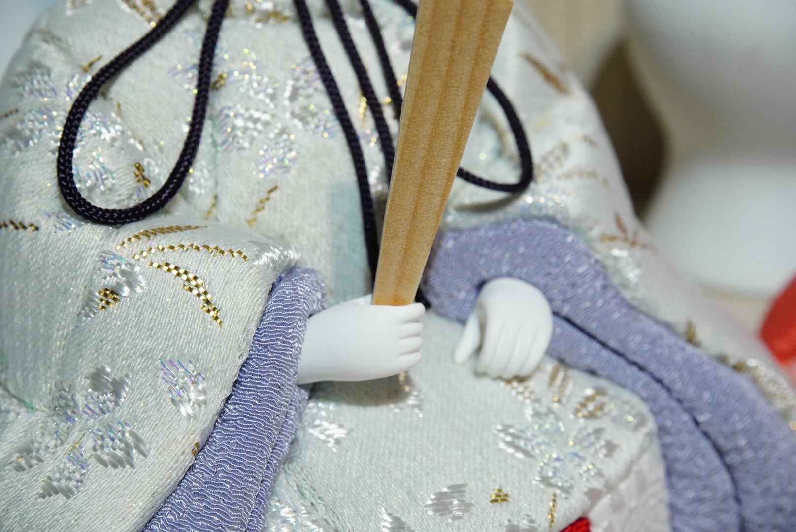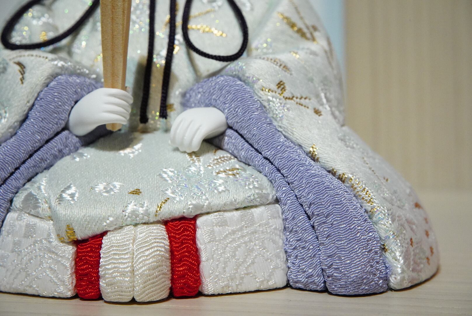 お内裏様は白銀の衣に薄紫の差し色を添えて凛とした佇まいを見せ、お雛様は紅を基調とした華やかな重ねで優雅さを演出。控えめながらも存在感のあるデザインが、現代の住空間にも自然に調和します。