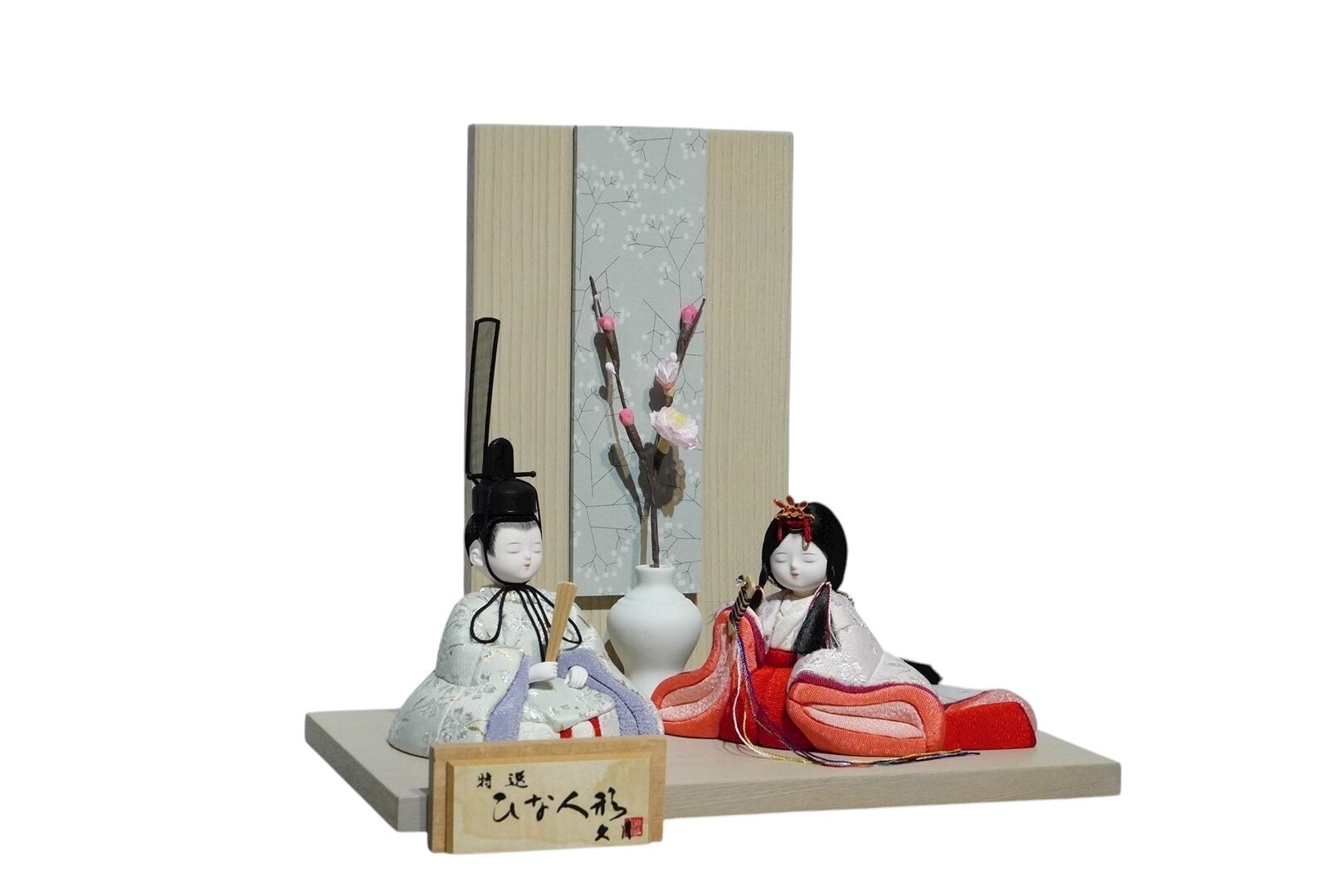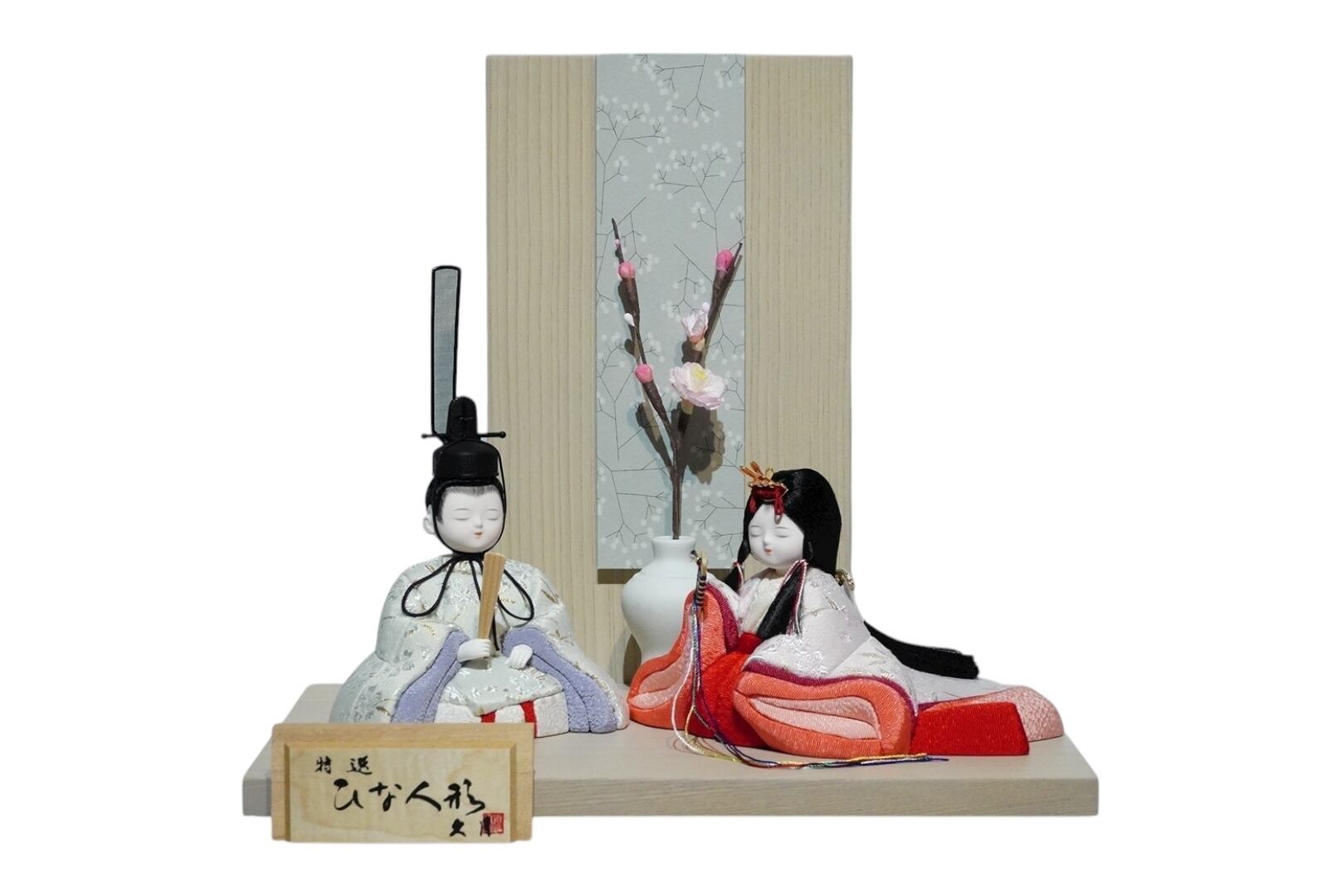 淡い木目の台と屏風に、そっと春の息吹を感じさせる梅の花が咲く上品なひな飾り。お内裏様とお雛様は、やわらかな色調の衣裳に包まれ、穏やかな表情で寄り添います。