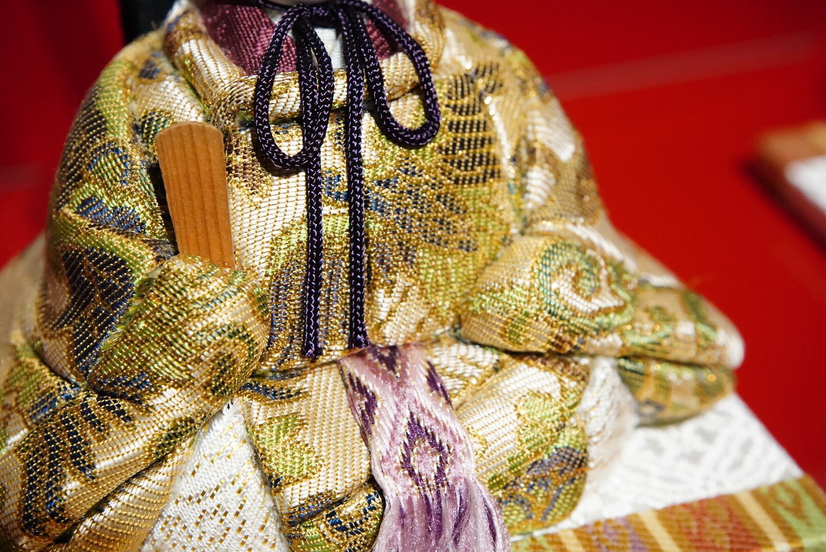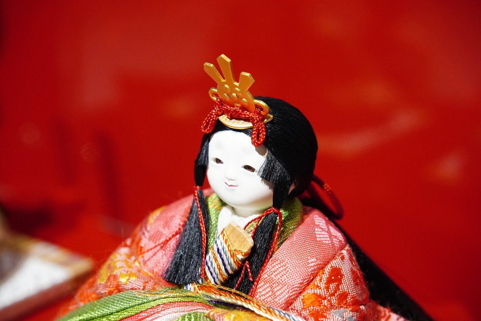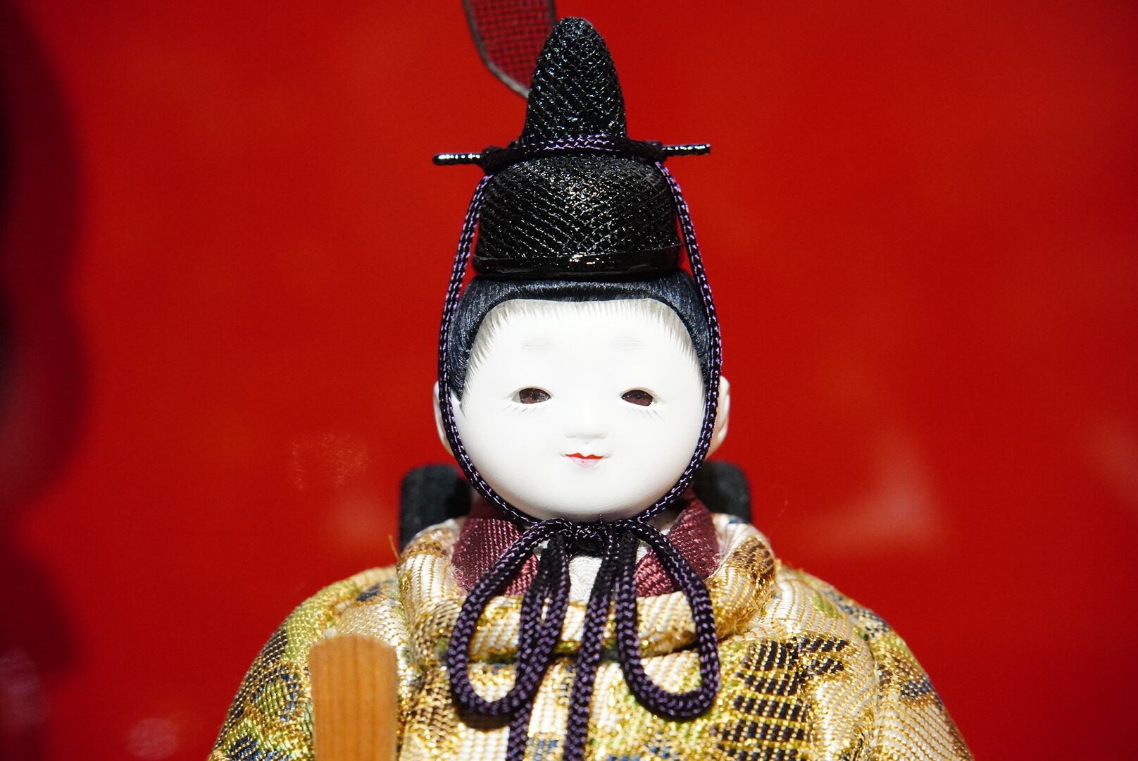 お内裏様は上品な金の装束に身を包み、凛とした佇まい。お雛様は優しい桃色と淡い緑を重ねた衣装で、華やかさの中にも落ち着きを感じさせます。三人官女は白と朱の可憐な姿で、全体にあどけない愛らしさを添えています。