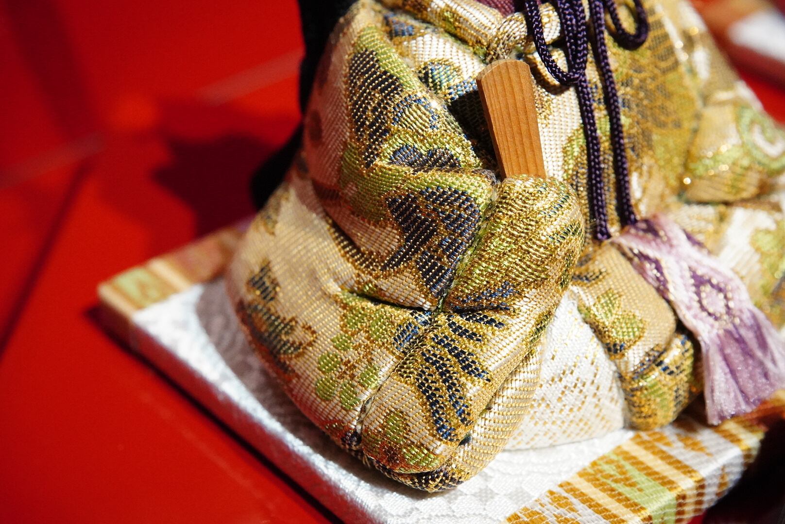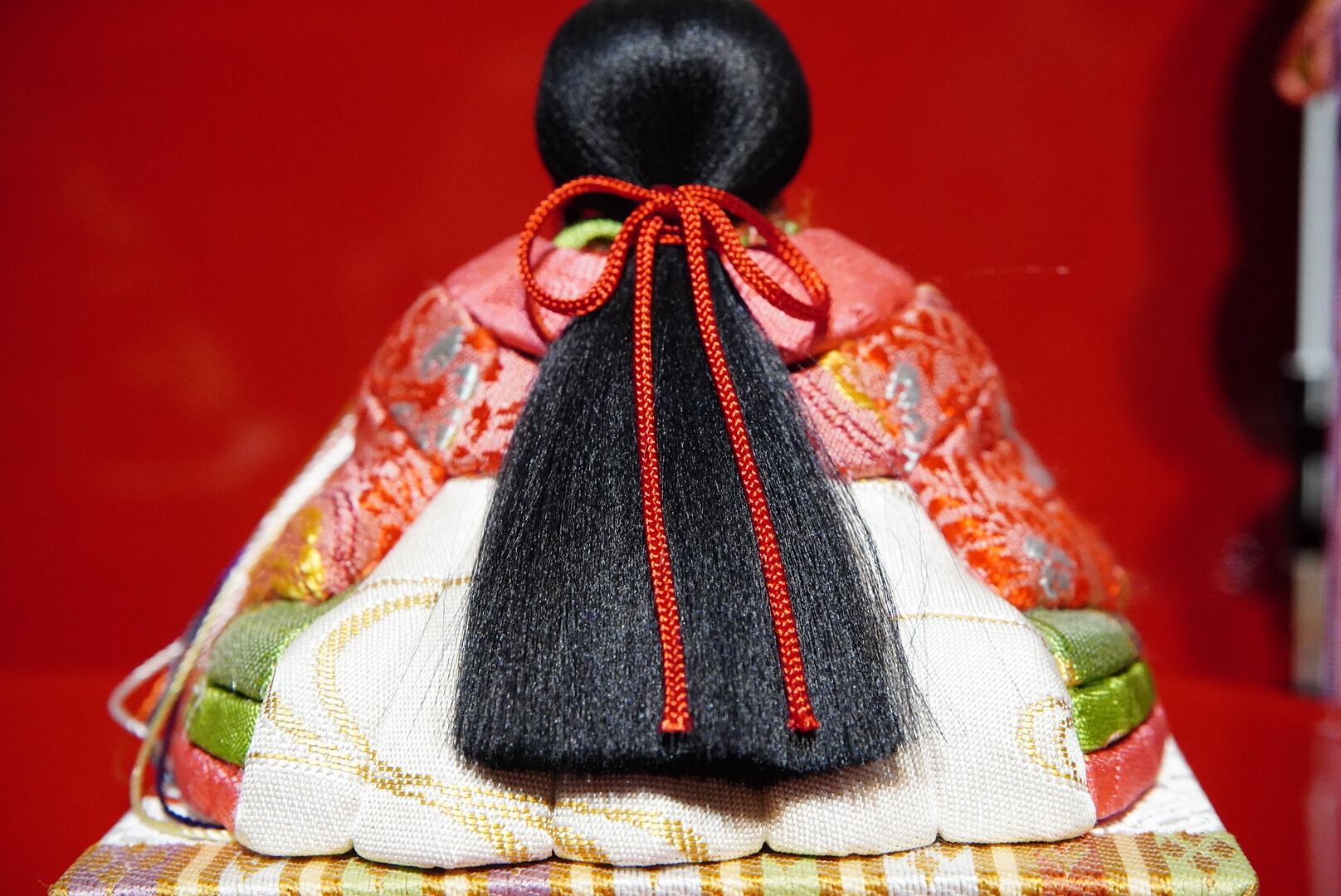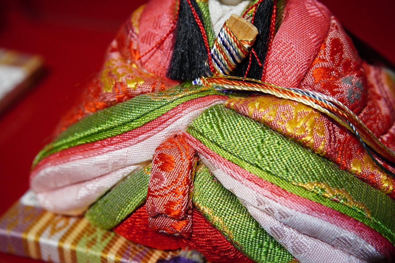 お内裏様は上品な金の装束に身を包み、凛とした佇まい。お雛様は優しい桃色と淡い緑を重ねた衣装で、華やかさの中にも落ち着きを感じさせます。三人官女は白と朱の可憐な姿で、全体にあどけない愛らしさを添えています。