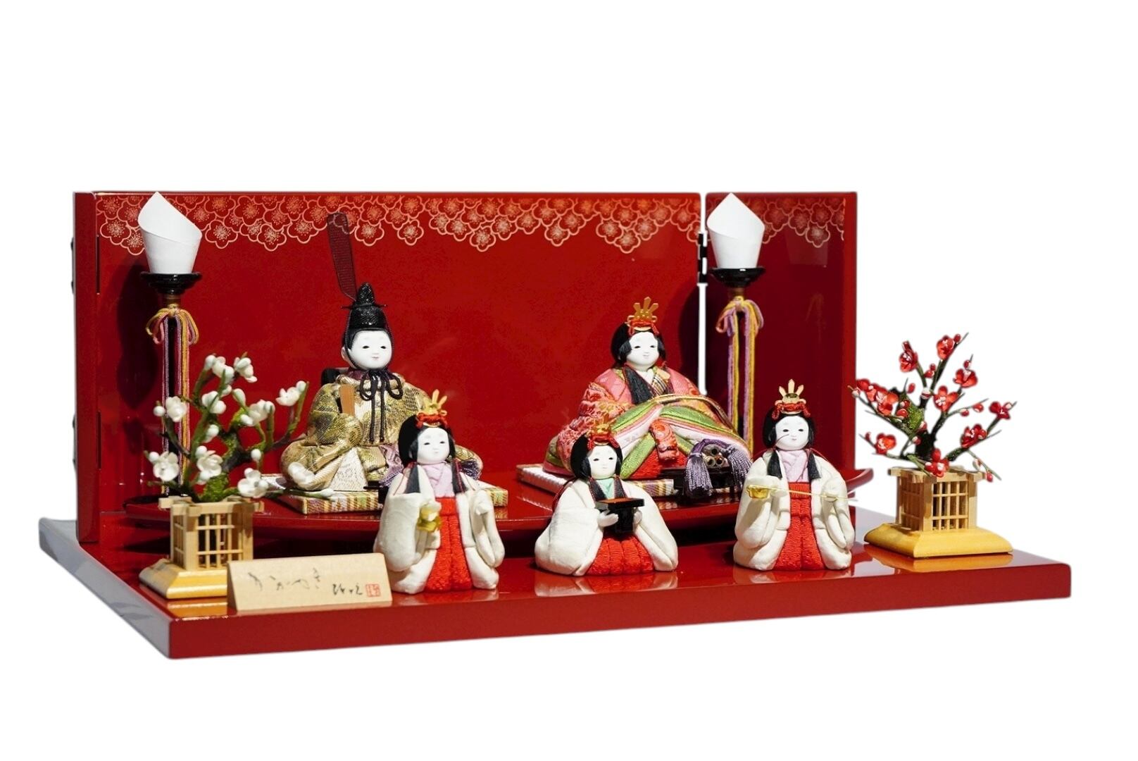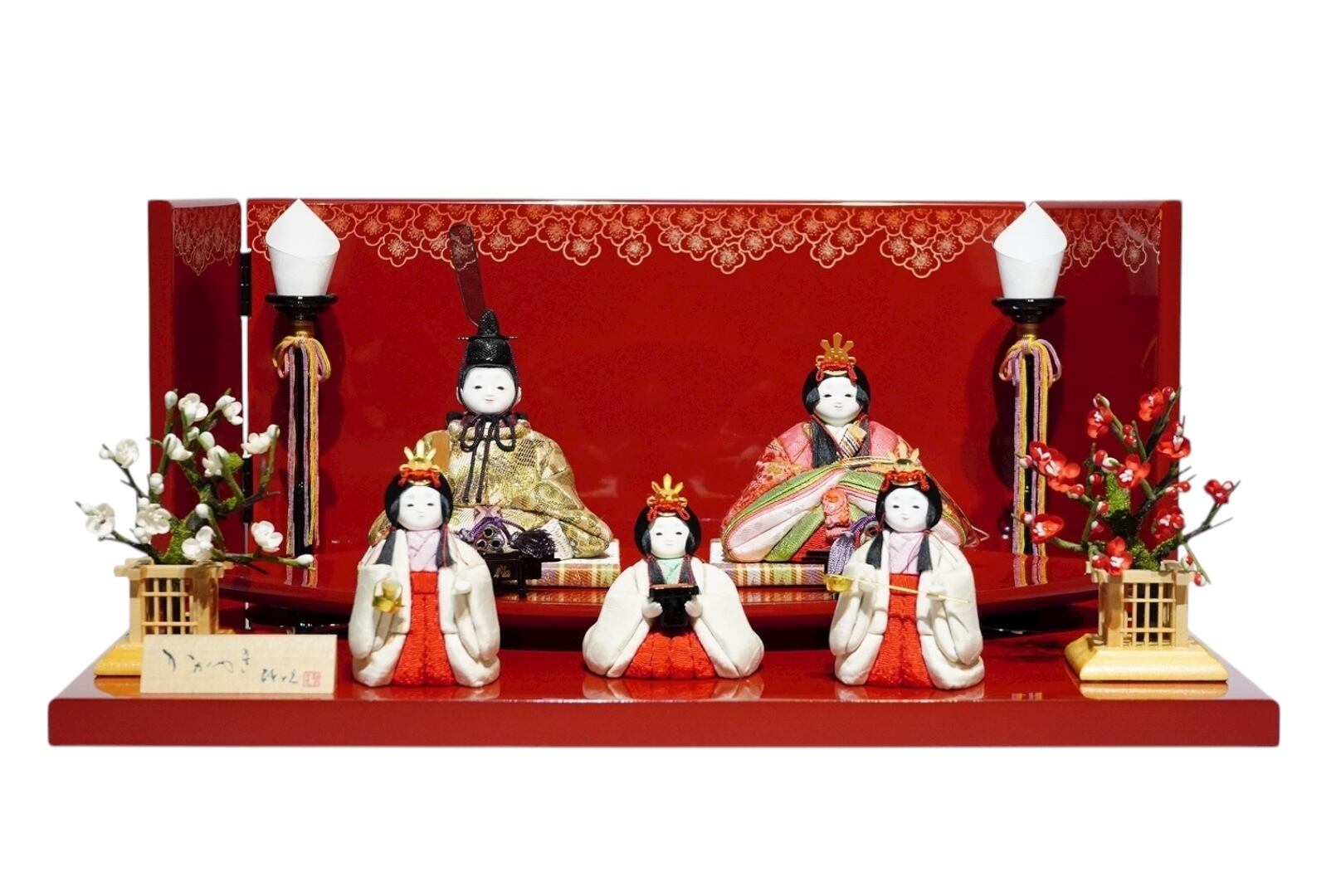 華やかな朱赤の台と屏風が目を惹く、格調高い五人飾り。漆調の艶やかな赤に、繊細な金彩の文様が映え、まるで春の光を纏ったような気品あふれるひな飾りです。