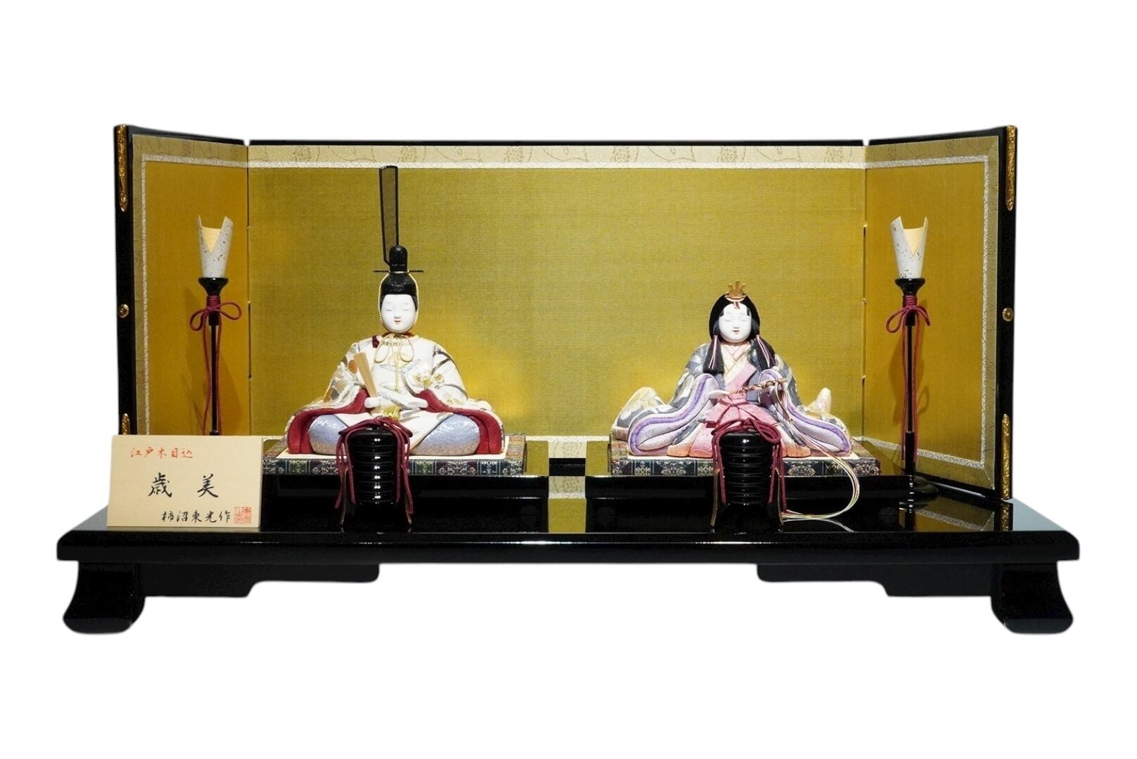 気品あふれる金屏風に、端正な佇まいの親王が寄り添う、格調高い江戸木目込人形飾りです。